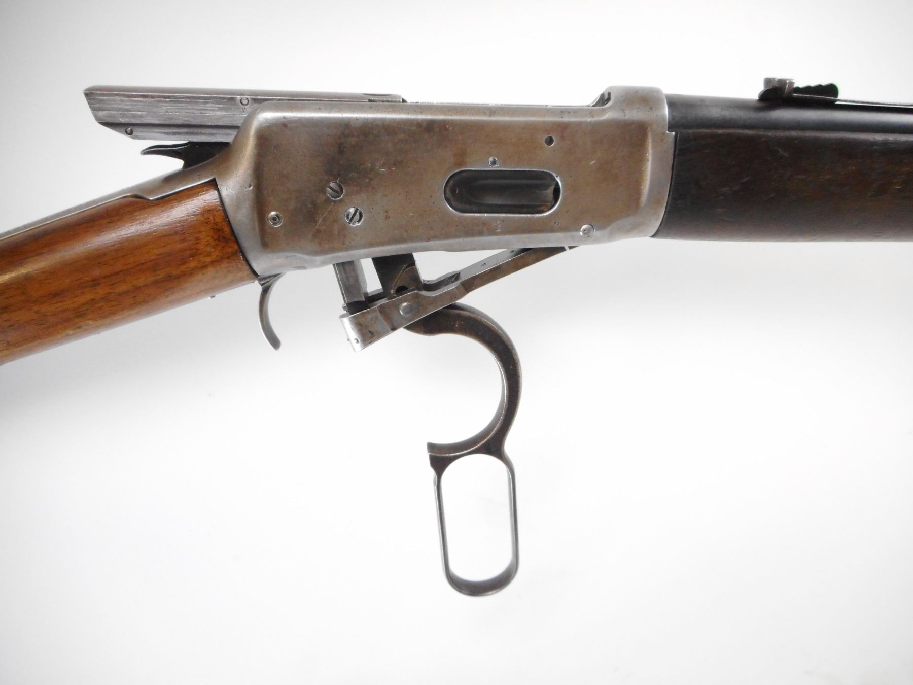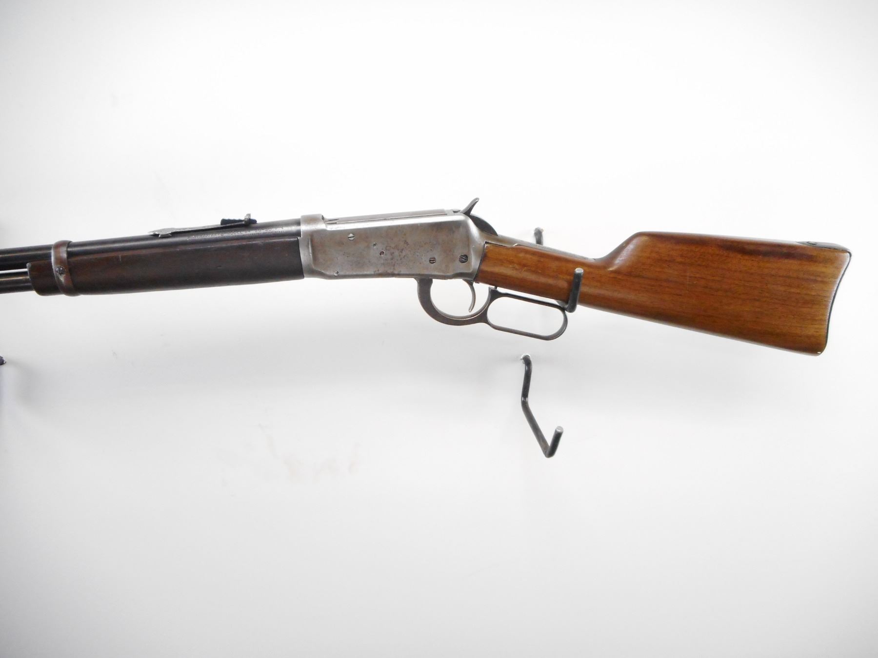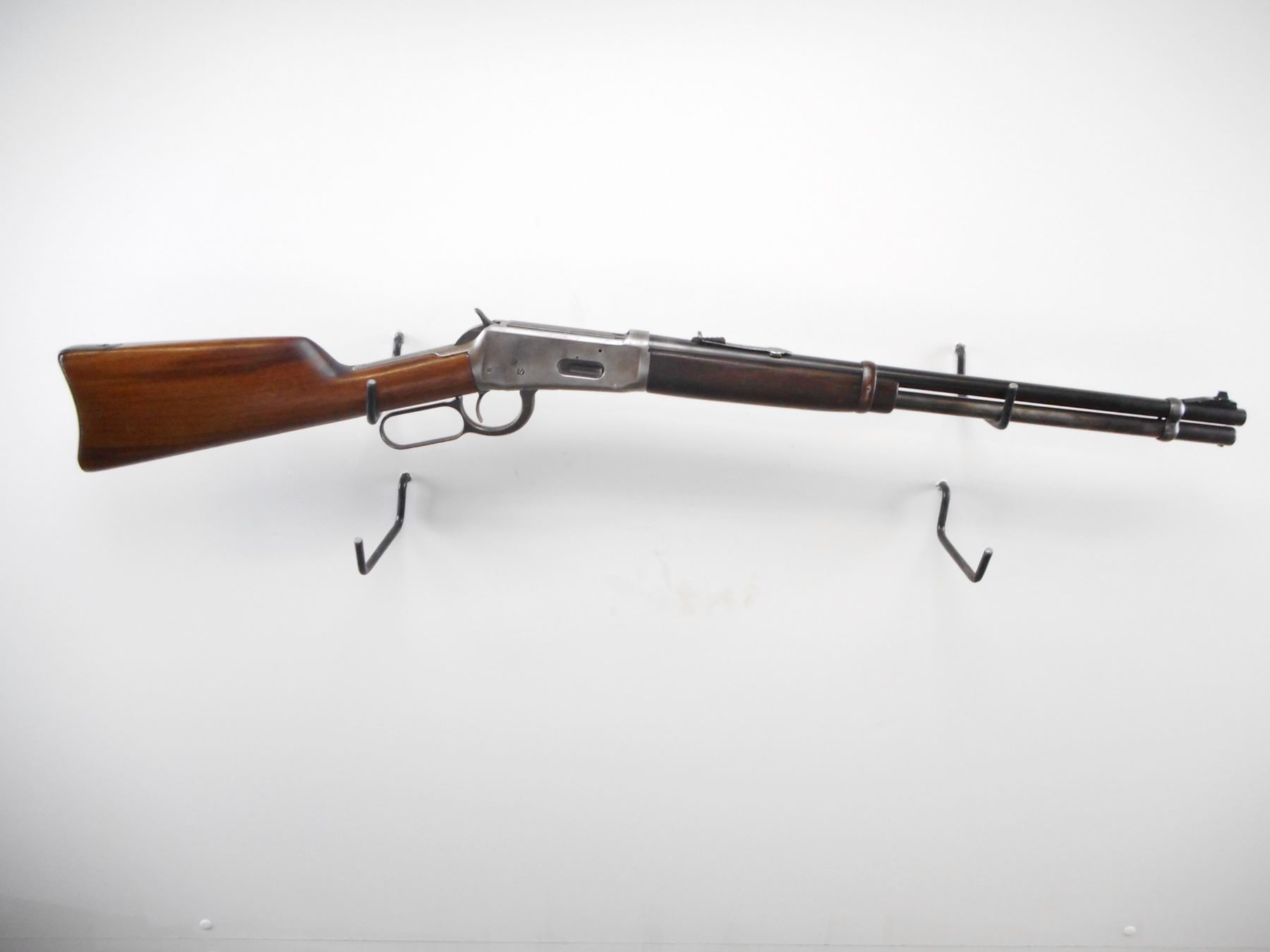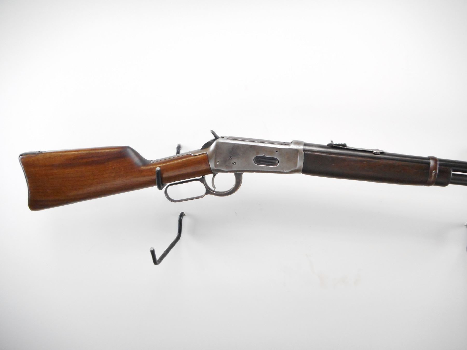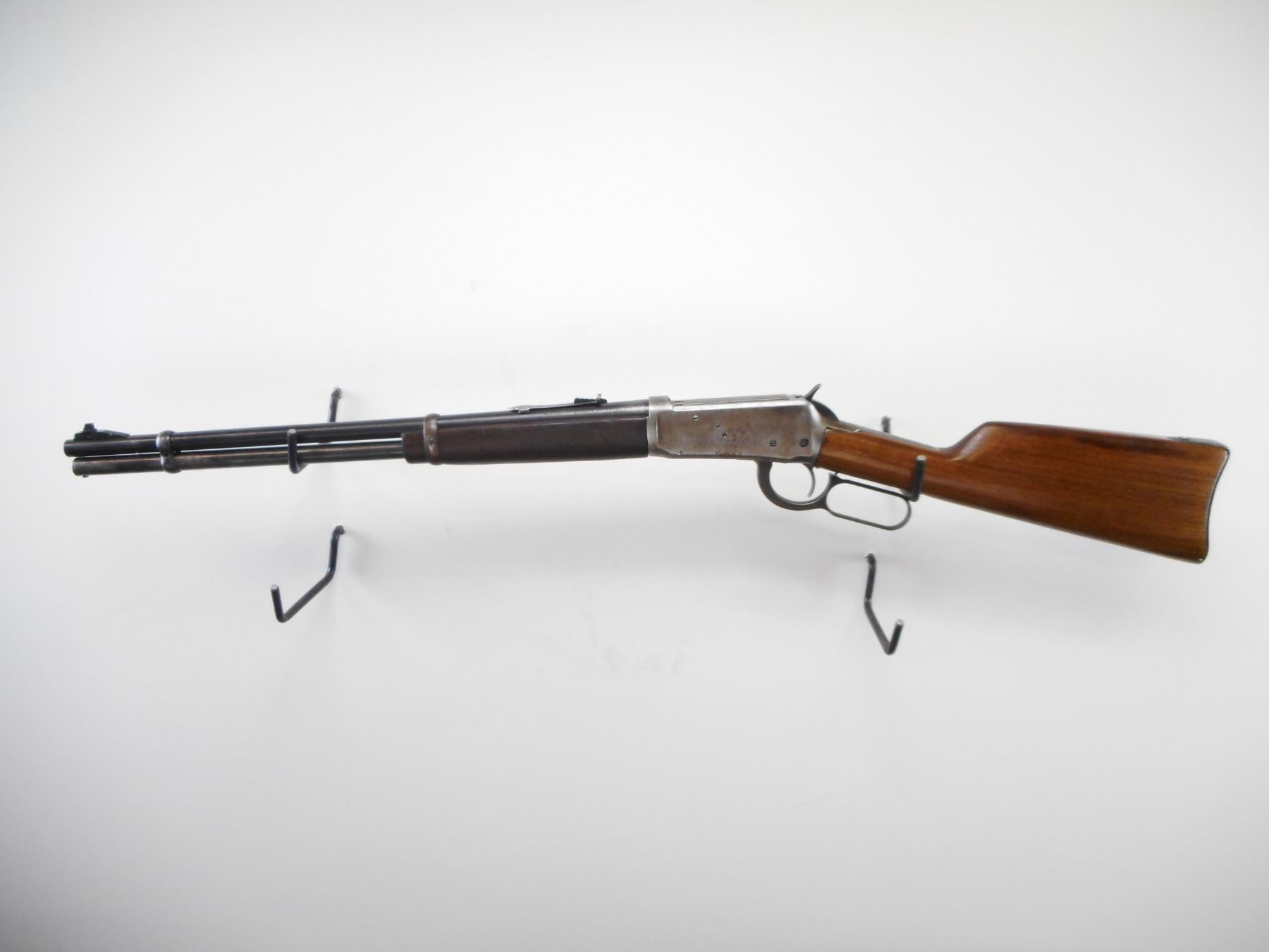 WINCHESTER , MODEL: 1894 , CALIBER: 30-30 , BORE IS GOOD. BLADE FRONT SIGHT WITH RAMP. U NOTCH ADJUSTABLE REAR SIGHT. FULL LENGTH MAG TUBE. MISSING SPRING AND FRONT SCREW. TANG DRILLED AND TAPPED. SMOOTH TWO PIECE WOOD STOCKS. CURVED STEEL BUTT PLATE. LEFTER STICKS. BLUEING SHOWS NUMEROUS HANDLING MARKS AND WEAR. RECEIVER SILVER/GREY. STOCK SHOWS NUMBEROUR HANDLING MARKS AND DINGS. , ACTION: LEVER ACTION RIFLE , BARREL LENGTH: 20" , SERIAL # 564322 , CONDITION: 5/10 , CLASS: CANADIAN NON RESTRICTED CLASS