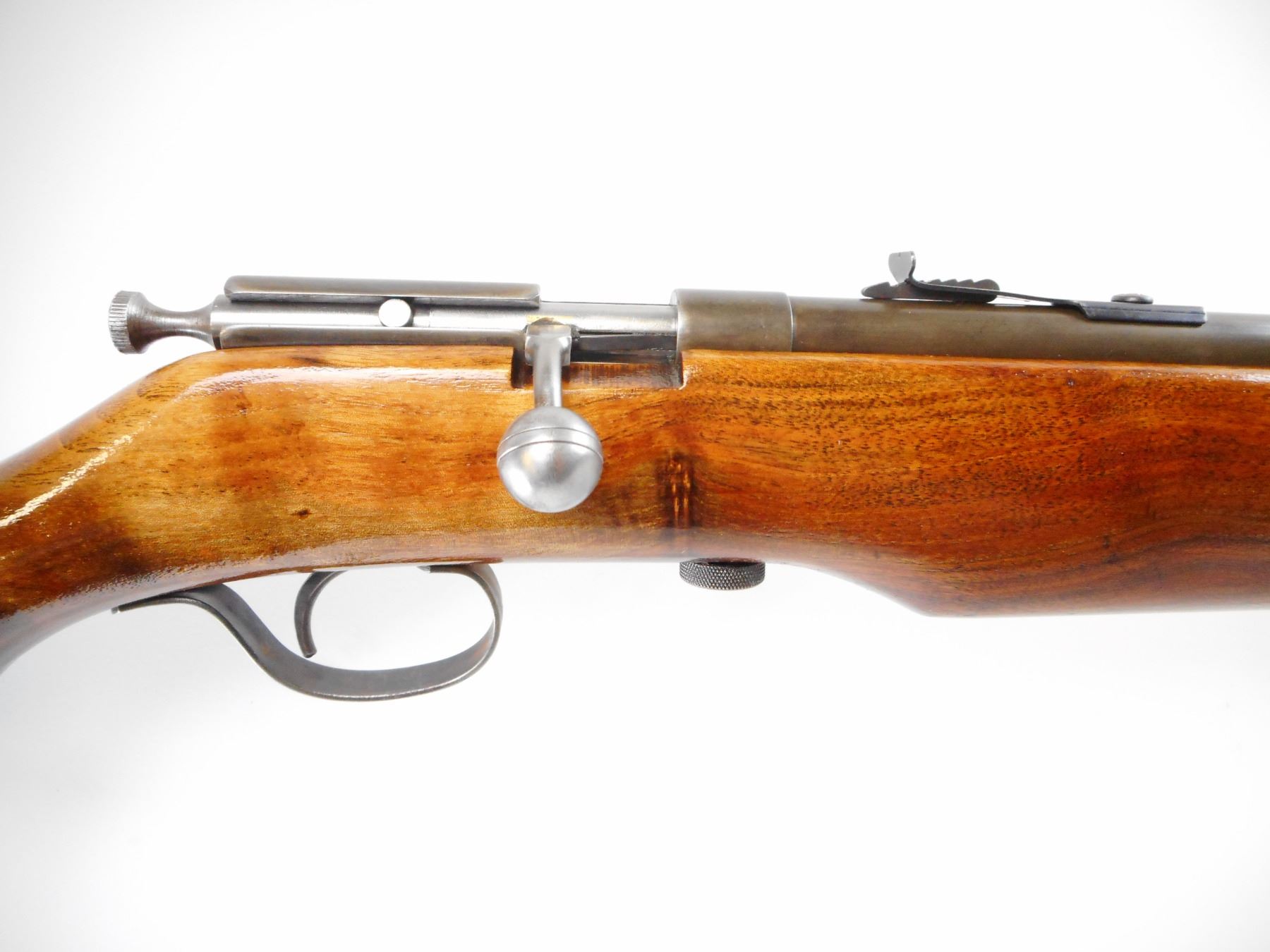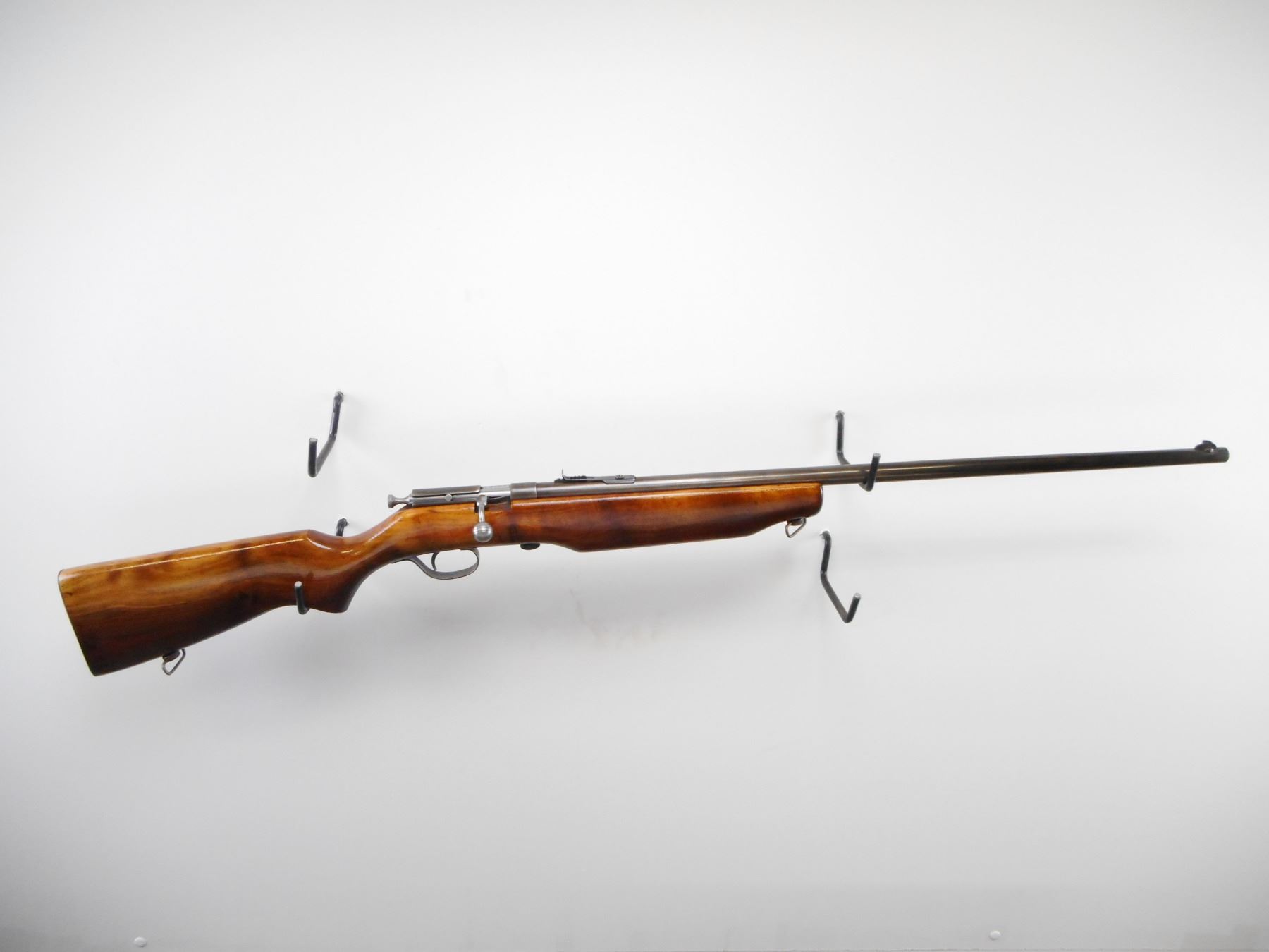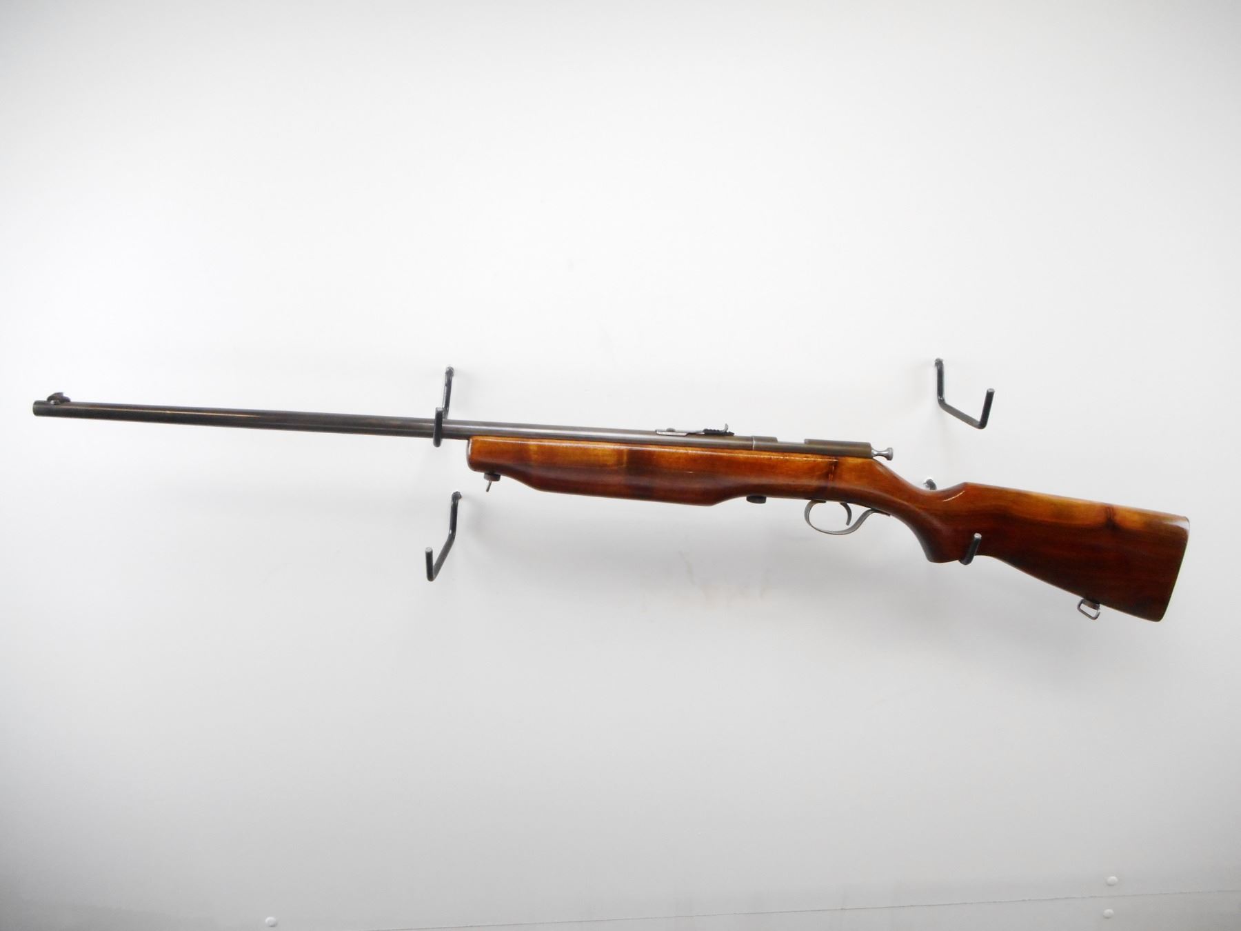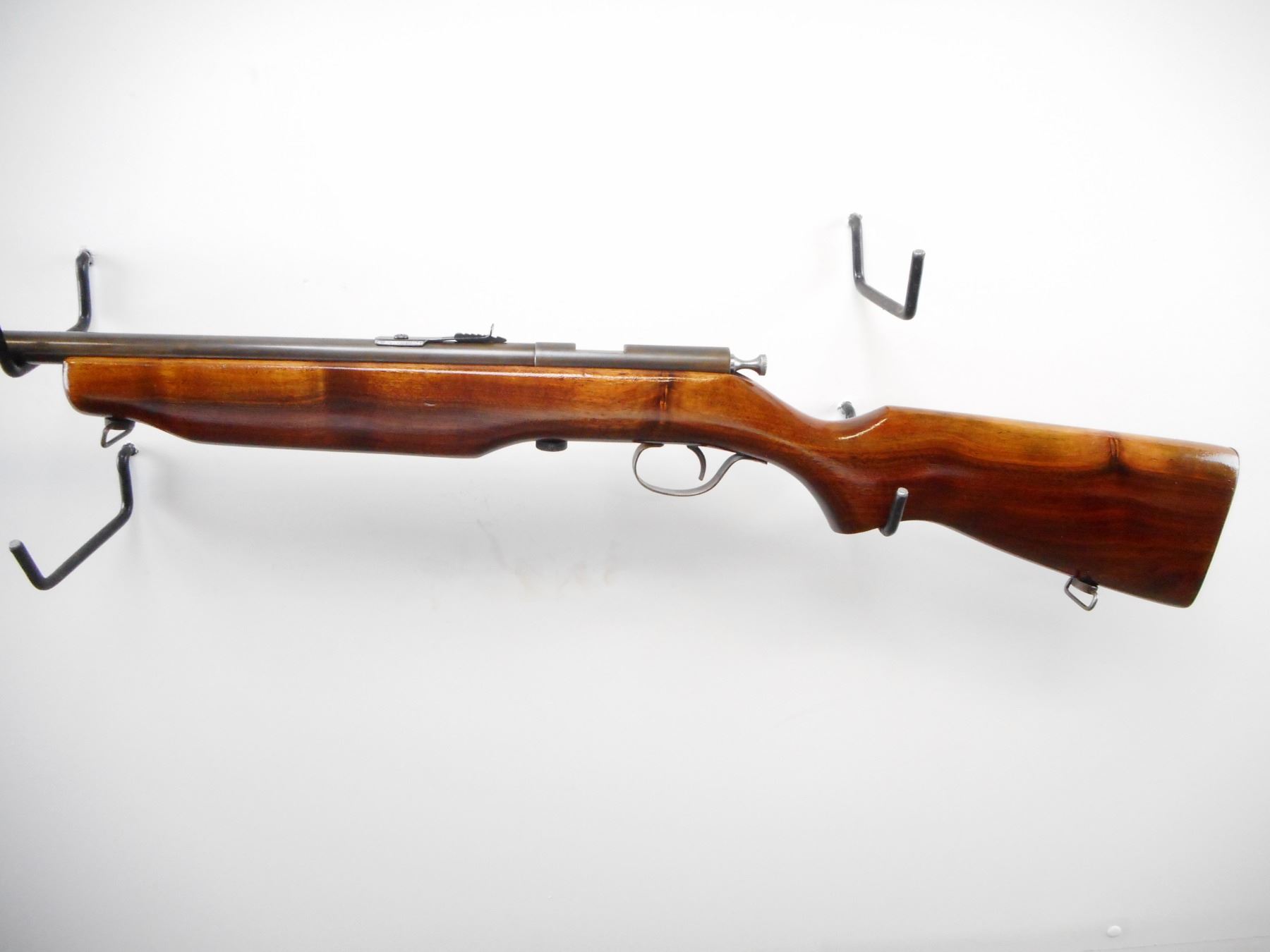 COOEY , MODEL: 75 , CALIBER: 22 LR , BORE IS VERY GOOD. BLADE FRONT SIGHT . U NOTCH REAR SIGHT. SMOOTH ONE PIECE WOOD STOCK. SMOOTH STEEL BUTT PLATE. SLING SWIVELS. BLUEING TURNED SILVER/GREY. SHOWS HANDLING MARKS. STOCK SHOWS DING SCRATCHES AND HANDLING MARKS. , ACTION: BOLT ACTION RIFLE , BARREL LENGTH: 27" , SERIAL # N/A , CONDITION: 6/10 , CLASS: CANADIAN NON RESTRICTED CLASS