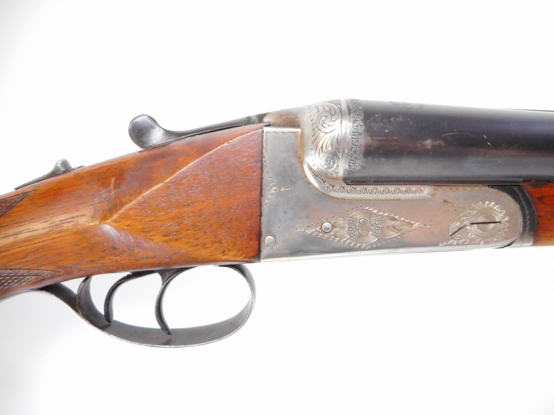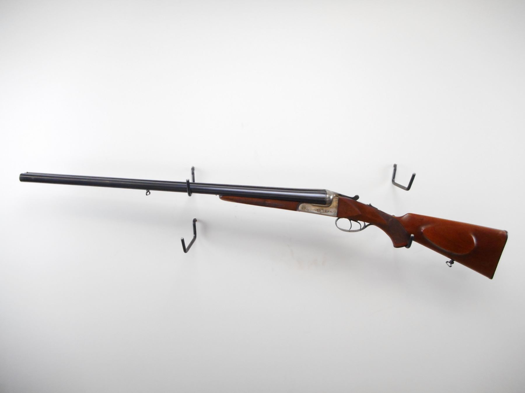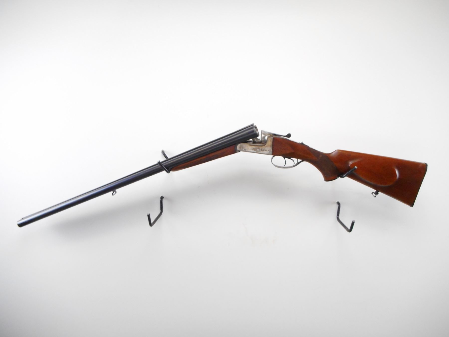 LAURONA , MODEL: SXS , CALIBER: 12 GA XZ 2 3/4" , I/M AND FULL CHOKE. BORE IS VERY GOOD AND VERY GOOD. BRASS BEAD . TEXTURED RAISED RIB BETWEEN BLUE BARRELS. SILVER RECEIVER WITH ENGRAVING. EXTRACTOR. AUTOMATIC SAFETY. DOUBLE TRIGGERS. RIGHT BARREL DOES NOT FIRE. TWO PIECE WOOD STOCKS. CHECKERED FOREARM AND PISTOL GRIP. CHEEK REST. GROOVED BLACK POLYMER BUTT PLATE. GRIP CAP. SLING SWIVELS. METAL SHOWS HANDLING MARKS AND SCRATCHES. STOCK SHOWS DINGS AND SCRATCHES , ACTION: HINGED SXS SHOTGUN , BARREL LENGTH: 27 1/2" , SERIAL # 44743 , CONDITION: 6/10 , CLASS: CANADIAN NON RESTRICTED CLASS