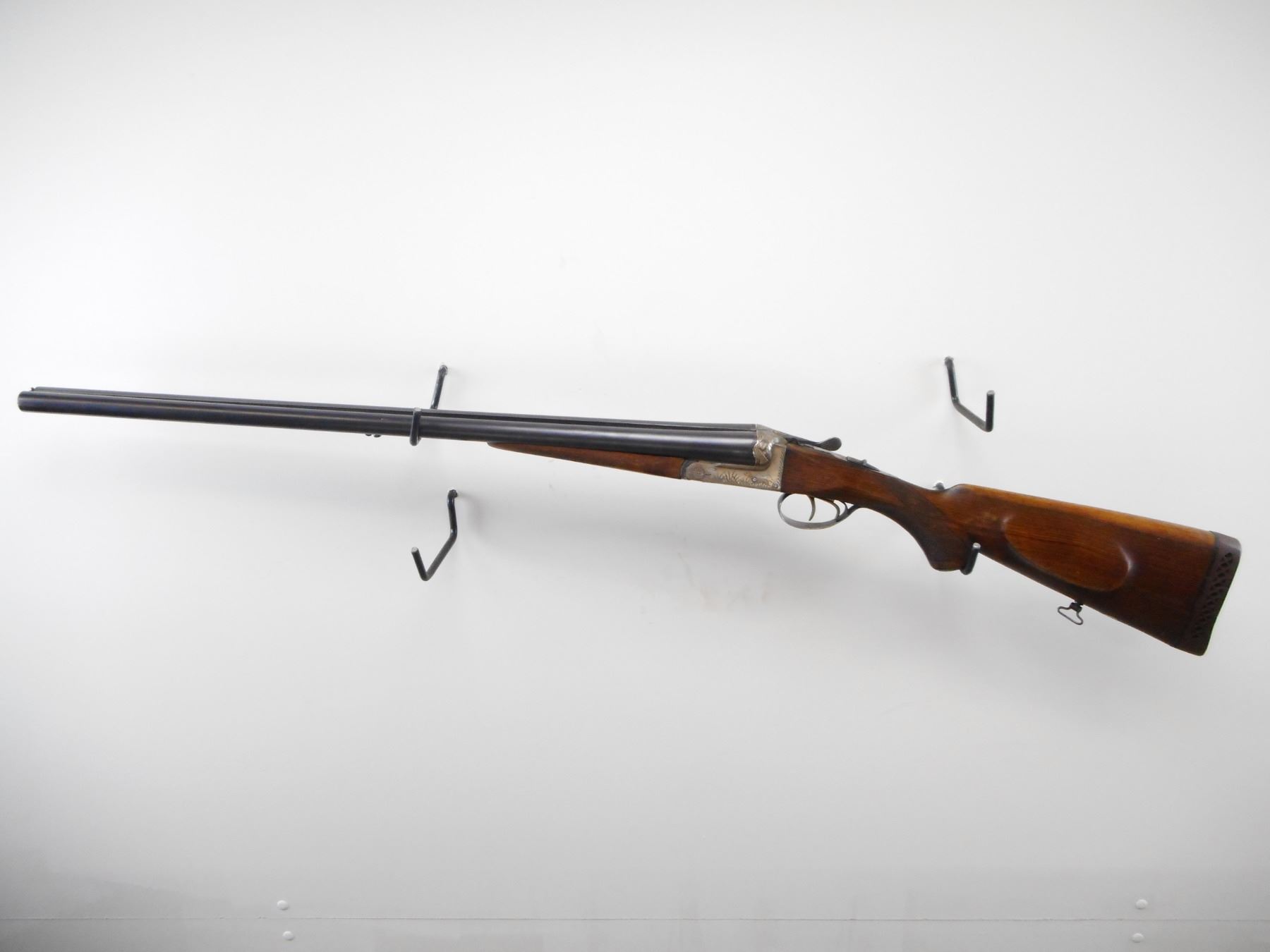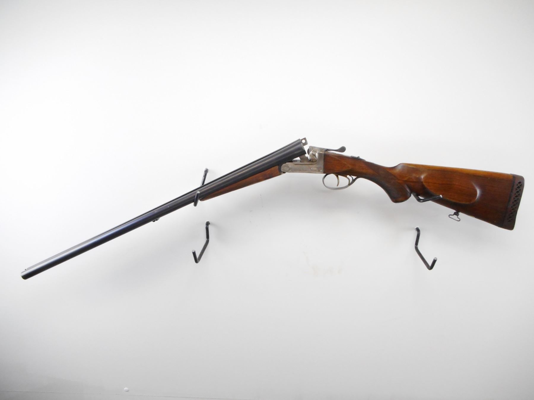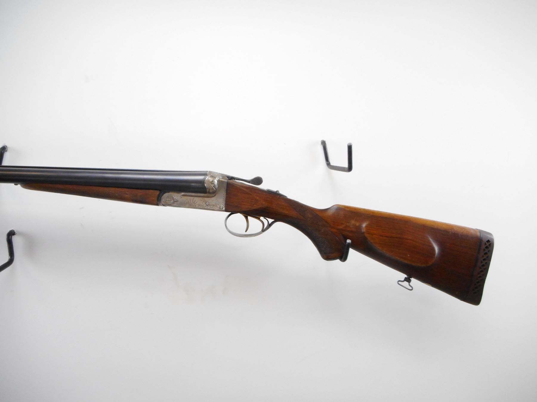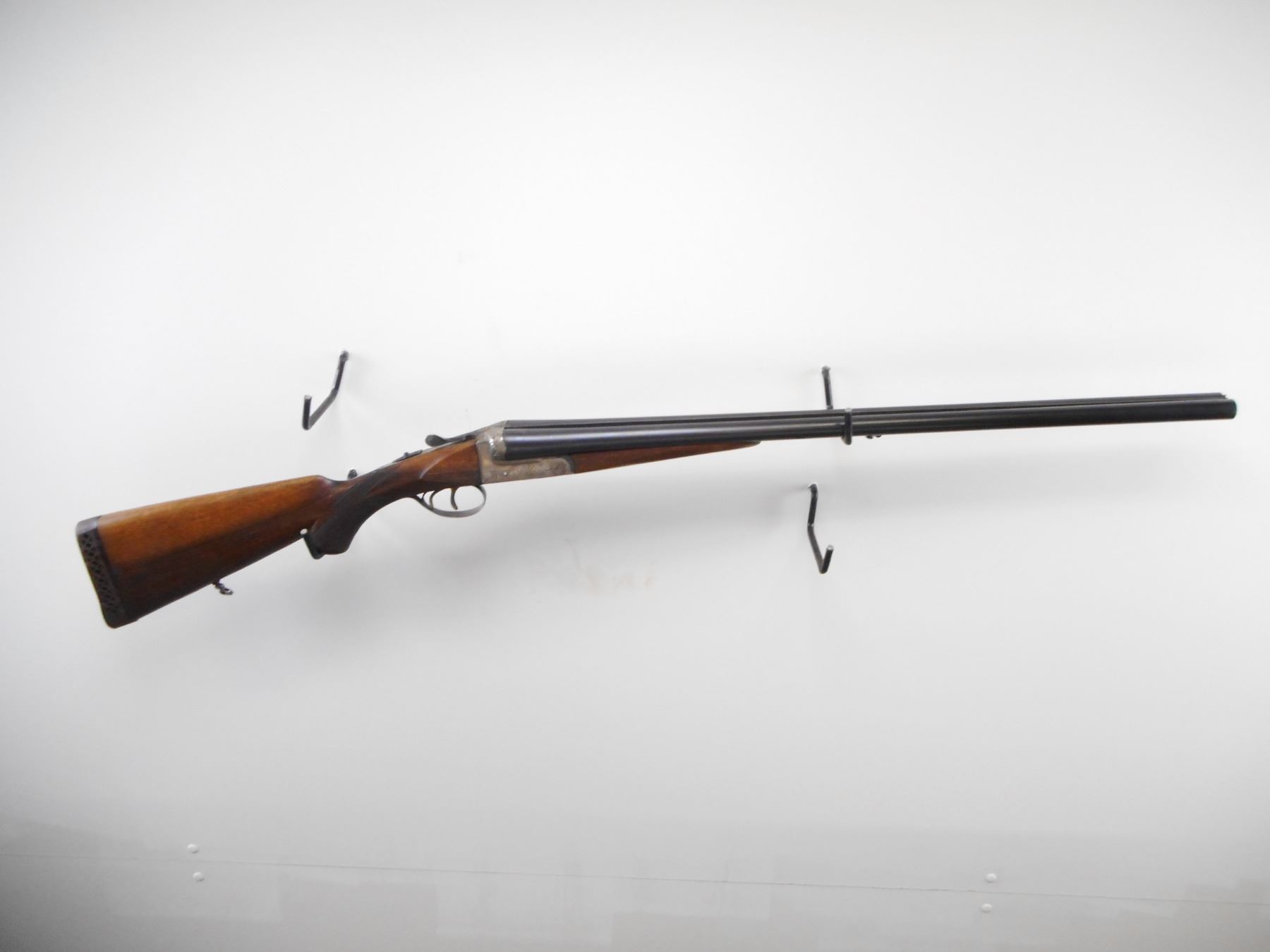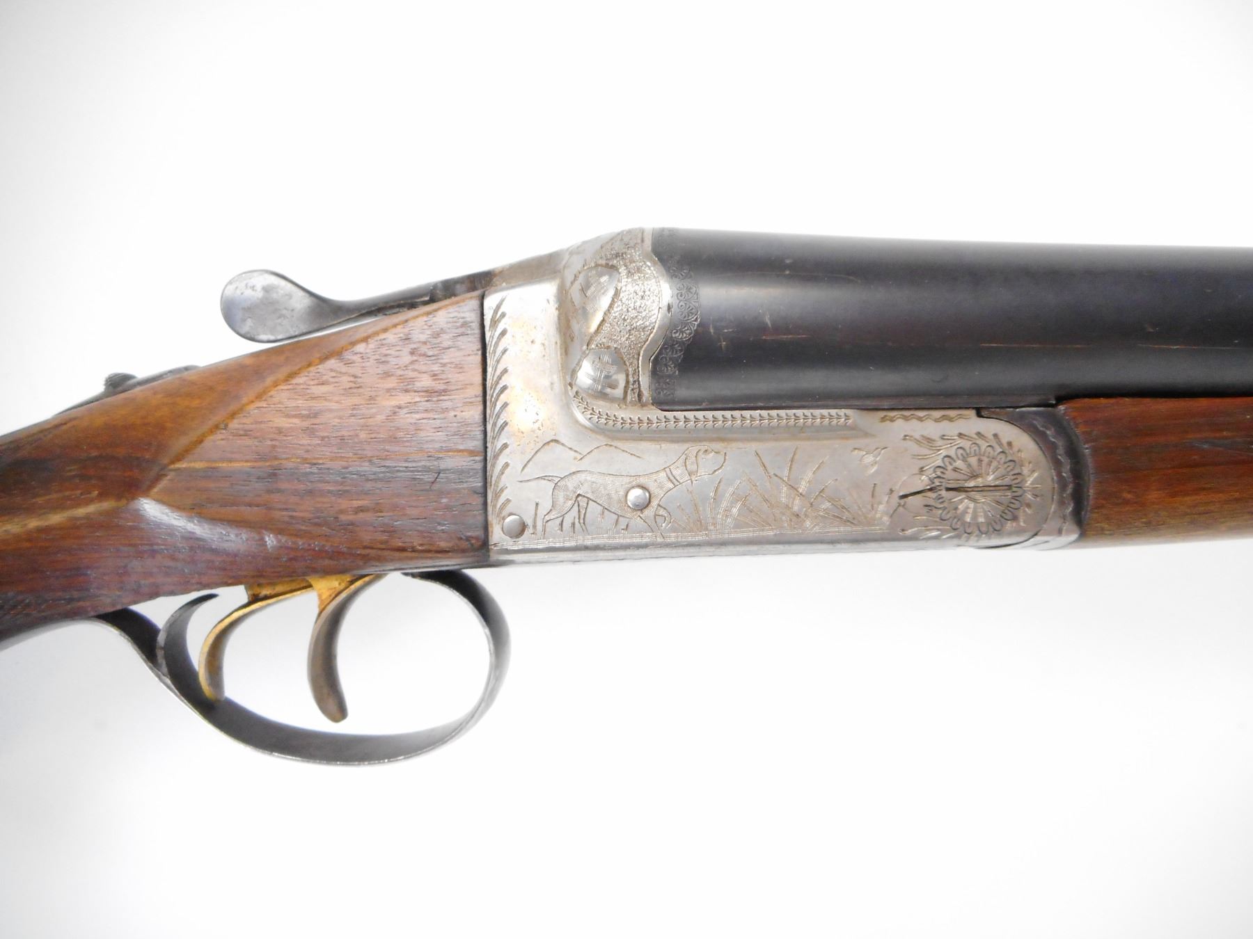 SPANISH , MODEL: RENO , CALIBER: 12 GA X 2 3/4" , I/M AND FULL CHOKES. BORE IS EXCELLENT AND EXCELLENT. BRASS BEAD. RAISED RIB BETWEEN BLUED BARRELS. SILVER ENGRAVED RECEIVER. EXTRACTOR. AUTOMATIC SAFETY. DOUBLE TRIGGERS. TWO PIECE WOOD STOCKS. CHECKERED FOREARM AND PISTOL GRIPS. CHEEK REST. BROWN VENTED RUBBER RECOIL PAD. GRIP CAP. SWIVELS. METAL SHOWS HANDLNIG MARKS AND WEAR. STOCK SHOWS DINGS SCRATCHES AND HANDLING MARKS , ACTION: HINGE SXS SHOTGUN , BARREL LENGTH: 27 1/2" , SERIAL # JU22590 , CONDITION: 7/10 , CLASS: CANADIAN NON RESTRICTED CLASS