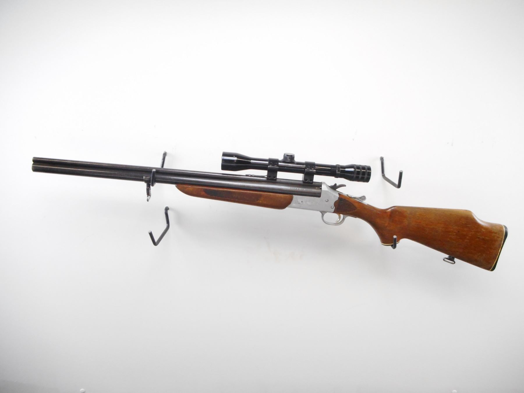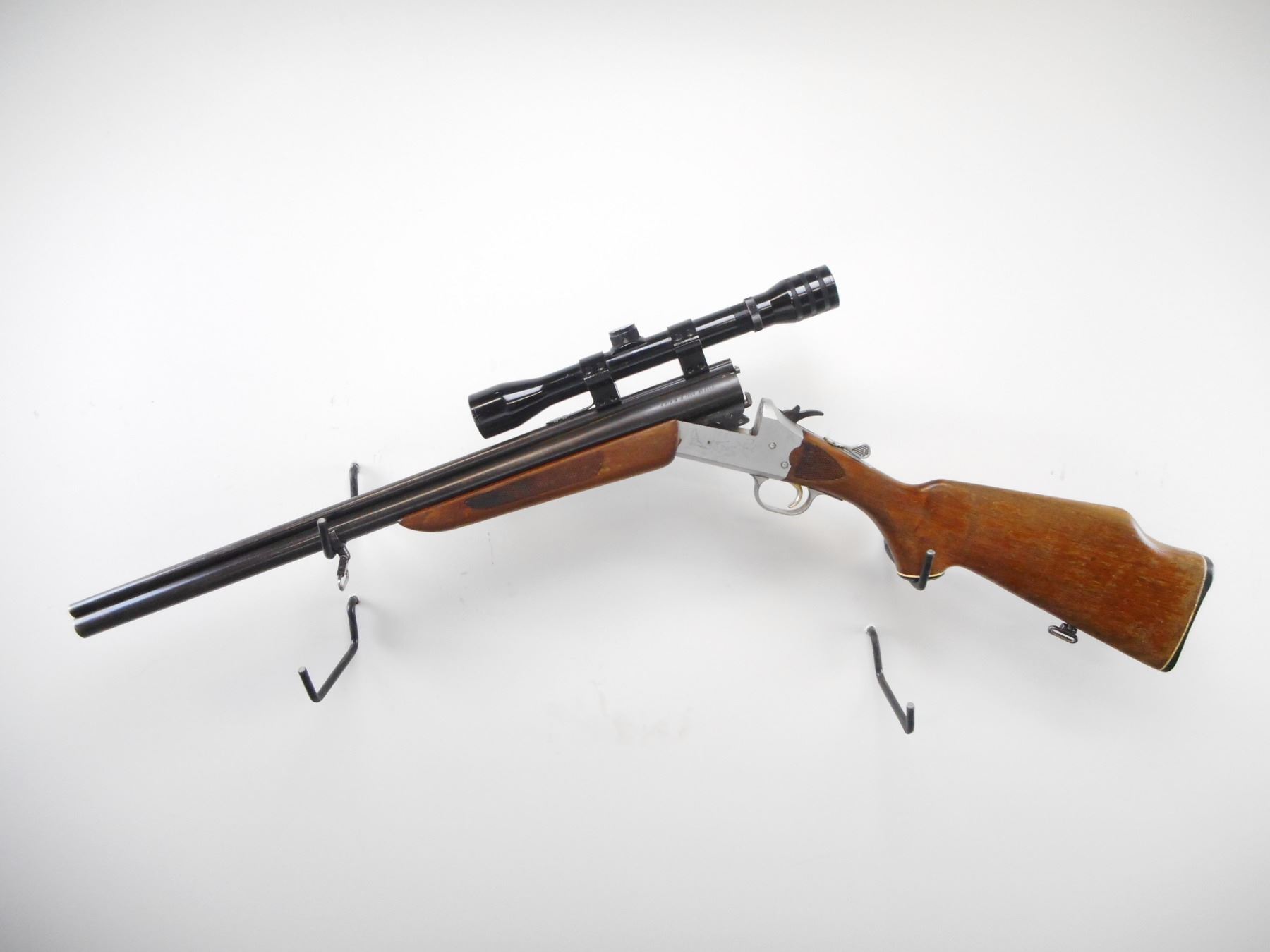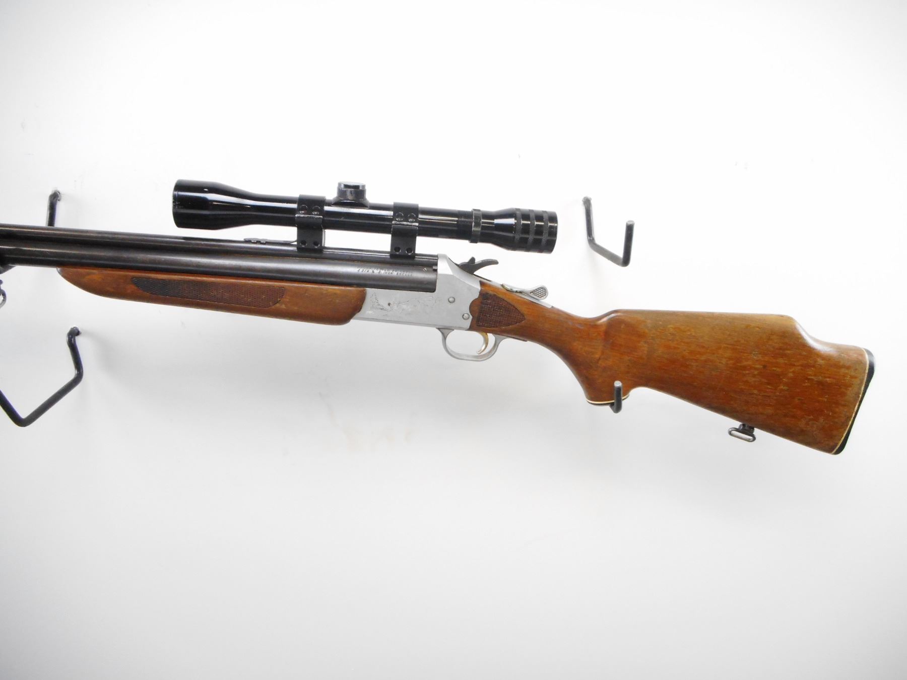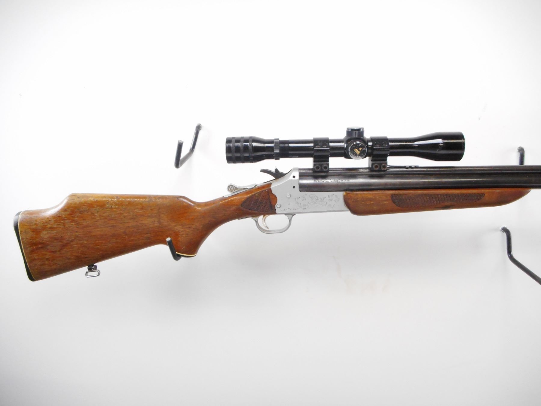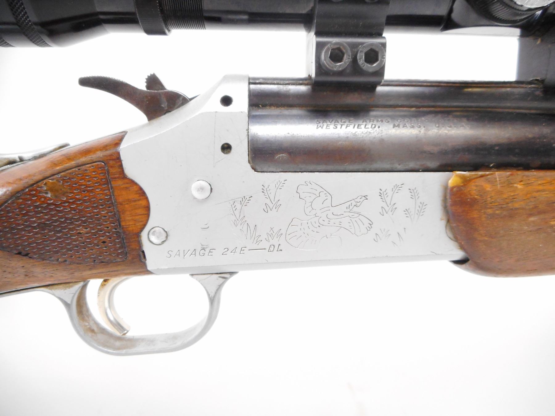 SAVAGE ARMS , MODEL: 24 E-DL , CALIBER: 22 WIN MAG/ 20 GA X 3" , FULL CHOKE. BORES ARE EXCELLENT. MISSING FRONT SIGHT. REAR SIGHT BROKEN. BARREL GROOVED FOR SCOPE MOUNT.MADE IN JAPAN 4 X 33 SCOPE. CLEAR OPTICS POST CROSS HAIR. SILVER ENGRAVED GAME SCENE RECEIVER. BARREL SELECTOR ON HAMMER. TWO PIECE WOOD STOCK.CHECKERED FOREAM AND WRIST. GROOVED BLACK POLYMER BUTT PLATE. SLING SWIVELS. METAL SHOWS SOME WEAR AND HANDLING MARKS. STOCK FINISH WORN, HANDLING MARKS. , ACTION: HINGED COMBINATION , BARREL LENGTH: 23 3/4" , SERIAL # N/A , CONDITION: 6/10 , CLASS: CANADIAN NON RESTRICTED CLASS