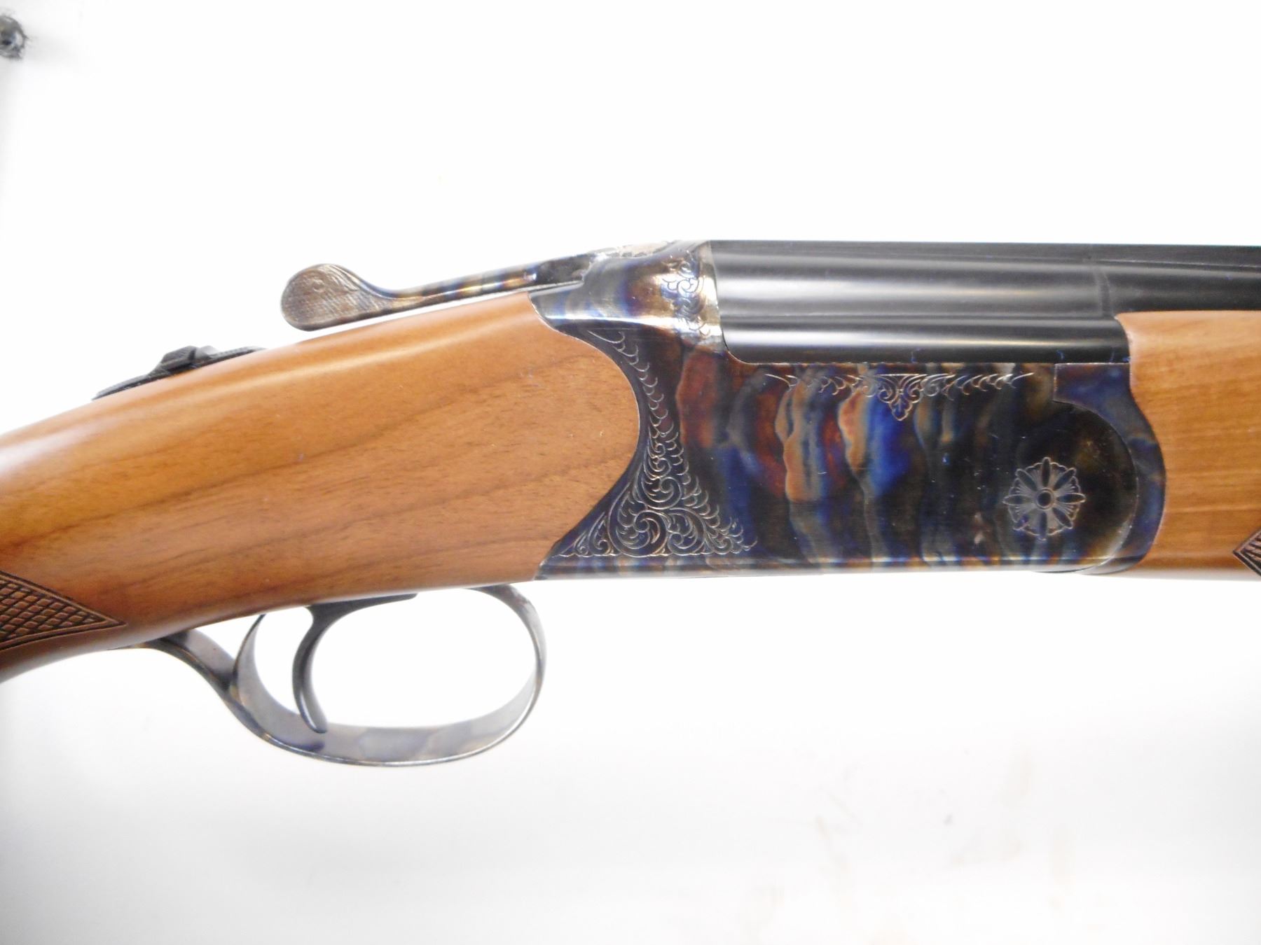 HUGLU , MODEL: 103D , CALIBER: 20 GA X 3" , COMES WITH HARD CASE, MANUAL. REMOVEABLE CHOKES, COMES WITH 5 CHOKES AND WRENCH. BORES ARE EXCELLENT BORE IS EXCELLENT, APPEARS AS NEW, MAY HAVE BEEN TEST FIRED AT FACTORY. WHITE BEAD. VENT RIB ON BLUED BARRELS. COLOUR CASE HARDENED ENGRAVED RECEIVER. EXTRACTOR. MANUAL SELECTIVE SAFETY. SINGLE MECHANICAL TRIGGER. TWO PIECE WOOD STOCKS. CHECKERED FOREARMA AND PISTOL GRIPS. BLACK RUBBER RECOIL PAD. GRAIN SHOWS SOME FIGUREING. SLIGHT HANDLING MARKS , ACTION: HINGE OVER AND UNDER SHOTGUN , BARREL LENGTH: 28" , SERIAL # CA180155 , CONDITION: AS NEW IN CASE , CLASS: CANADIAN NON RESTRICTED CLASS
