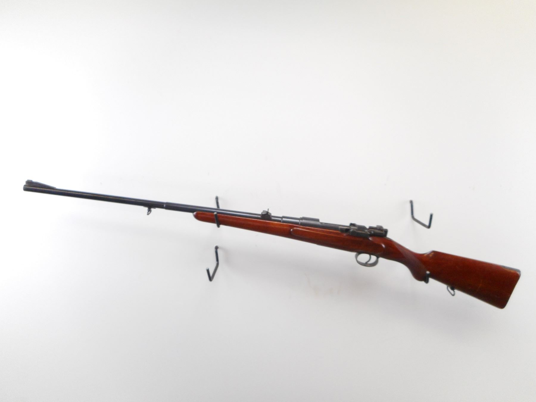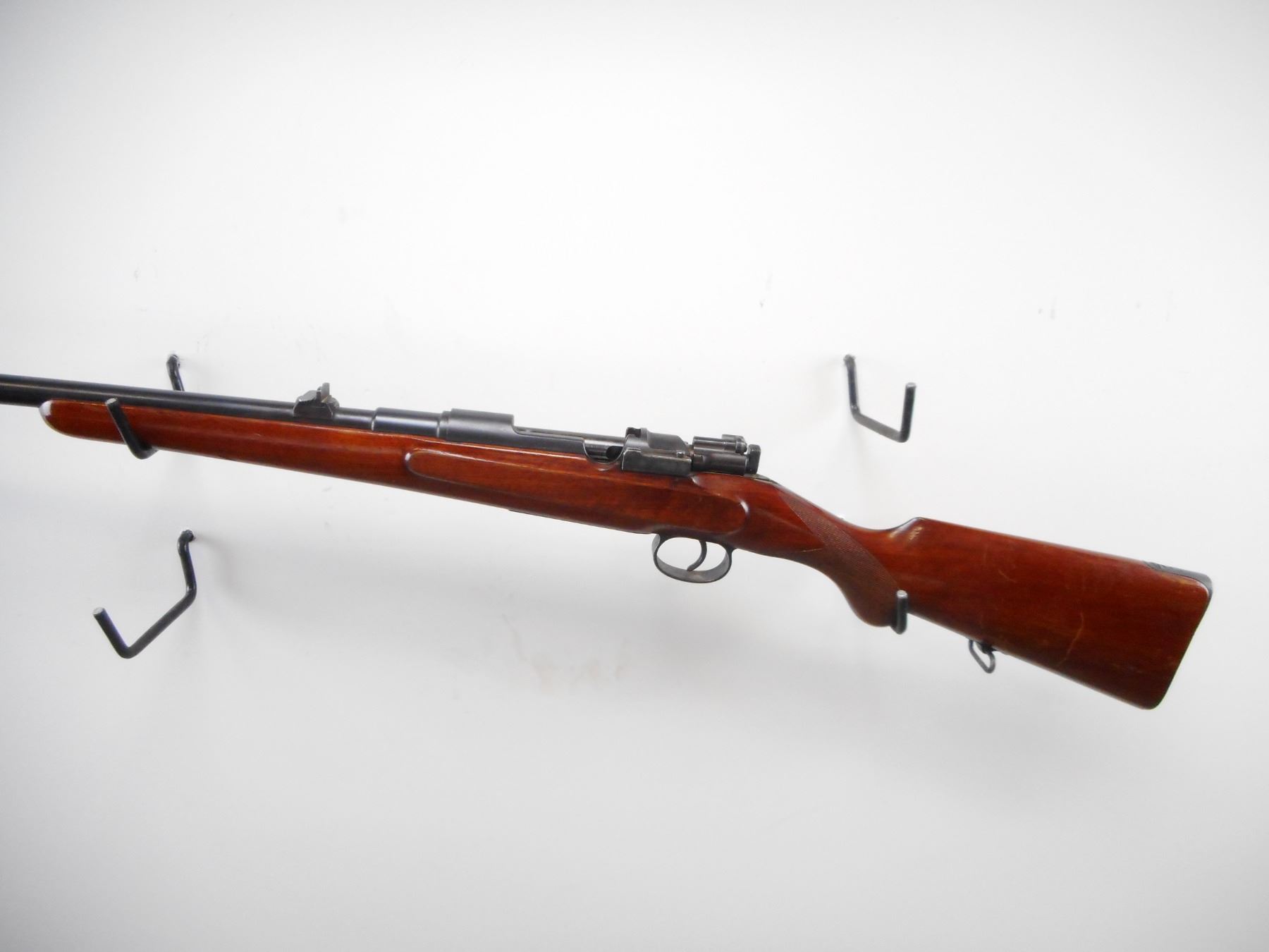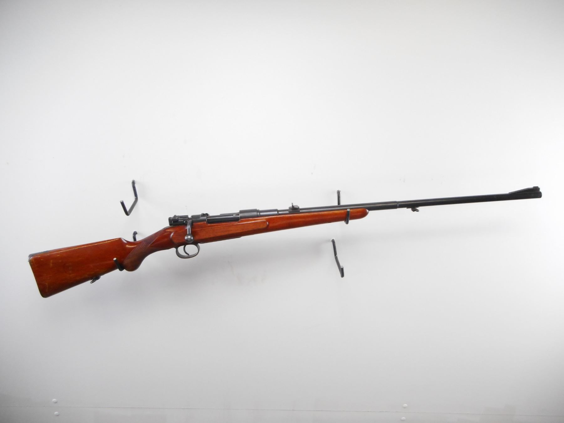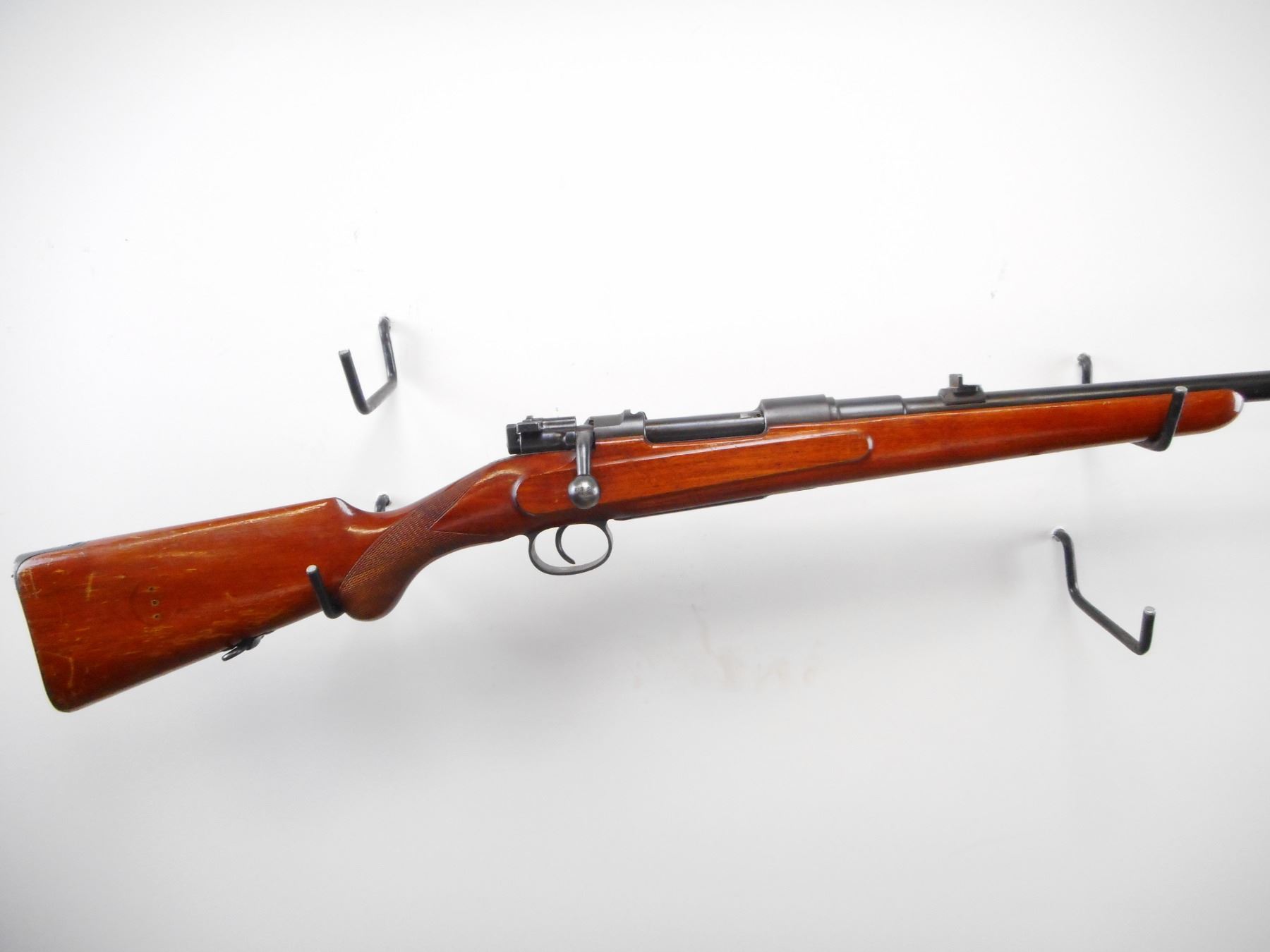 MAUSER , MODEL: SMALL RING SPORTER , CALIBER: ? , BORE IS FAIR, WORN, PITTED. BLAD FRONT SIGHT WITH RAMP. ONE FOLDING ONE FIXED U NOTCH REAR SIGHT. BLUED FINISH ON METAL PARTS. CHECKERED PISTOL GRIP. SMOOTH STEEL BUTT PLATE. SLING SWIVELS. METAL SHOW HANDLING MARKS AND WEAR. STOCK SHOWS DINGS, HANDLING MARKS AND WEAR. , ACTION: BOLT ACTION RIFLE , BARREL LENGTH: 27" , SERIAL # 190962 , CONDITION: 7/10 , CLASS: CANADIAN NON RESTRICTED CLASS
