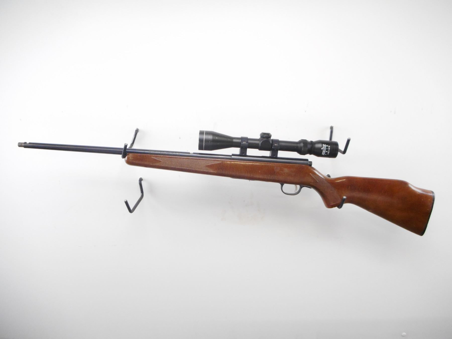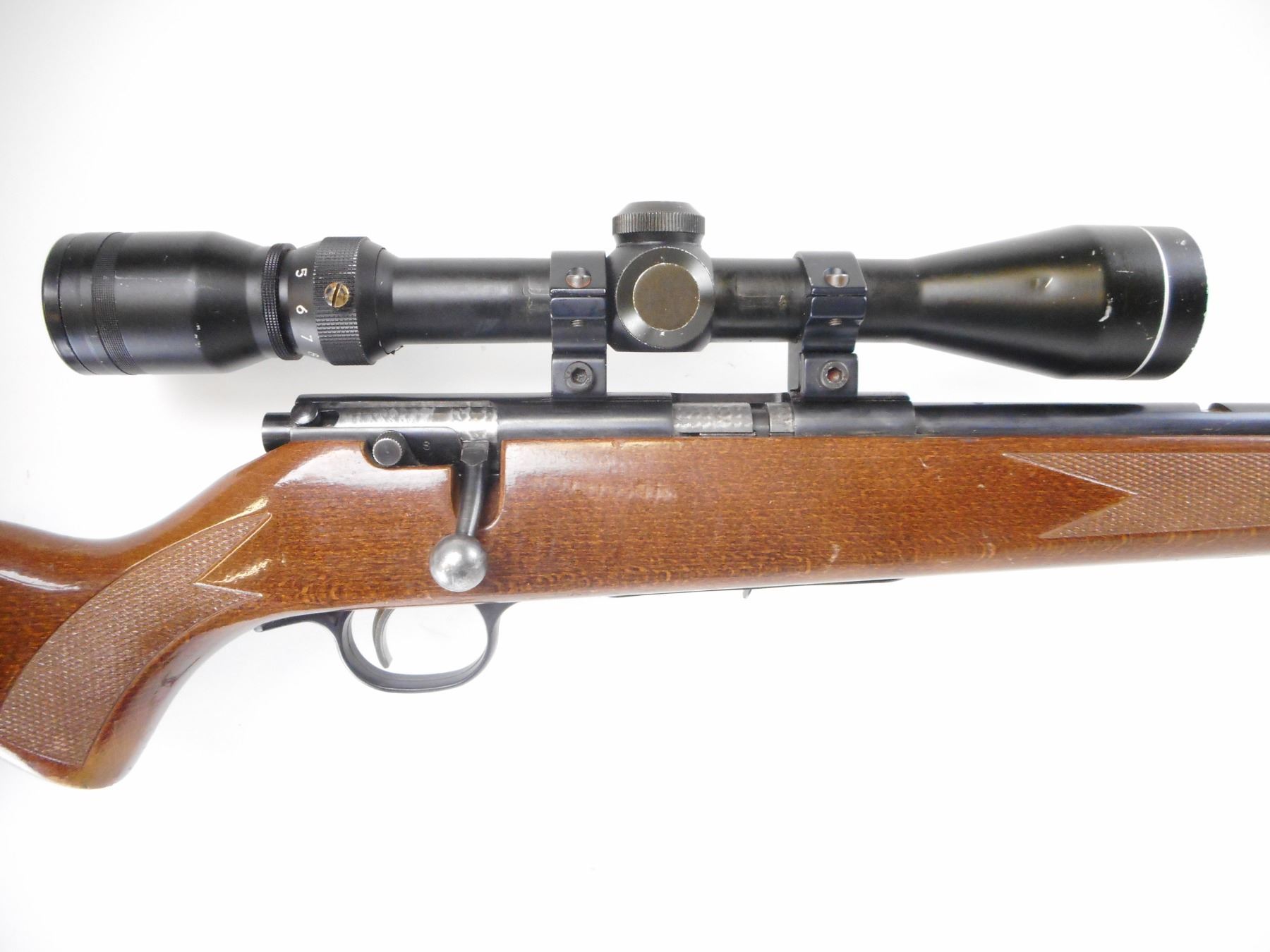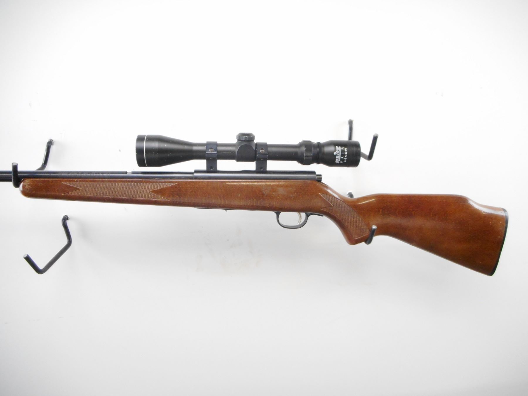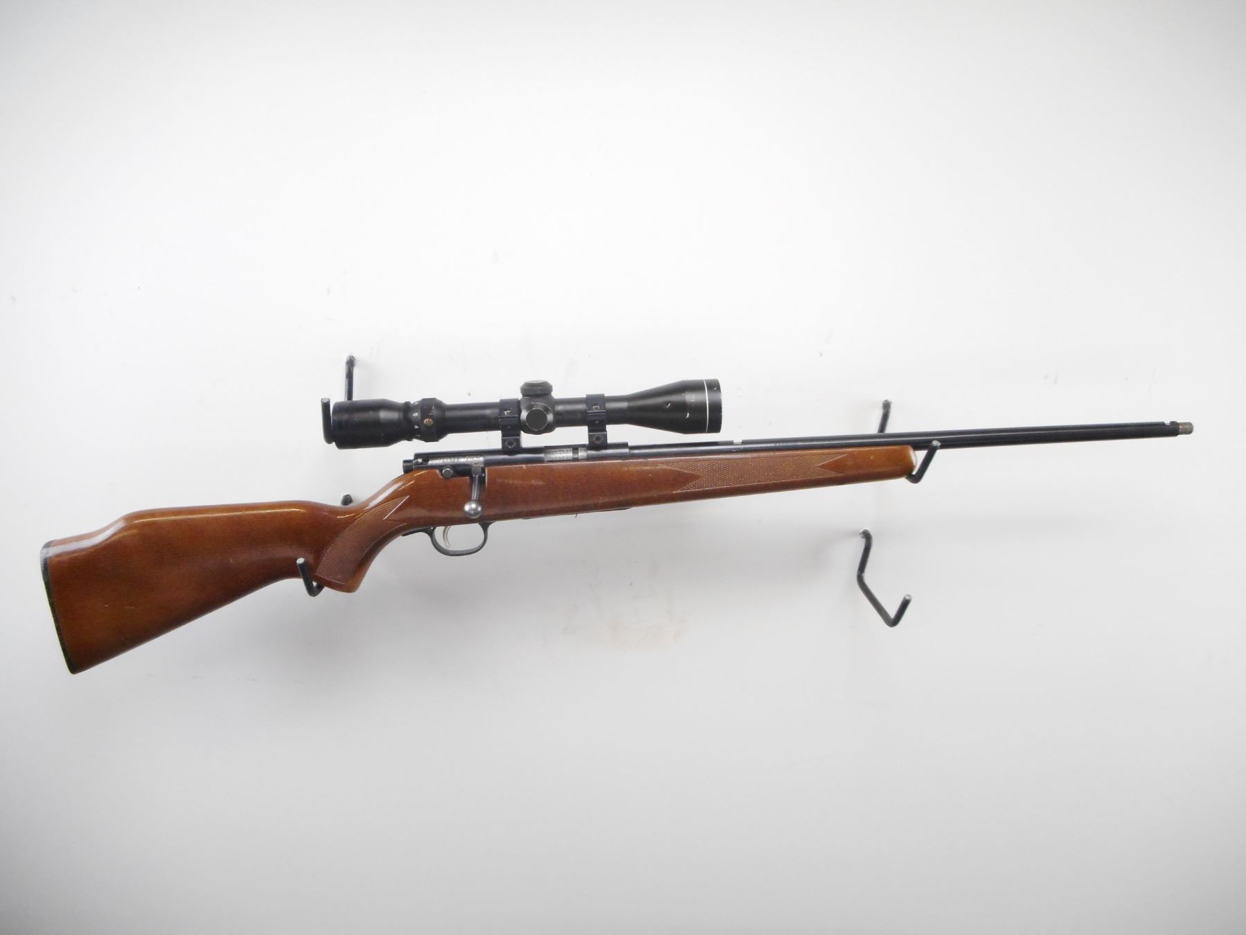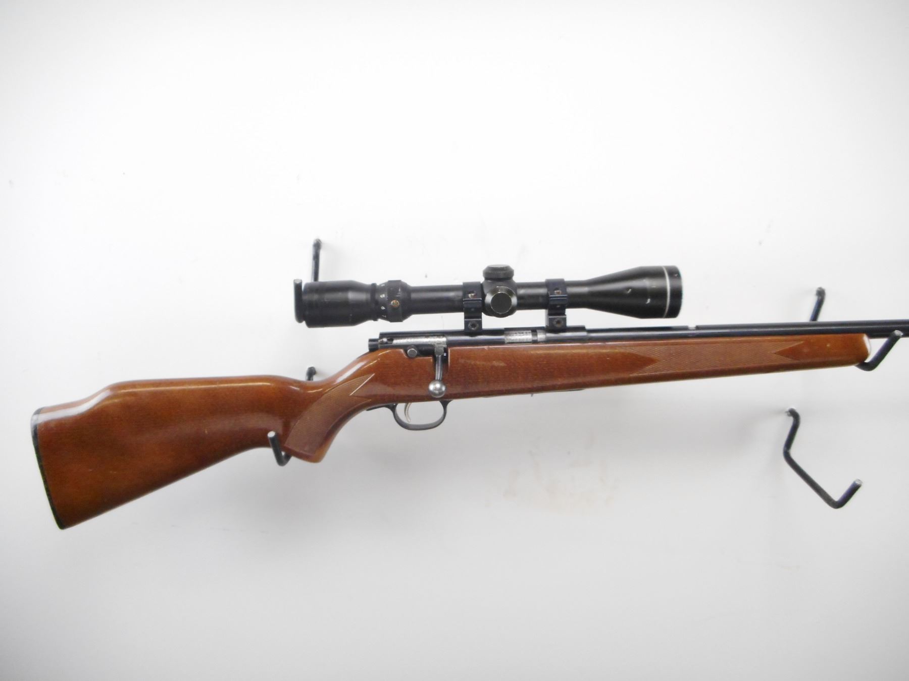 SAVAGE , MODEL: MKII , CALIBER: 22 LR , DOES NOT COME WITH MAGAZINE. BORE IS VERY GOOD. FRONT AND REAR SIGHT REMOVED. SLOTS PRESENT. BARREL THREADED. REITZ 3-9 X 40 SCOPE, CLEAR OPTICS, DUPLEX CROSS HAIRS. ONE PIECE WOOD STOCK. CHECKERED FOREND AND PISTOL GRIP. GROOVED BLACK POLYMER BUTT PLATE. POLYMER TRIGGER GUARD. METAL SHOWS HANDLING MARKS AND WEAR. STOCK SHOWS SMALL DINGS HANDLING MARKS AND WEAR. , ACTION: BOLT ACTION RIFLE , BARREL LENGTH: 21" , SERIAL # 381222 , CONDITION: 7/10 , CLASS: CANADIAN NON RESTRICTED CLASS