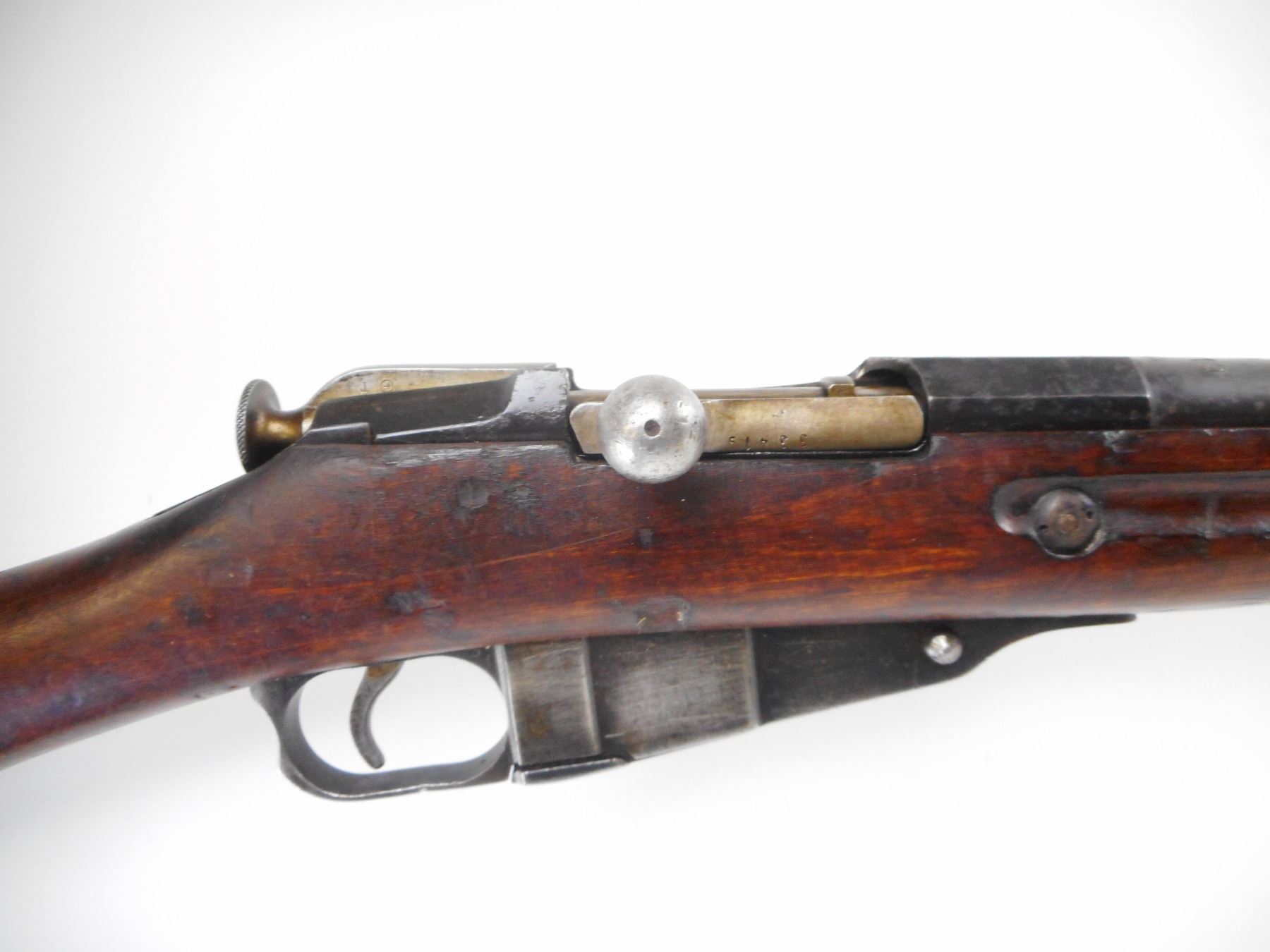 MOSIN NAGANT , MODEL: 91 , CALIBER: 7.62 X54R , BORE IS FAIR WORN, LIGHT PITTING. FINNISH REBUILD. TIKKA BARREL. DATED 1942. BARELY CORN FRONT SIGHT. ADJUSTABLE U NOTCH REAR SIGHT. OCTAGONAL RECEIVER. TWO PIECE FULL MILITARY STOCKS. SMOOTH STEEL BUTT PLATE. SLING SWIVELS. CLEANING ROD. METAL SHOWS HANDLING MARKS AND WEAR. STOCK SHOWS DINGS SCRATCHES AND HANDLING MARKS , ACTION: BOLT ACTION RIFLE , BARREL LENGTH: 31 1/2" , SERIAL # 33419 , CONDITION: 7/10 , CLASS: CANADIAN NON RESTRICTED CLASS
