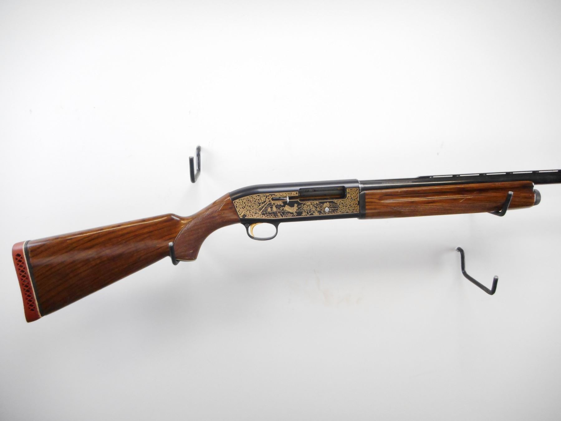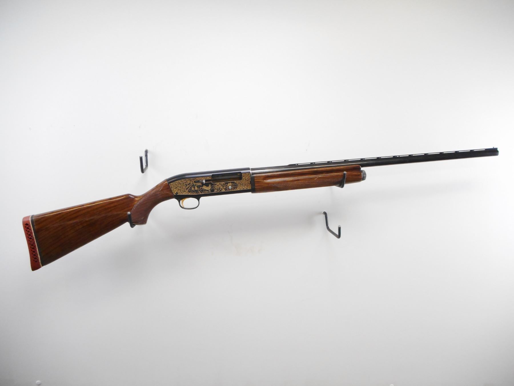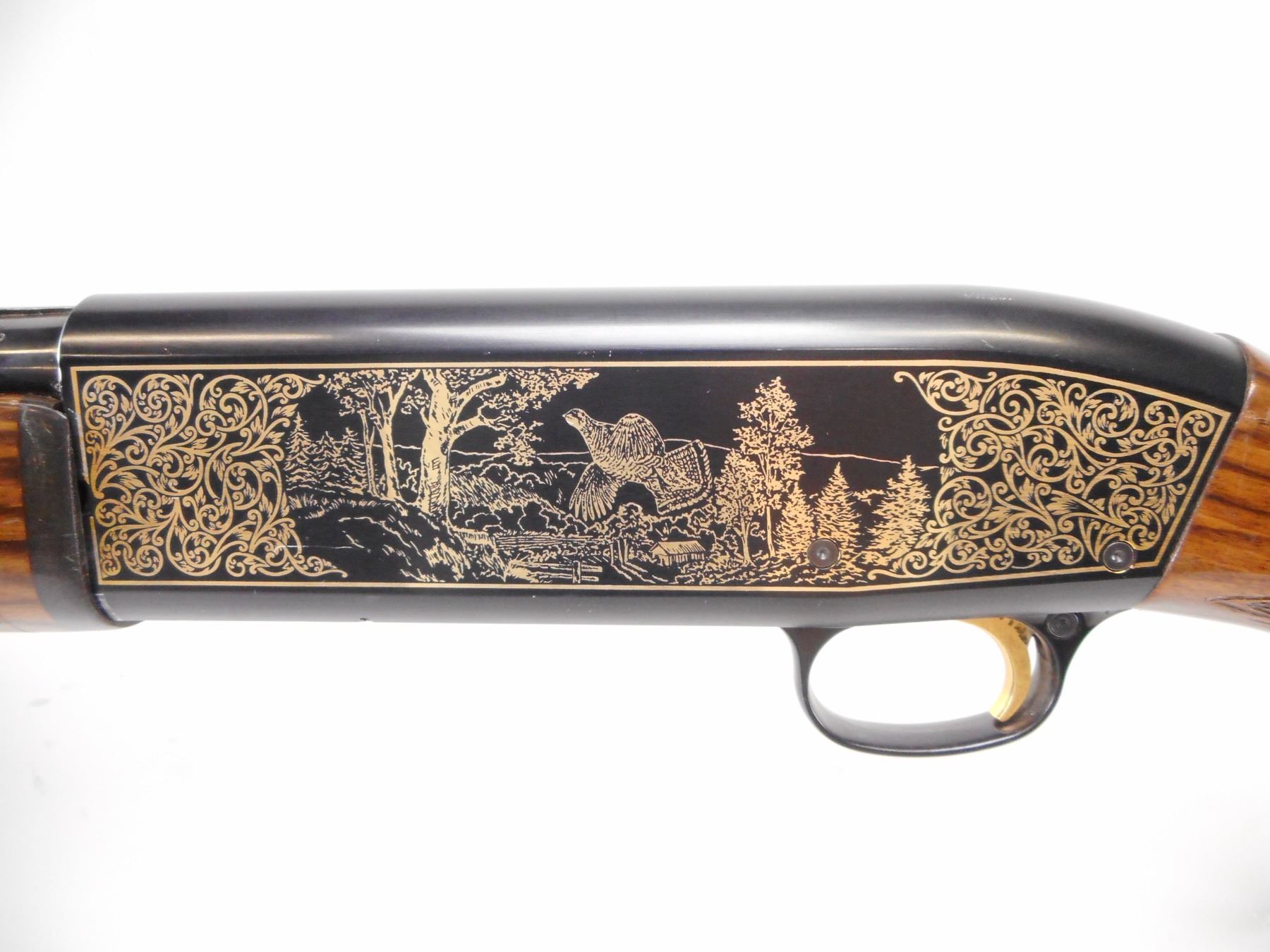 ITHACA , MODEL: 900 , CALIBER: 20 GA X 3" , MOD CHOKE. BORE IS VERY GOOD. BRASS FRONT AND MID RIB BEAD. VENT RIB. BLUED BARREL. GOLD EMBOSSED GAME SCENE RECEIVER. TWO PIECE WOOD STOCKS. CHECKERED FOREARM AND PISTOL GRIPS. RED VENTED RUBBER RECOIL PAD. GRIP CAP. BLUEING SHOW SOME HANDLING MARKS AND WEAR. STOCK SHOW NUMEROUS HANDLING MARKS AND WEAR. , ACTION: SEMI AUTO SHOTGUN , BARREL LENGTH: 28" , SERIAL # S502005 , CONDITION: 7/10 , CLASS: CANADIAN NON RESTRICTED CLASS