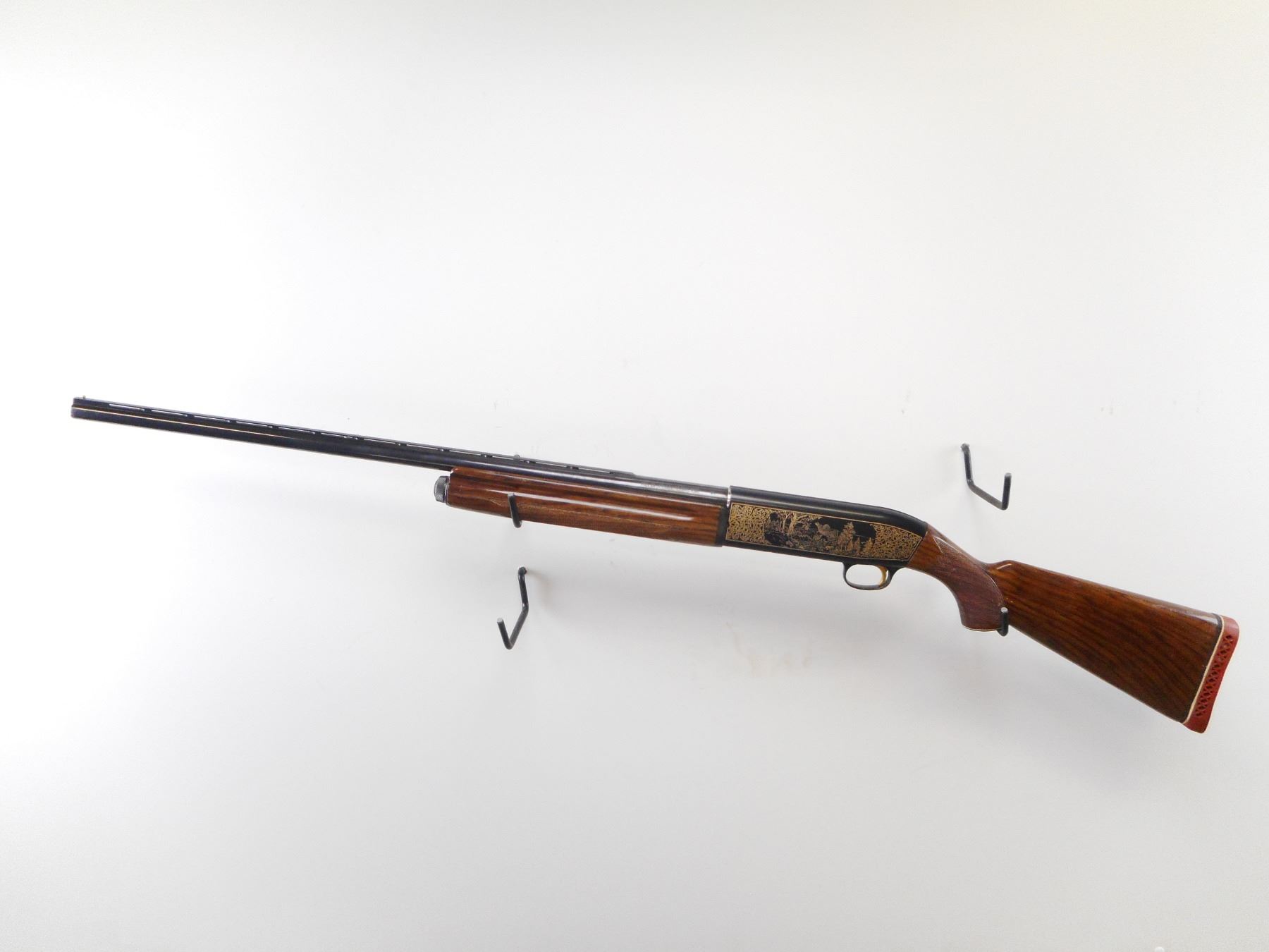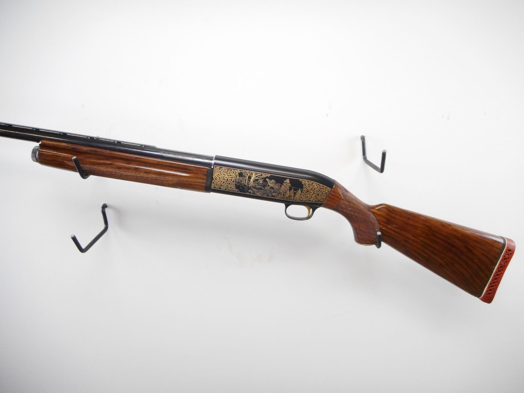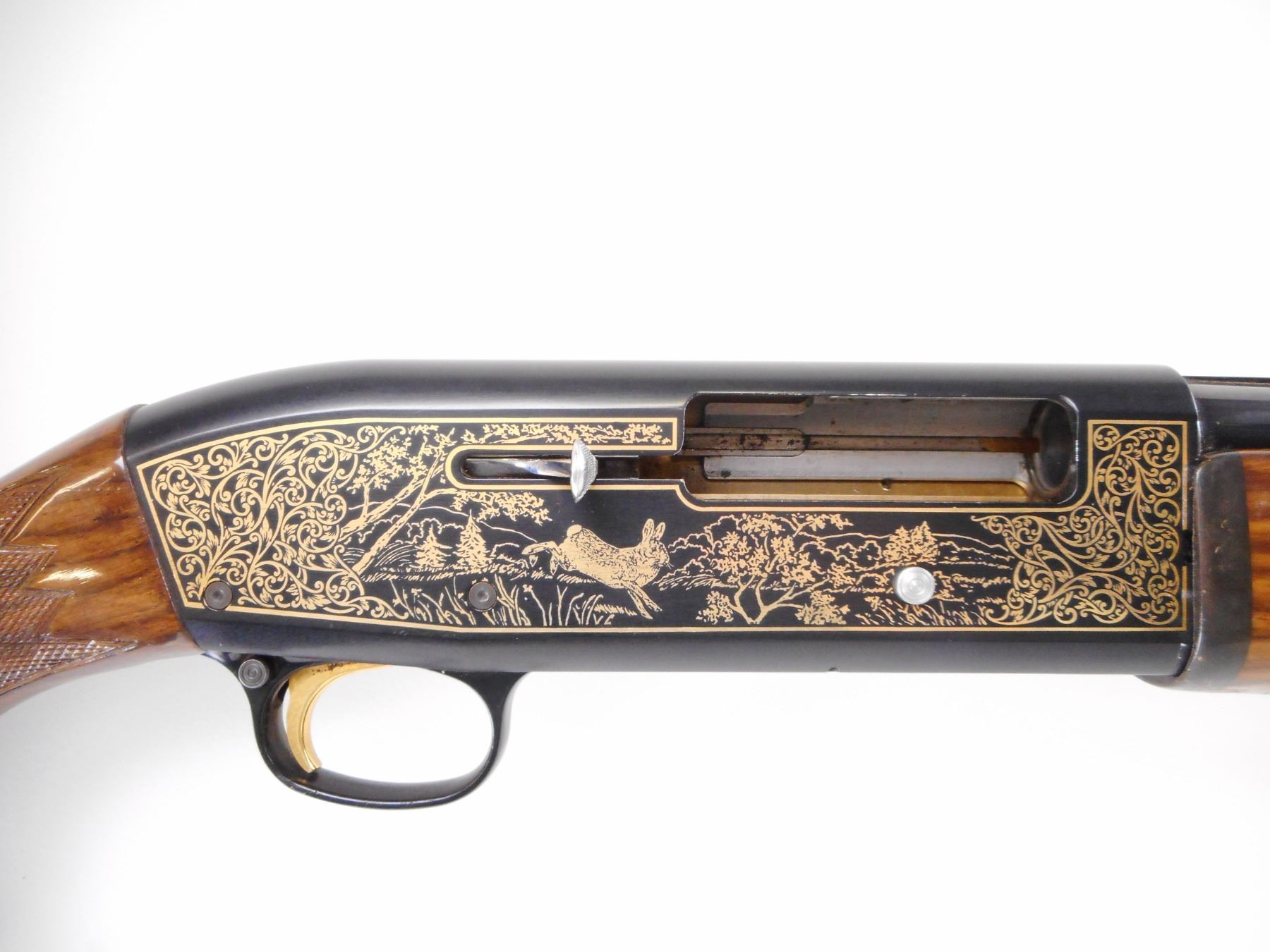 ITHACA , MODEL: 900 , CALIBER: 20 GA X 3" , MOD CHOKE. BORE IS VERY GOOD. BRASS FRONT AND MID RIB BEAD. VENT RIB. BLUED BARREL. GOLD EMBOSSED GAME SCENE RECEIVER. TWO PIECE WOOD STOCKS. CHECKERED FOREARM AND PISTOL GRIPS. RED VENTED RUBBER RECOIL PAD. GRIP CAP. BLUEING SHOW SOME HANDLING MARKS AND WEAR. STOCK SHOW NUMEROUS HANDLING MARKS AND WEAR. , ACTION: SEMI AUTO SHOTGUN , BARREL LENGTH: 28" , SERIAL # S502005 , CONDITION: 7/10 , CLASS: CANADIAN NON RESTRICTED CLASS