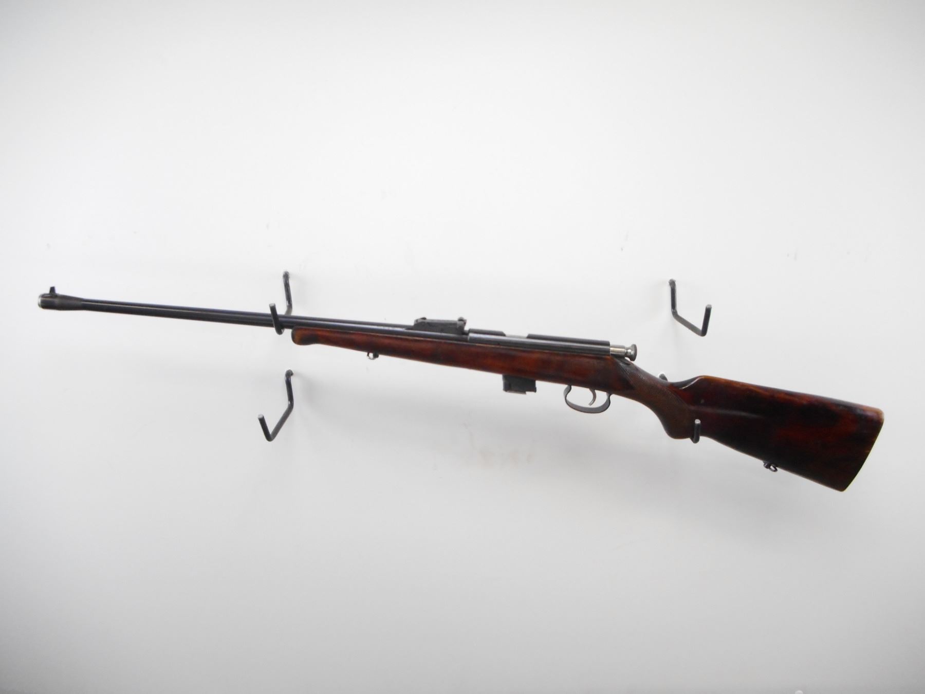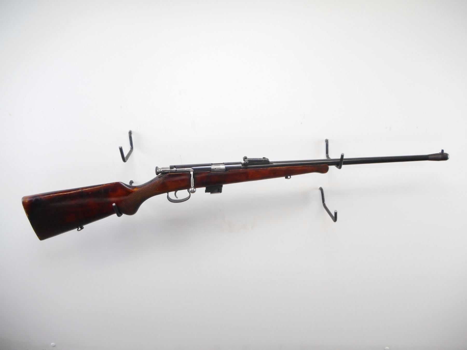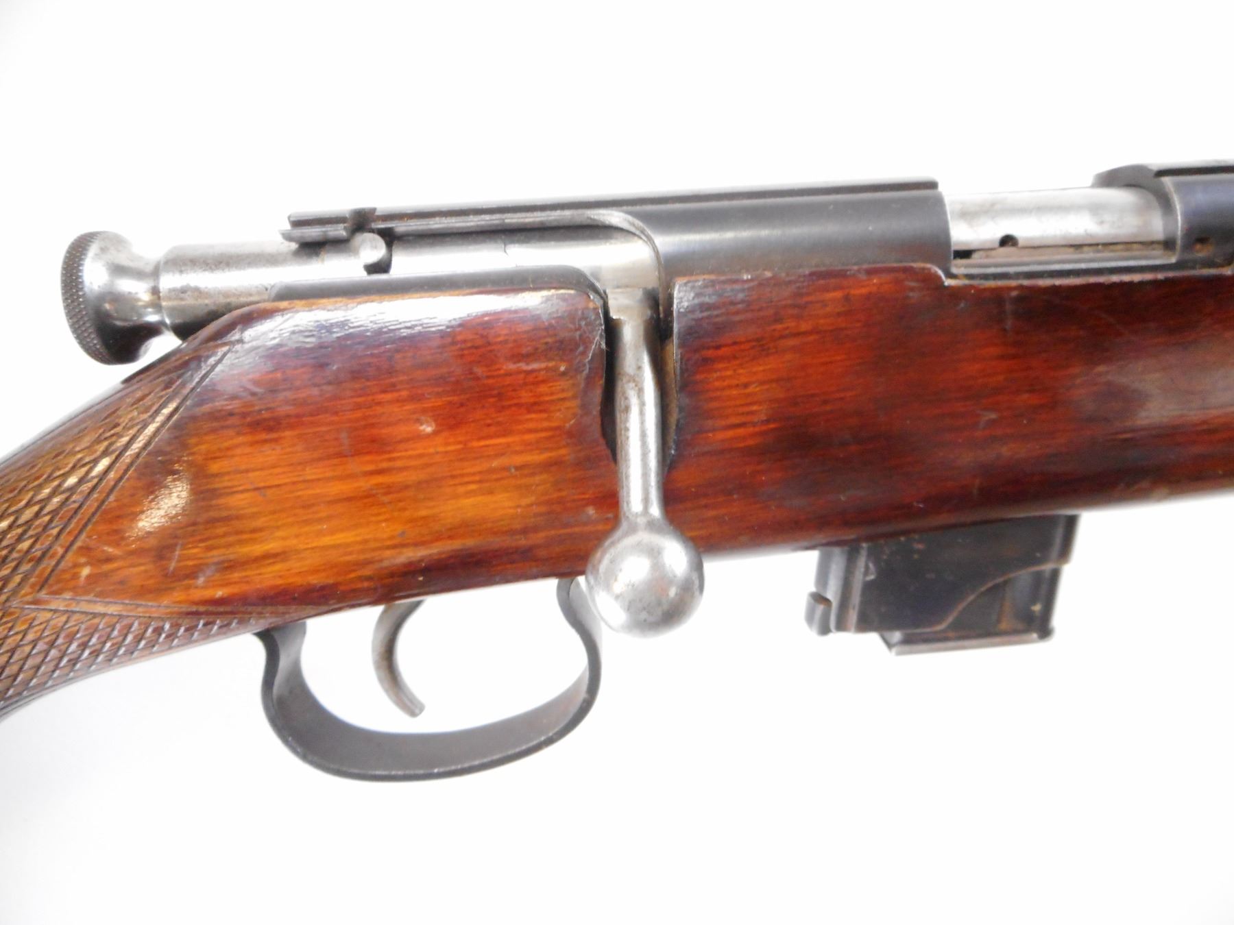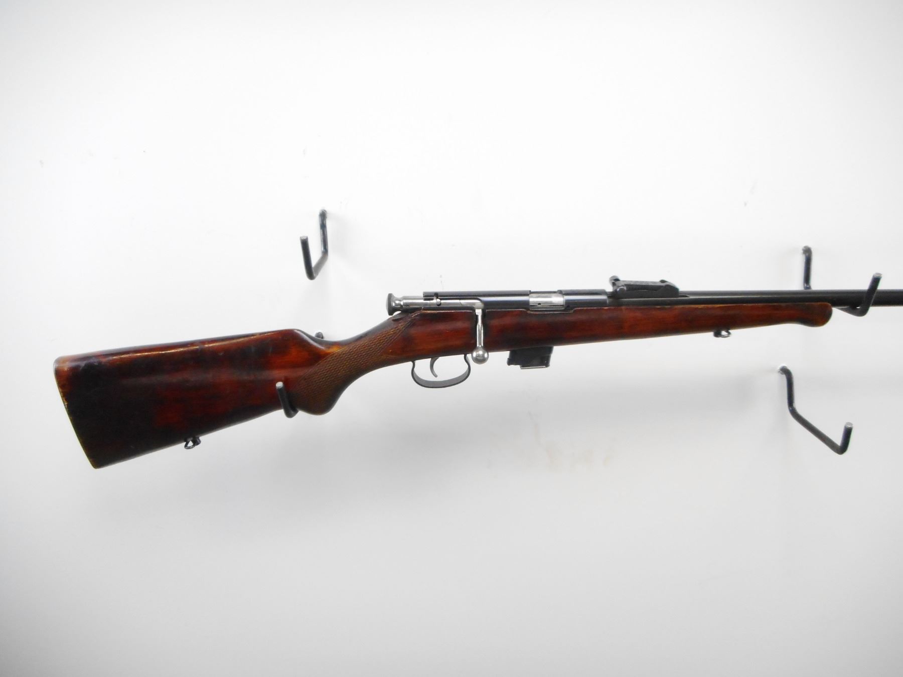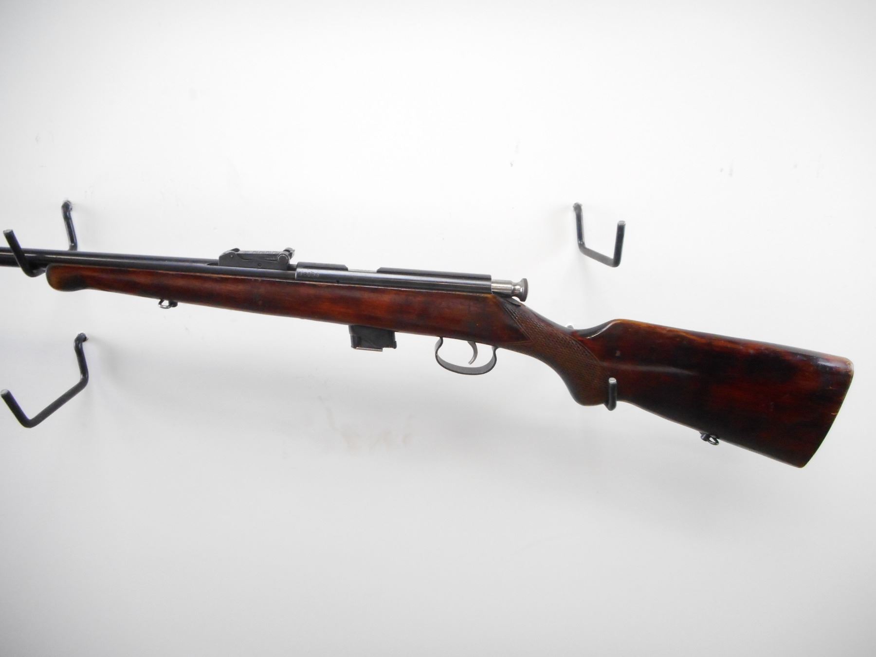 VOLSTOCK , MODEL: T03-17 , CALIBER: 22 LR , COMES WITH MAGAZINE. BORE IS VERY GOOD. BLADE FRONT SIGHT. U NOTCH ADJUSTABLE REAR SIGHT. RECEIVER GROOVED FOR SCOPE MOUNT. ONE PIECE WOOD STOCK. SMOOTH FOREND. CHECKERED PISTOL GRIP. SMOOTH STEEL BUTT PLATE. SLING SWIVELS. BLUEING SHOWS HANDLING MARKS AND WEAR. STOCK SHOW HANDLING MARKS AND WEAR. , ACTION: BOLT ACTION RIFLE , BARREL LENGTH: 21" , SERIAL # 2866 , CONDITION: 7/10 , CLASS: CANADIAN NON RESTRICTED CLASS