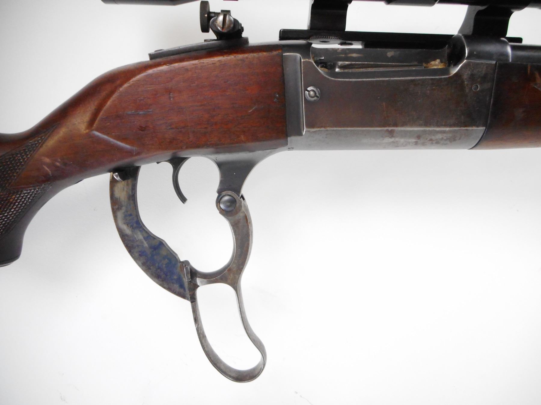 SAVAGE , MODEL: 99 , CALIBER: 300 SAVAGE , BORE IS GOOD. BLADE FRONT SIGHT WITH RAMP. REAR SIGHT REMOVED, SLOTE BLANK INSTALLED. TASCO 4 X 32 SCOPE. CLEAR OPTICS, DUPLEX CROSS HAIRS. RECEIVER DRILLED AND TAPPED WITH LYMAN PEEP. BLUED FINISH ON METAL PARTS. TWO PIECE WOOD STOCK. CHECKERED FOREARM AND PISTOL GRIP. CURVED STEEL BUTT PLATE. GRIP CAP. SWIVEL STUDS. FOREARM MISSING SCREW, HELD ON WITH TAPE. BLUEING SHOWS LIGHT RUST SPECKLES AND WEAR. STOCKS SHOWS HANDLING MARKS, DINGS AND SCRATCHES. , ACTION: LEVER ACTION RIFLE , BARREL LENGTH: 24" , SERIAL # 590125 , CONDITION: 6/10 , CLASS: CANADIAN NON RESTRICTED CLASS