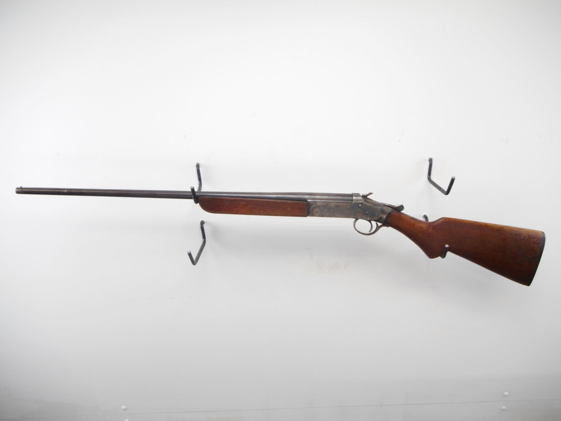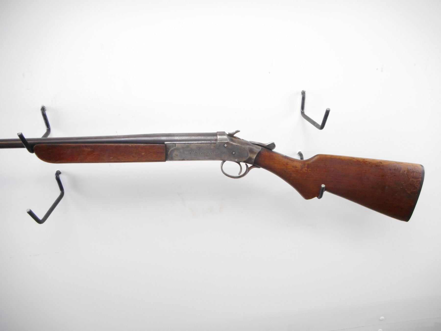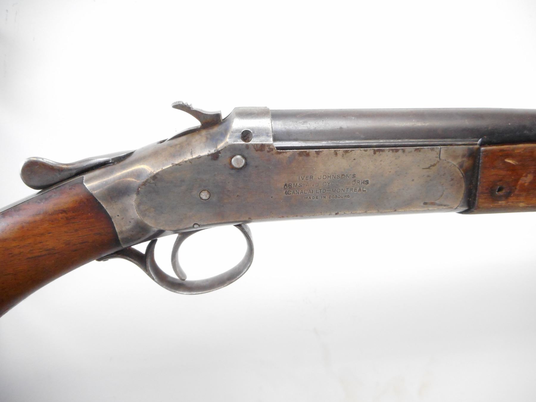 IVER JOHNSON , MODEL: CHAMPION , CALIBER: .410 GA X 3" , FULL CHOKE. BORE IS VERY GOOD. BRASS BEAD. ROUND BLUED BARREL. COLOUR CASE HARDENED RECEIVER. HAMMER SPUR MOTIFIED WITH GROOVES. SMOOTH TOW PIECE WOOD STOCKS. PISTOL GRIP. GROOVED BLACK POLYMER BUTT PLATE. METAL FINISH SHOWS WEAR AND HANDLING MARKS. FOREND HAS TWO HOLES ON RIGHT SIDE. STOCK SHOWS NUMEROUS HANDLING MARKS AND WEAR. , ACTION: HINGE SINGLE SHOT SHOTGUN , BARREL LENGTH: 26" , SERIAL # 21538 , CONDITION: 6/10 , CLASS: CANADIAN NON RESTRICTED CLASS