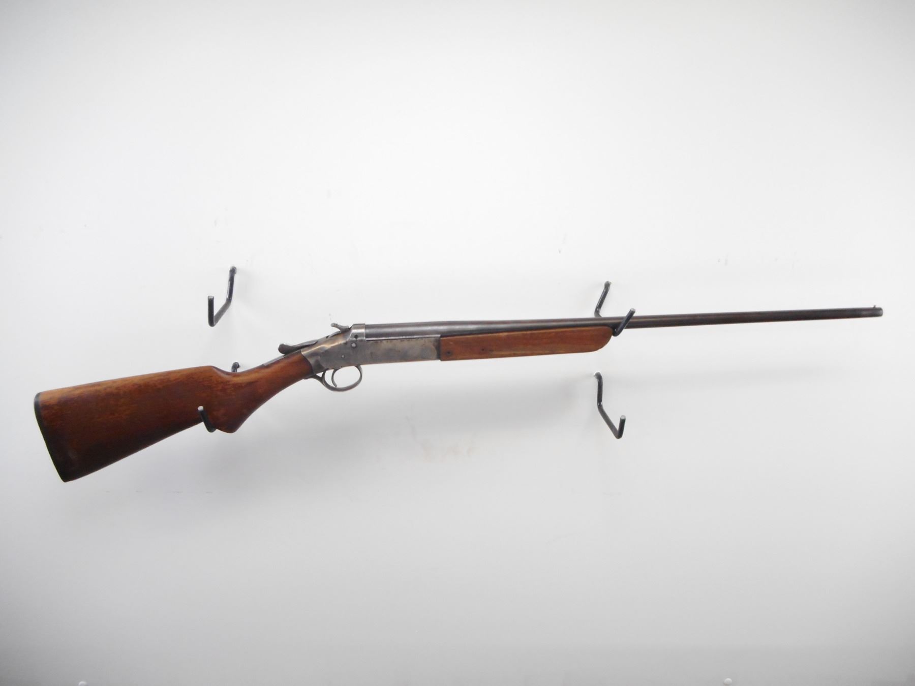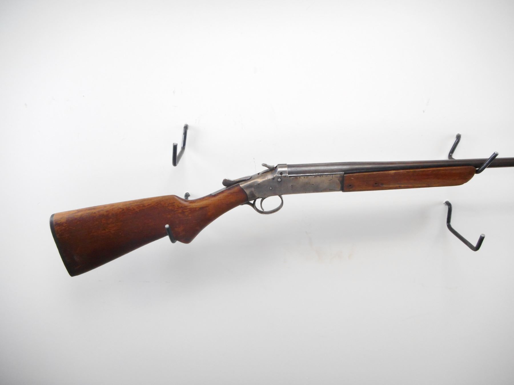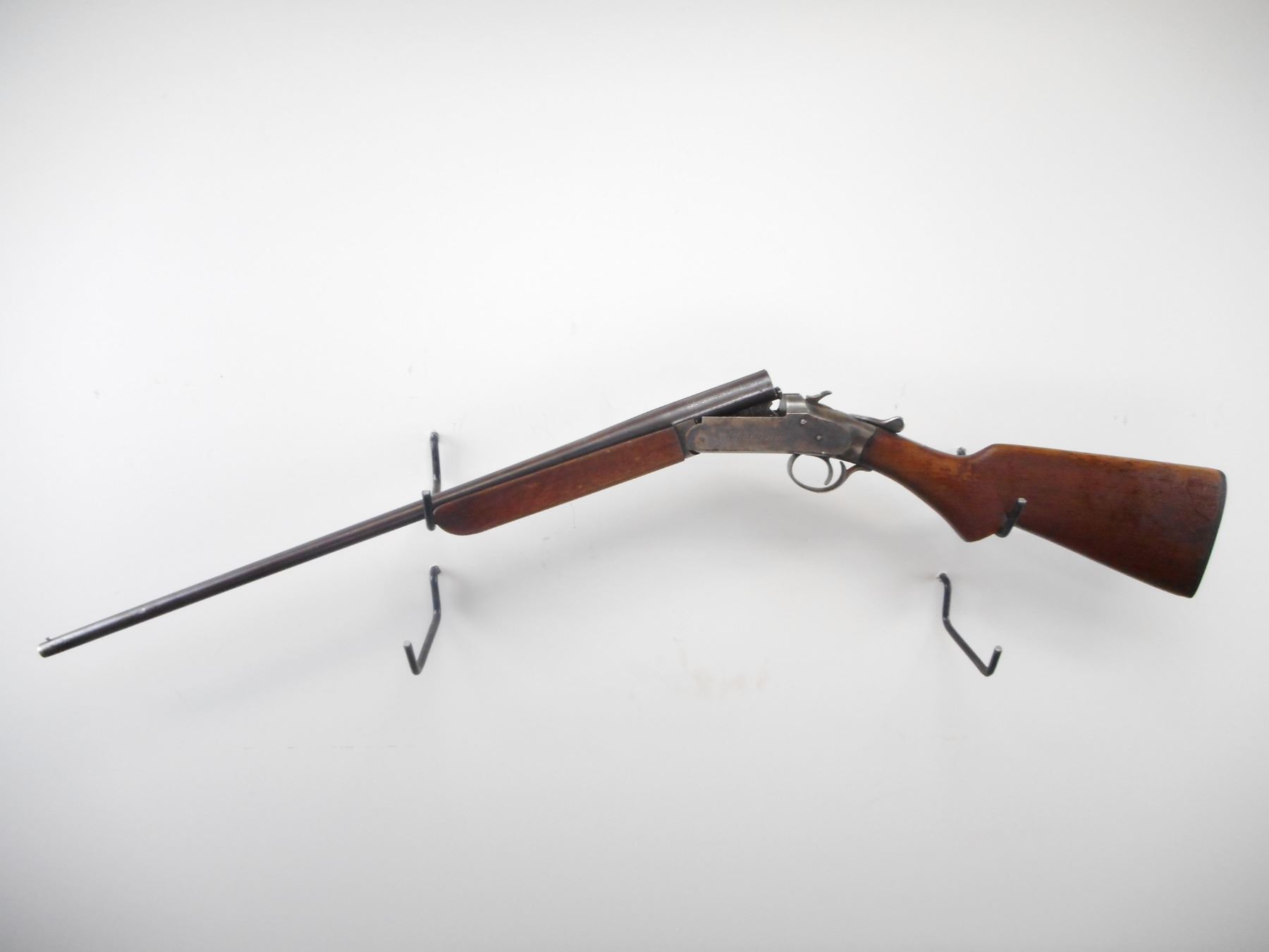 IVER JOHNSON , MODEL: CHAMPION , CALIBER: .410 GA X 3" , FULL CHOKE. BORE IS VERY GOOD. BRASS BEAD. ROUND BLUED BARREL. COLOUR CASE HARDENED RECEIVER. HAMMER SPUR MOTIFIED WITH GROOVES. SMOOTH TOW PIECE WOOD STOCKS. PISTOL GRIP. GROOVED BLACK POLYMER BUTT PLATE. METAL FINISH SHOWS WEAR AND HANDLING MARKS. FOREND HAS TWO HOLES ON RIGHT SIDE. STOCK SHOWS NUMEROUS HANDLING MARKS AND WEAR. , ACTION: HINGE SINGLE SHOT SHOTGUN , BARREL LENGTH: 26" , SERIAL # 21538 , CONDITION: 6/10 , CLASS: CANADIAN NON RESTRICTED CLASS
