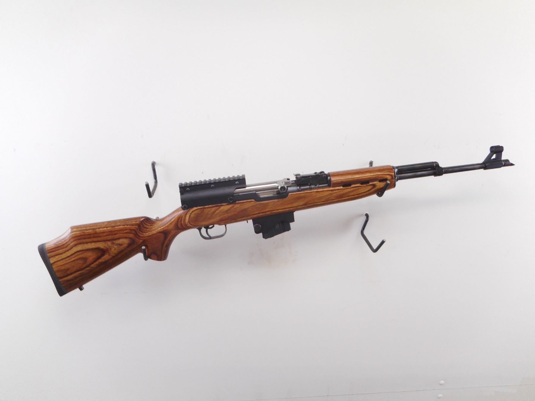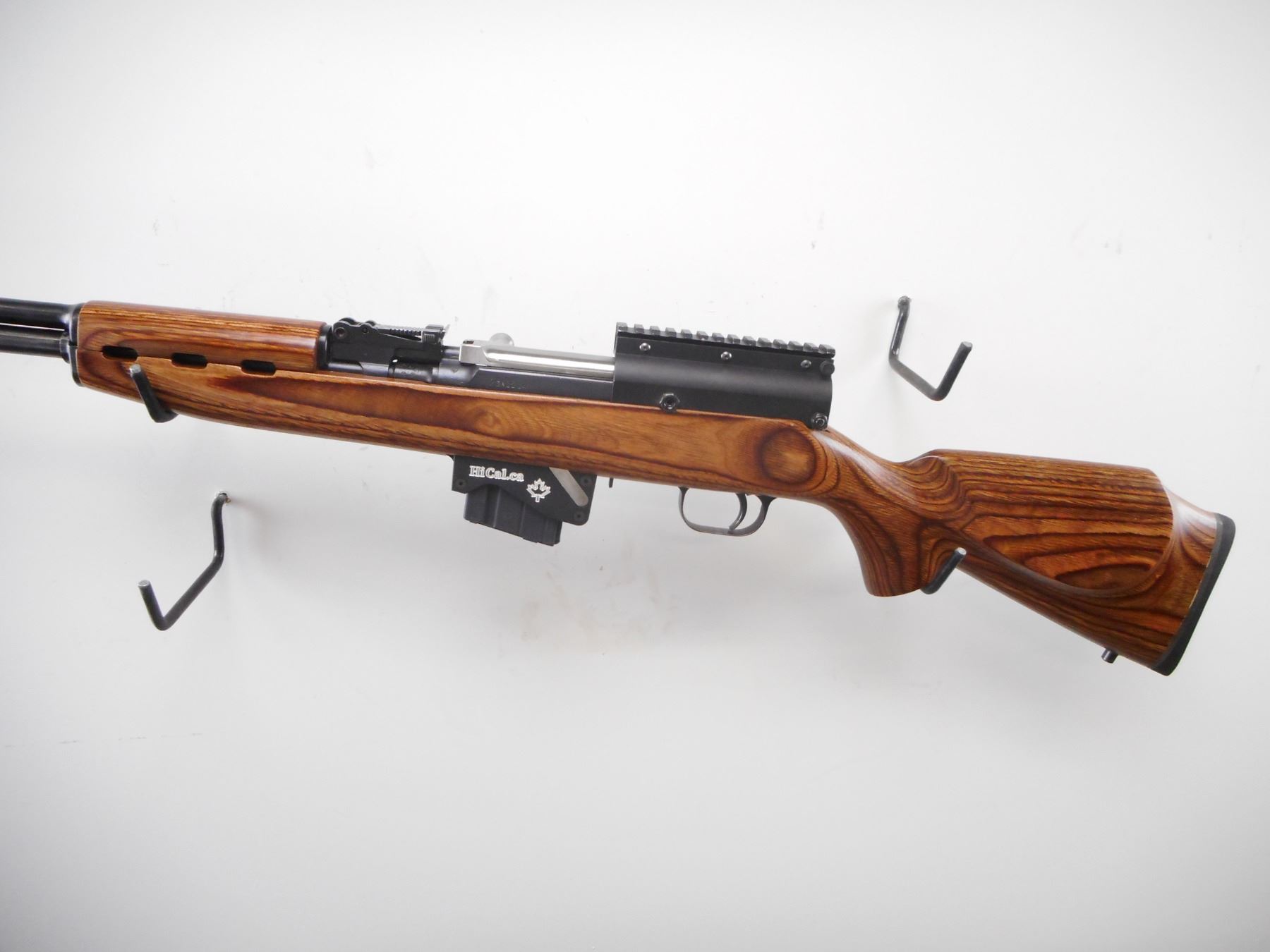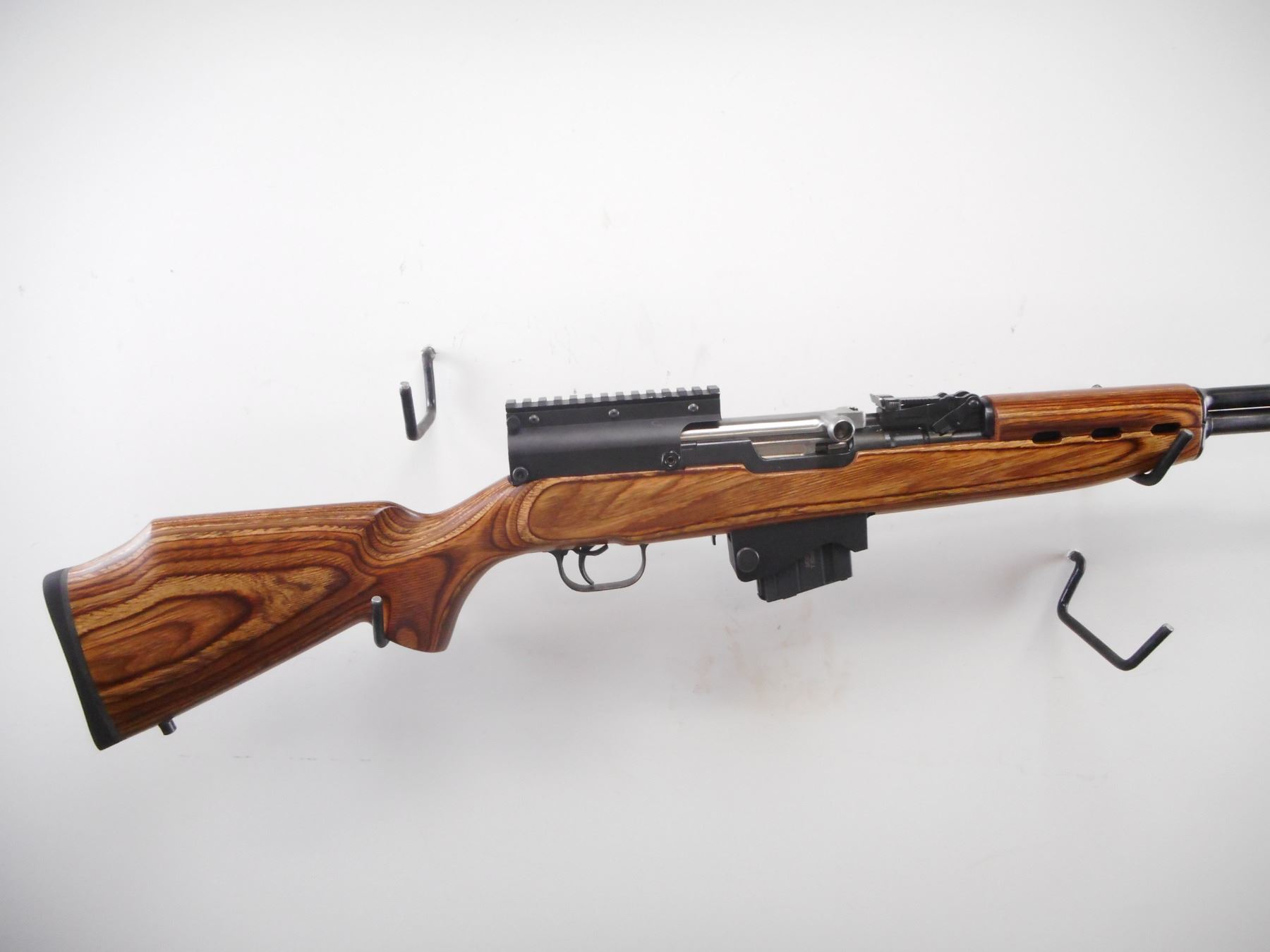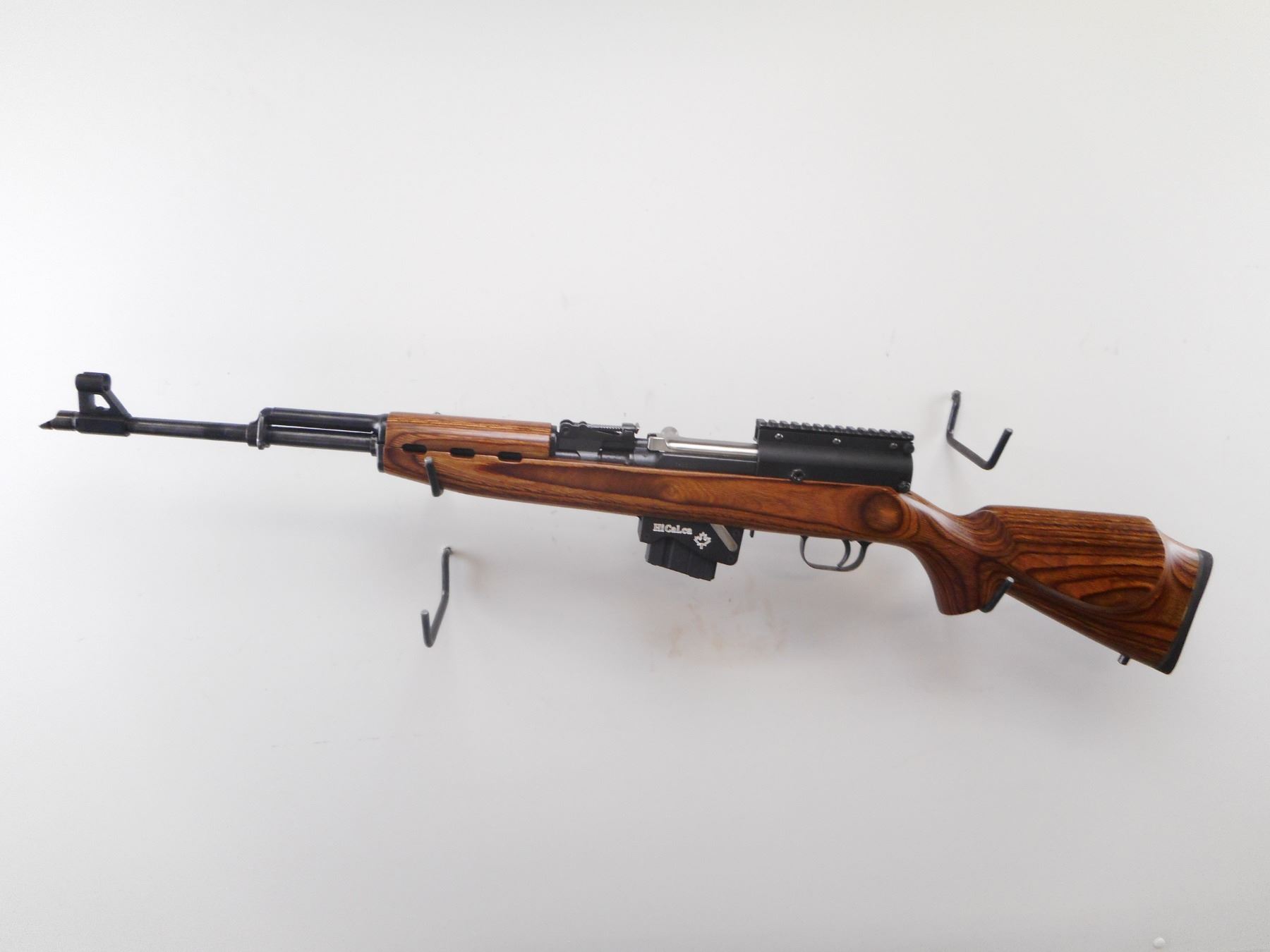 SIMONOV , MODEL: SKS CUSTOM , CALIBER: 7.62 X39 , COMES WITH MAGAZINE. BORE IS EXCELLENT. POST FRONT SIGHT WITH EARS. U NOTCH ADJUSTABLE REAR SIGHT. SCOPE RAIL ON REAR OF RECEIVER. TWO PIECE SMOOTH BROWN LAMINATE STOCK. PISTOL GRIP. CHEEK REST. BLACK RUBBER RECOIL PAD. REAR STUD, FRONT SWIVEL. MAG REPLACED BY HICAL.CA MAG WELL. METAL FINISH SHOWS SLIGHT HANDLING MARKS AND WEAR. STOCK SHOW SLIGHT HANDLING MARKS AND WEAR. , ACTION: SEMI AUTO RIFLE , BARREL LENGTH: 19 1/2" , SERIAL # 3E2224 , CONDITION: 8/10 , CLASS: CANADIAN NON RESTRICTED CLASS