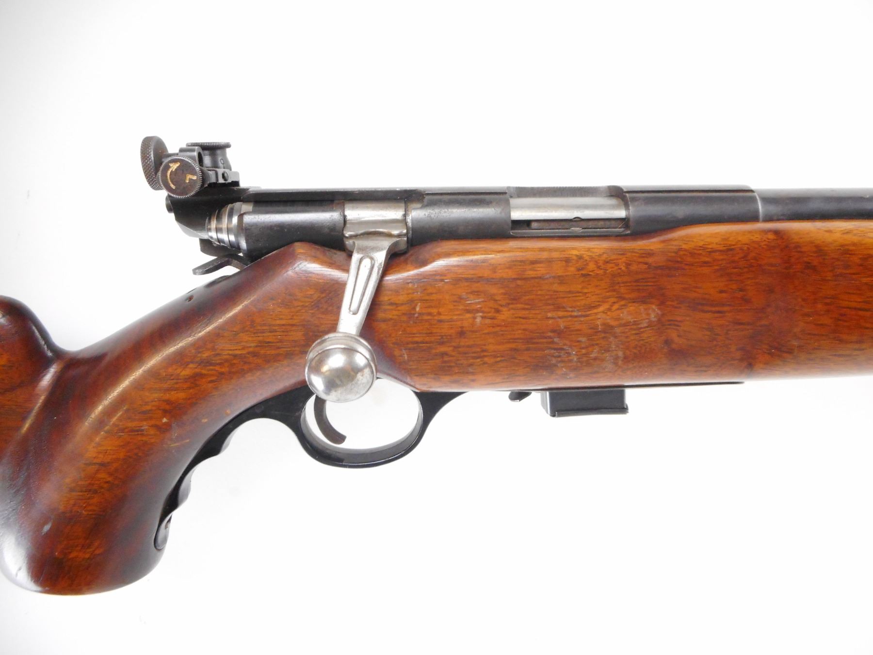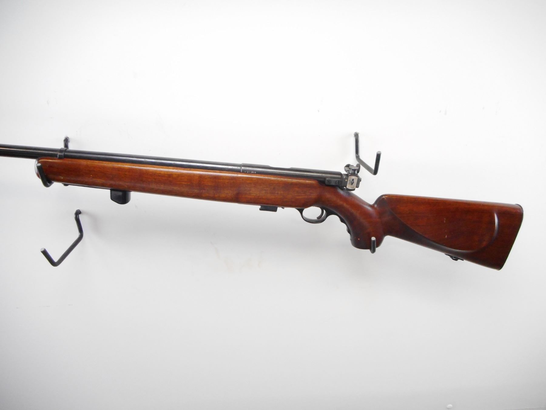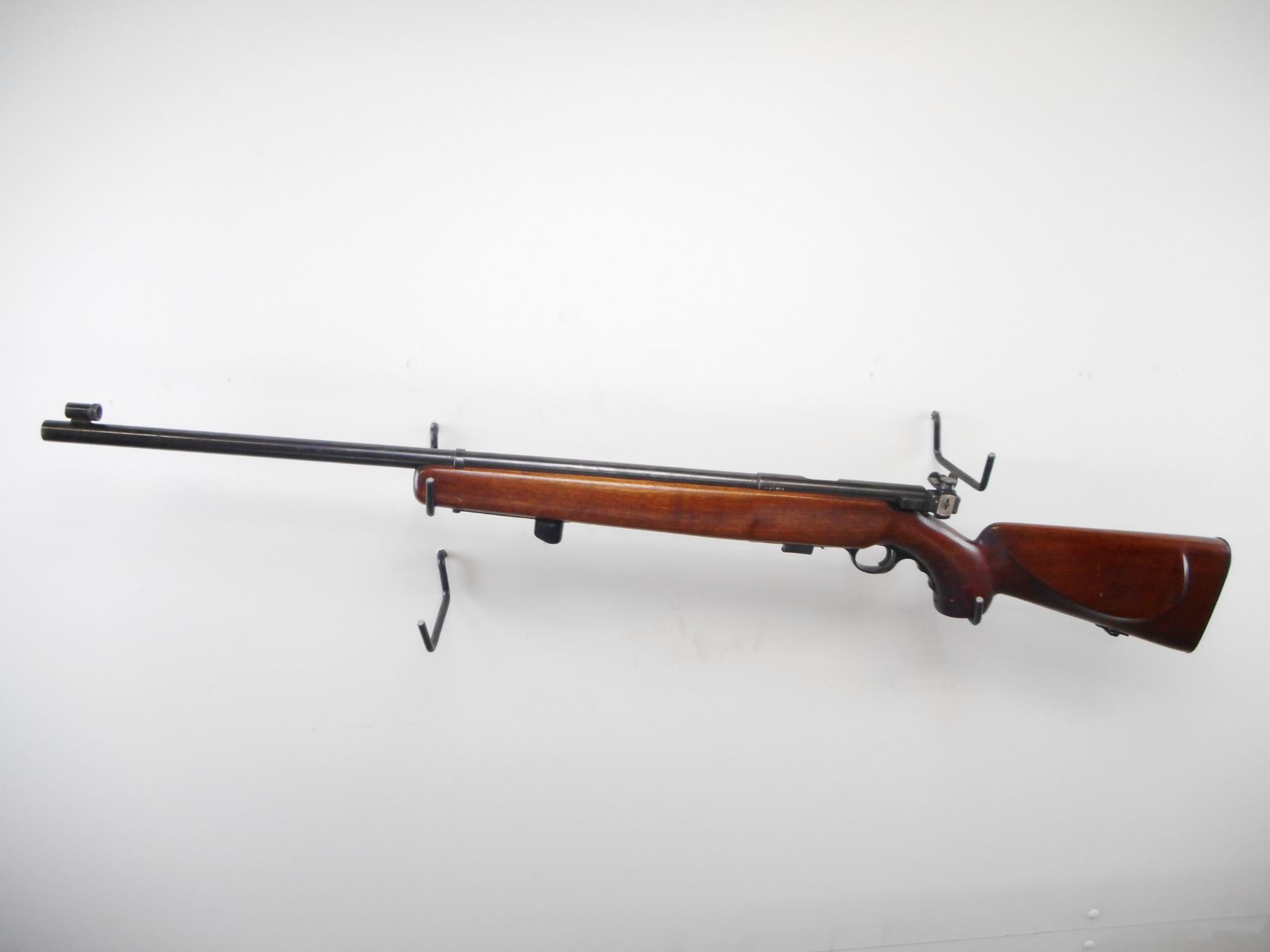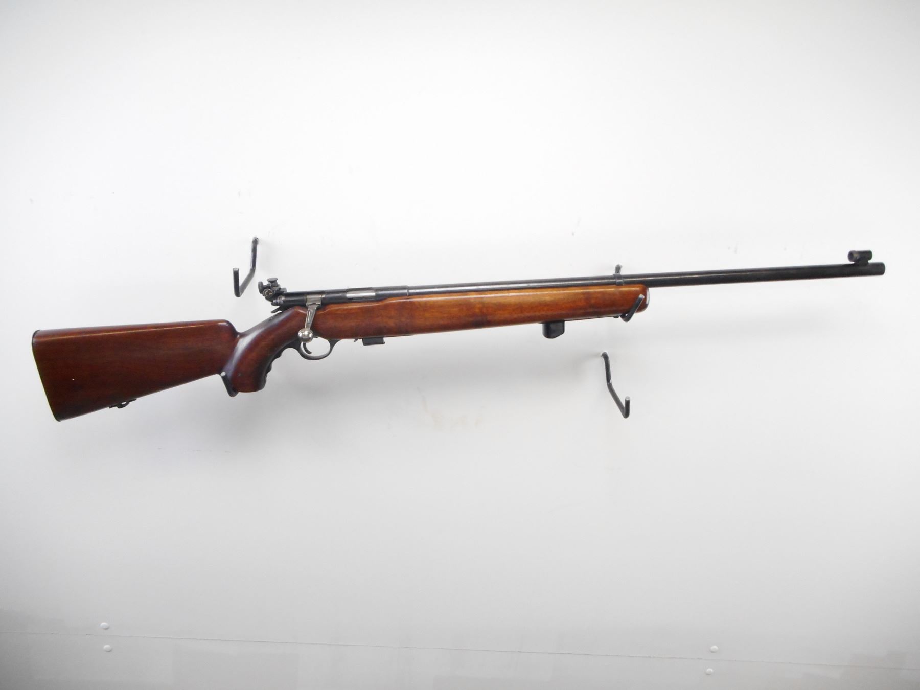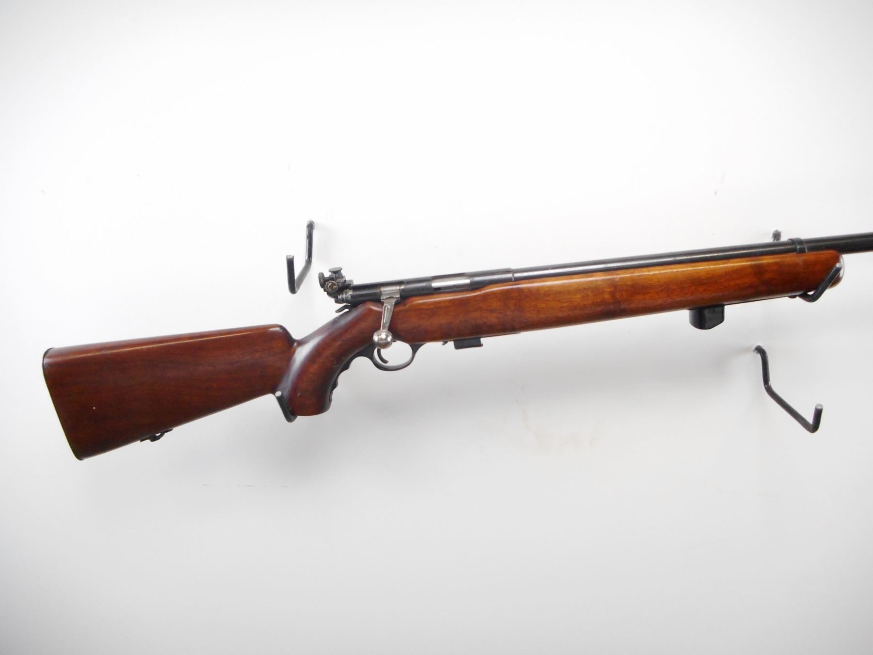 MOSSBERG , MODEL: 144-LS , CALIBER: 22 LR , COMES WITH MAGAZINE. BORE IS VERY GOOD. GLOBE FRONT SIGHT WITH INSERT, LYMAN PEEP SIGHT ON RECEIVER. RECEIVER GROOVED FOR SCOPE MOUNT. MEDIUM WEIGHT BARREL. ONE PIECE TARGET STYLE WOOD STOCK. PISTOL GRIP. CHEEK REST. GROOVED STEEL BUTT PLATE. POLYMER TRIGGER GUARD. ADJUSTABLE HAND STOCK. BLUEING SHOWS HANDLING MARKS AND WEAR. STOCK SHOWS DINGS HANDLING MARKS AND WEAR. , ACTION: BOLT ACTION RIFLE , BARREL LENGTH: 26" , SERIAL # 08767 , CONDITION: 7/10 , CLASS: CANADIAN NON RESTRICTED CLASS