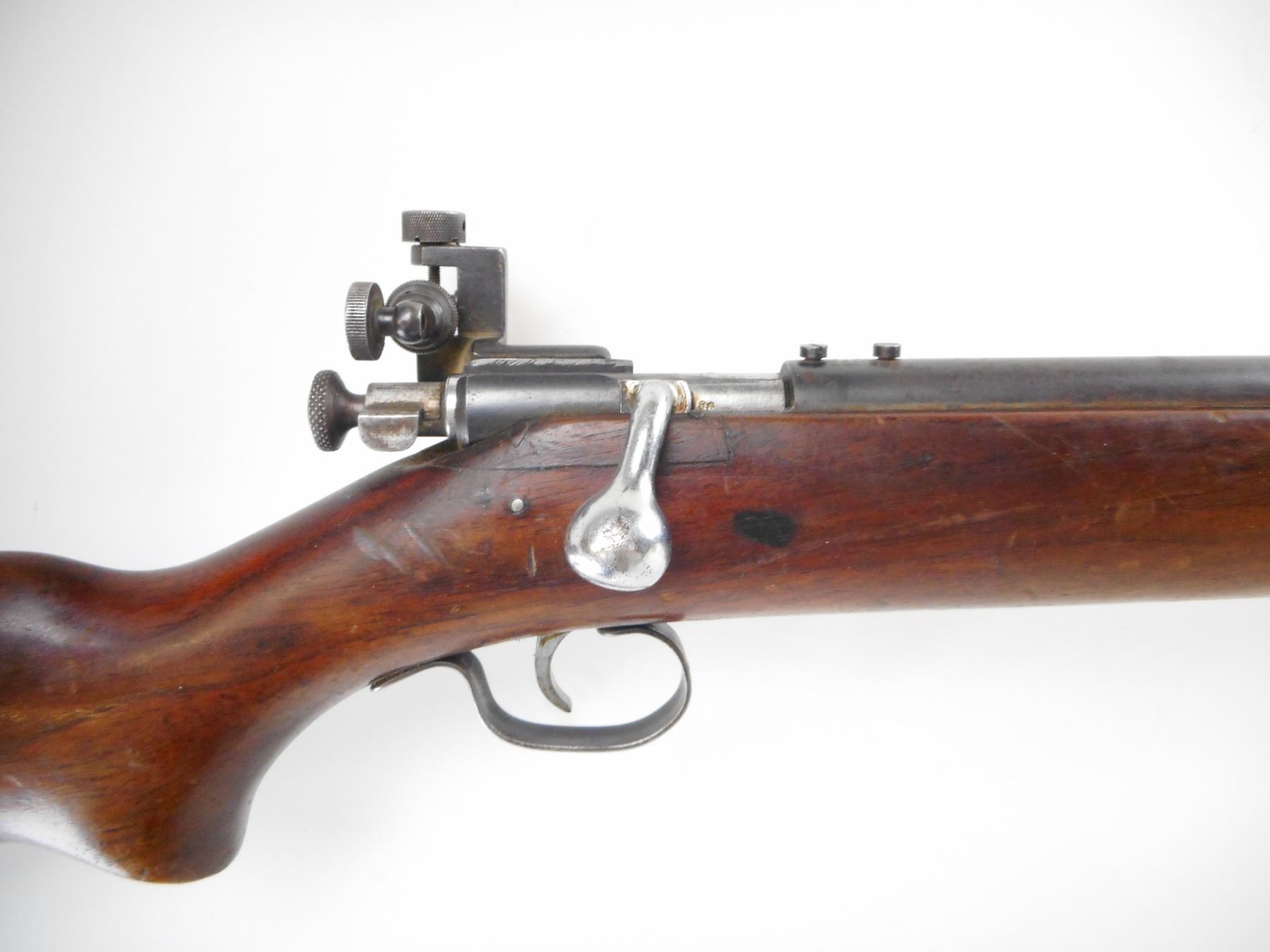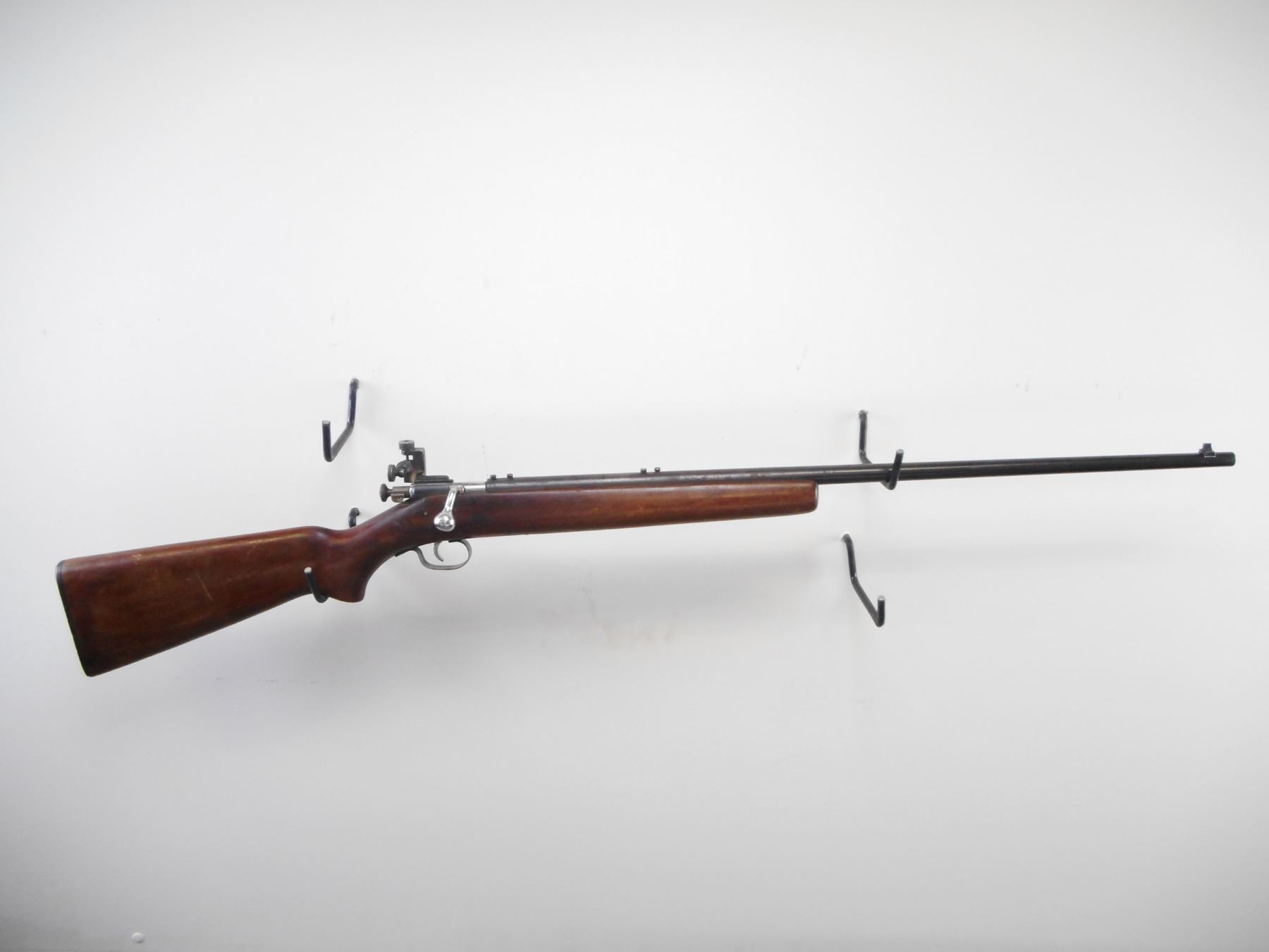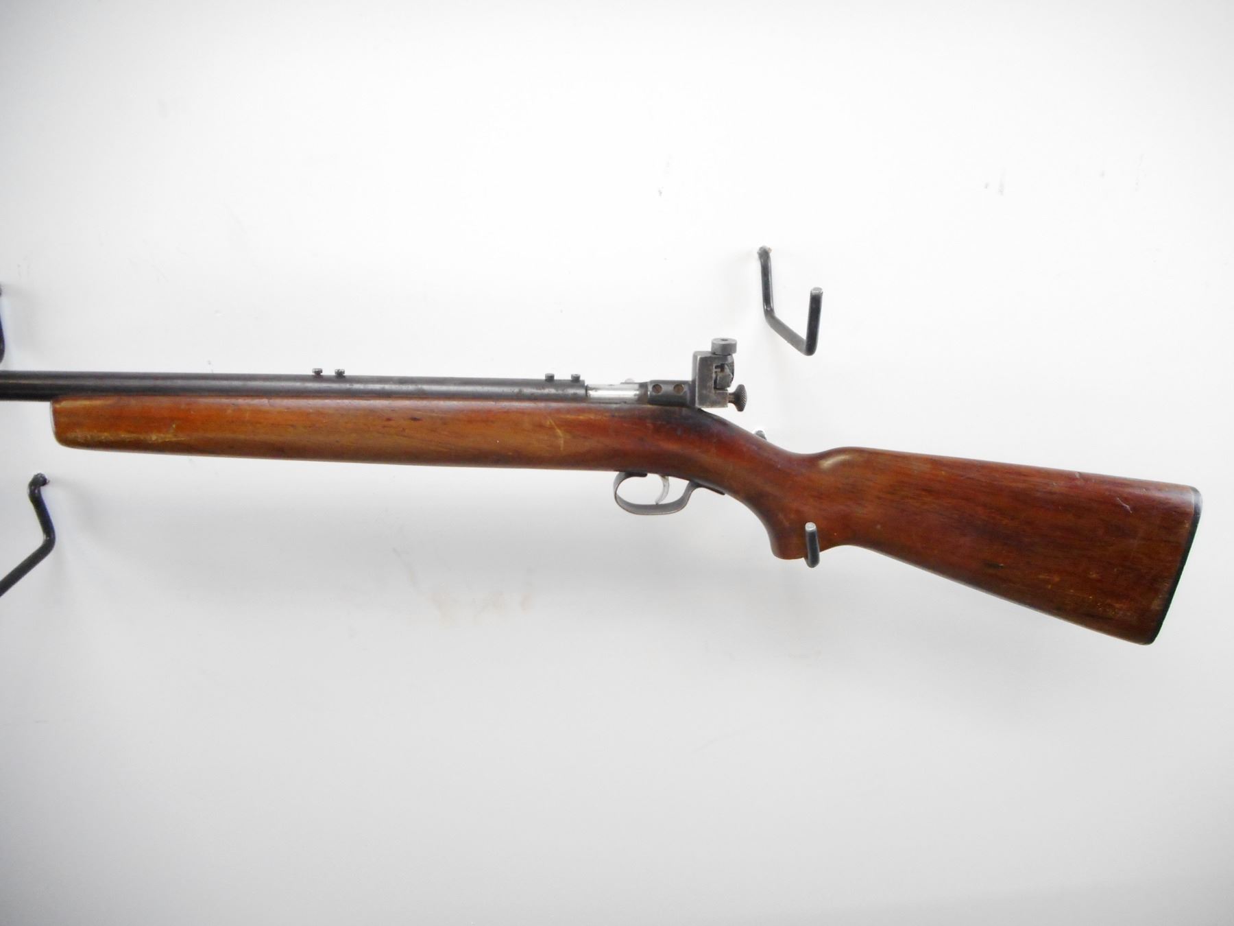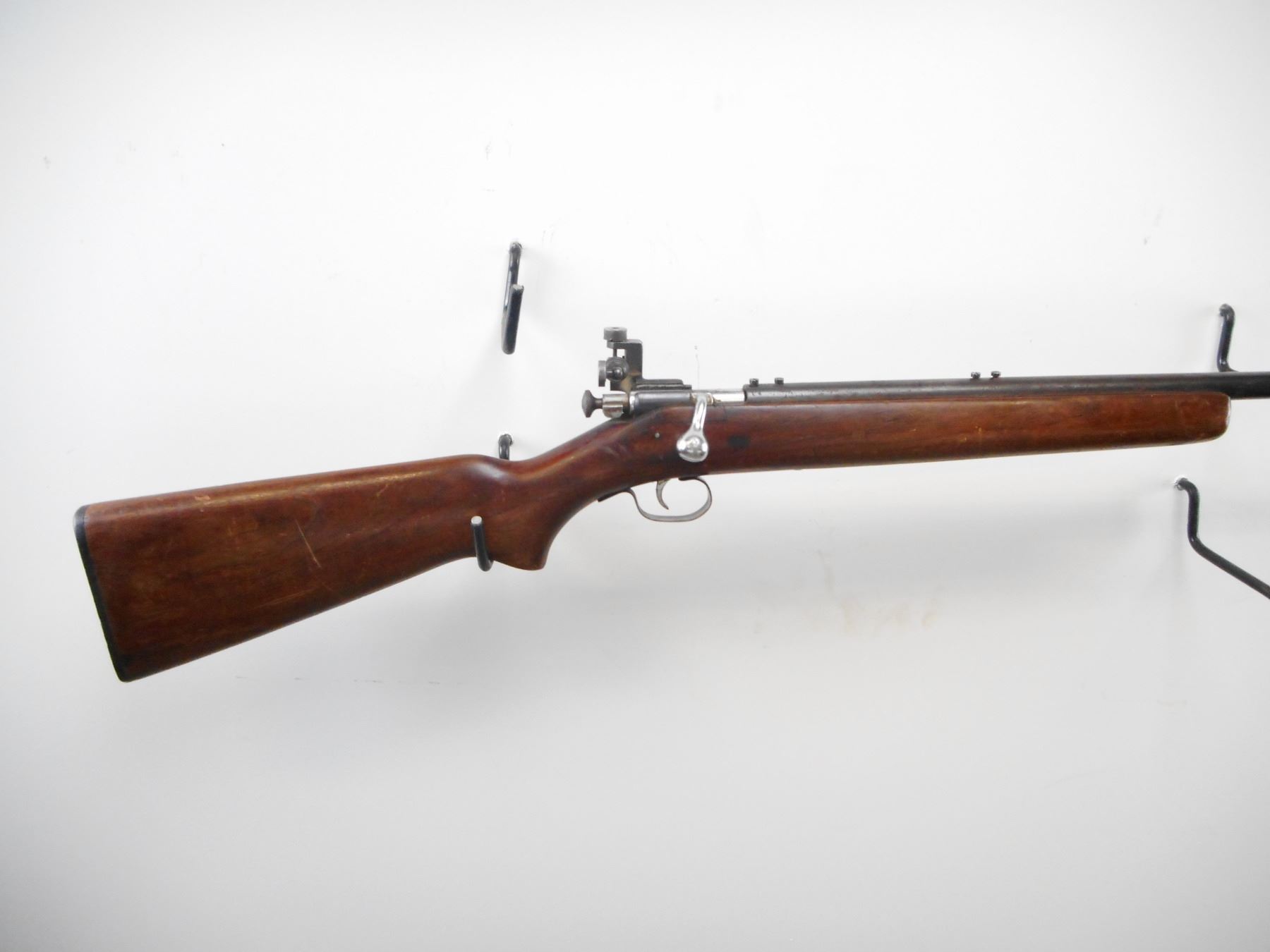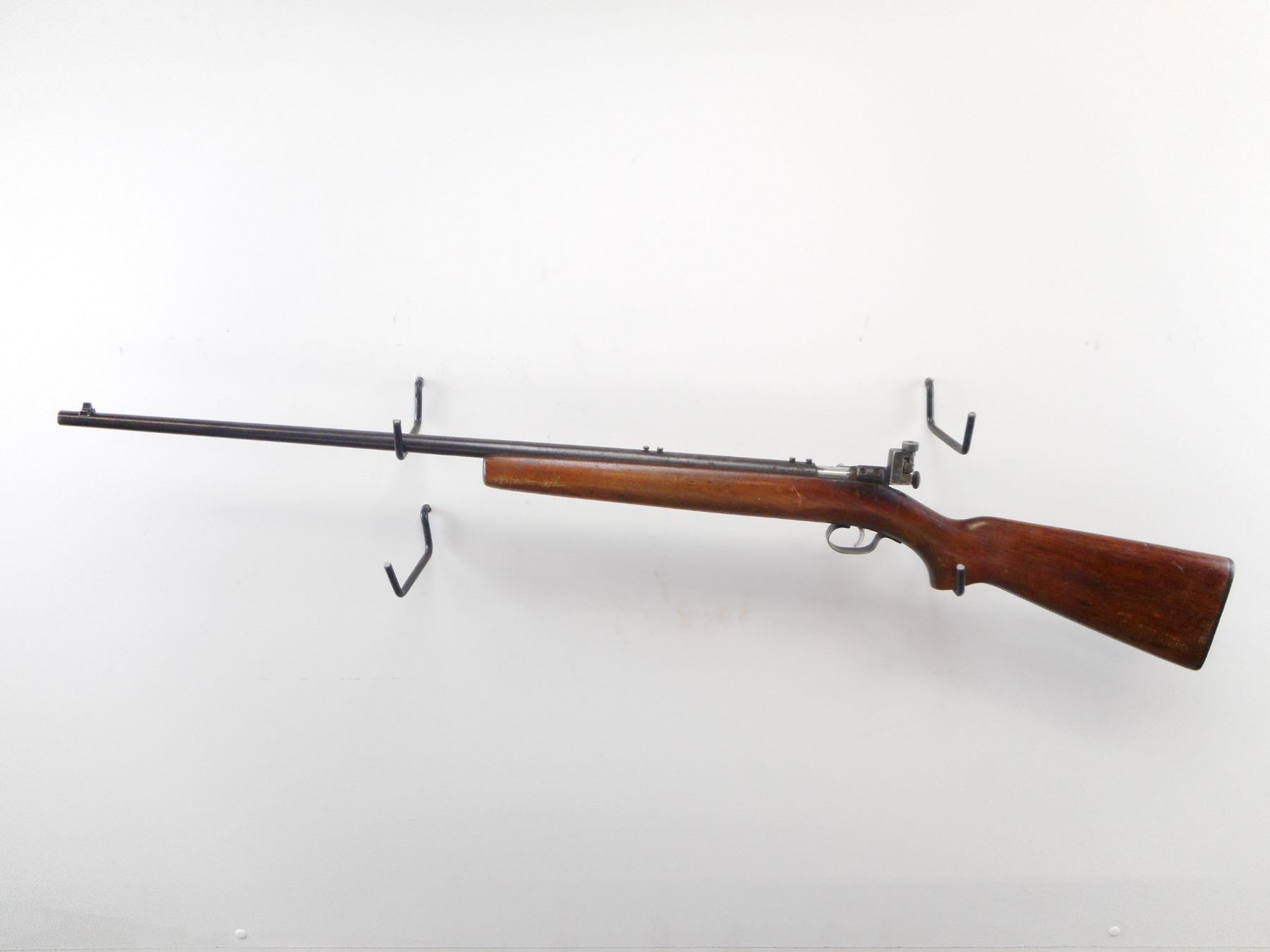 WINCHESTER , MODEL: M192 , CALIBER: 22 LR , BORE IS VERY GOOD. BLADE FRONT SIGHT. PARKER HALE PH16 ON RECEIVER. BARREL DRILLED AND TAPPED FOR MOUNTS. SCREWS IN HOLE. NO WINCHESTER MARKS ON BARREL. MARKED M192. 1949. VARIOUS BRITISH PROOF MARKS. SMOOTH ONE PIECE WOOD STOCK. CHECKERED BLACK POLYMER BUTT PLATE. STEEL TRIGGER GUARD. BLUEING SHOWS WEAR AND LIGHT RUST SPECKLES. STOCK SHOWS NUMEROUS HANDLING MARKS AND DINGS , ACTION: BOLT ACTION RIFLE, SINGLE SHOT , BARREL LENGTH: 27" , SERIAL # EB03925 , CONDITION: 6/10 , CLASS: CANADIAN NON RESTRICTED CLASS