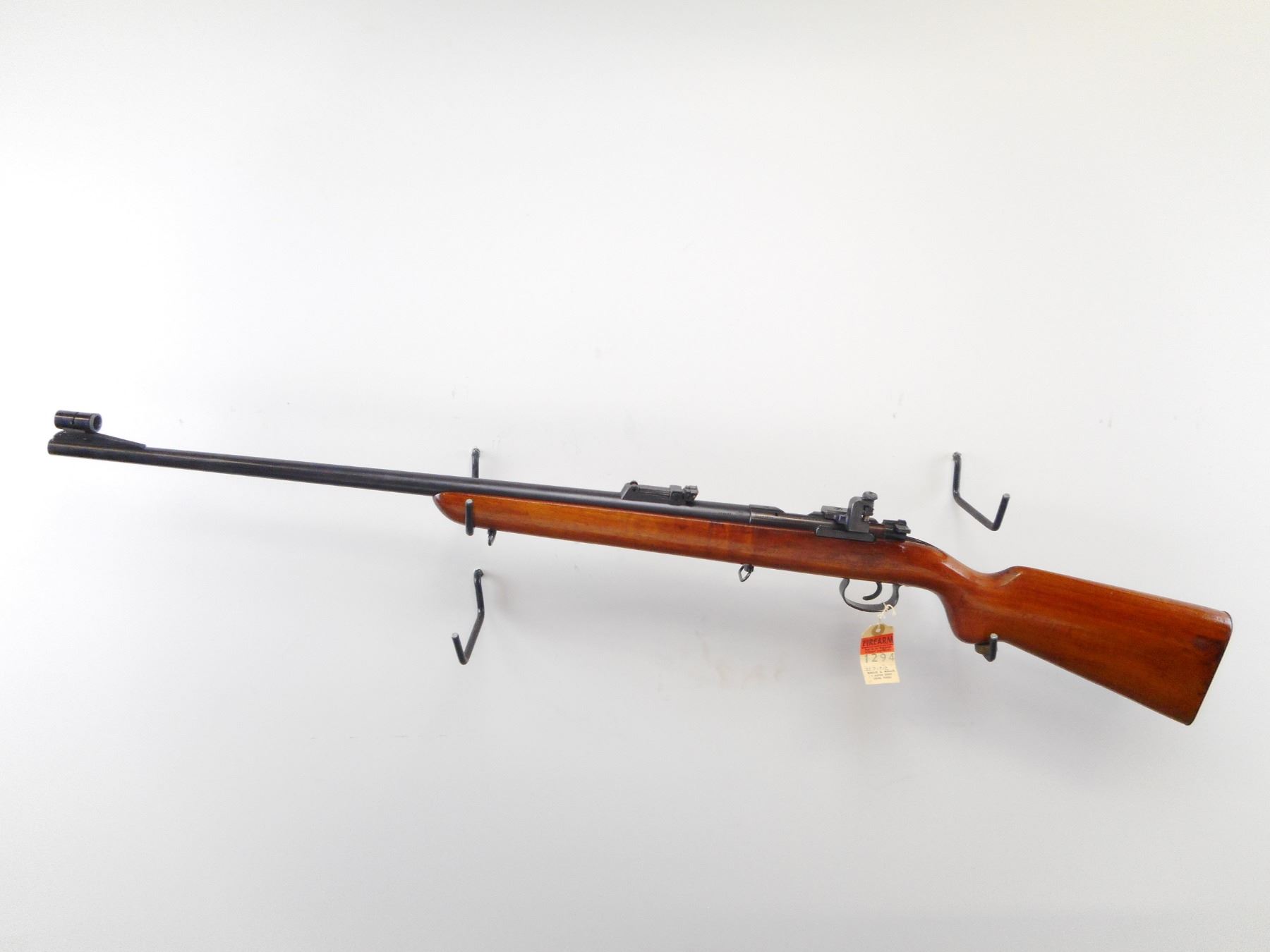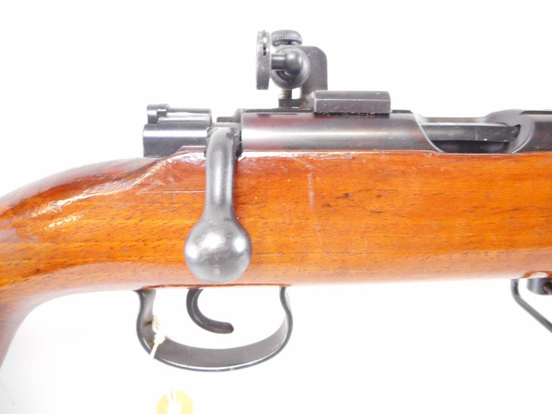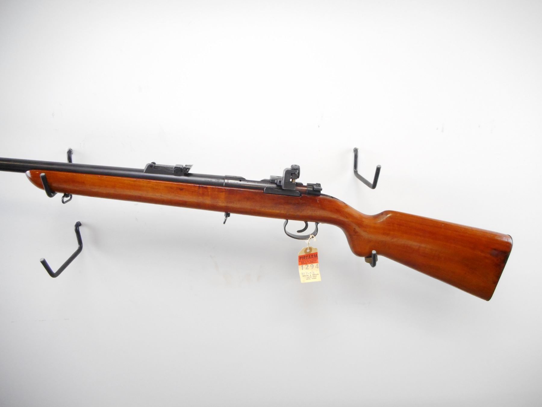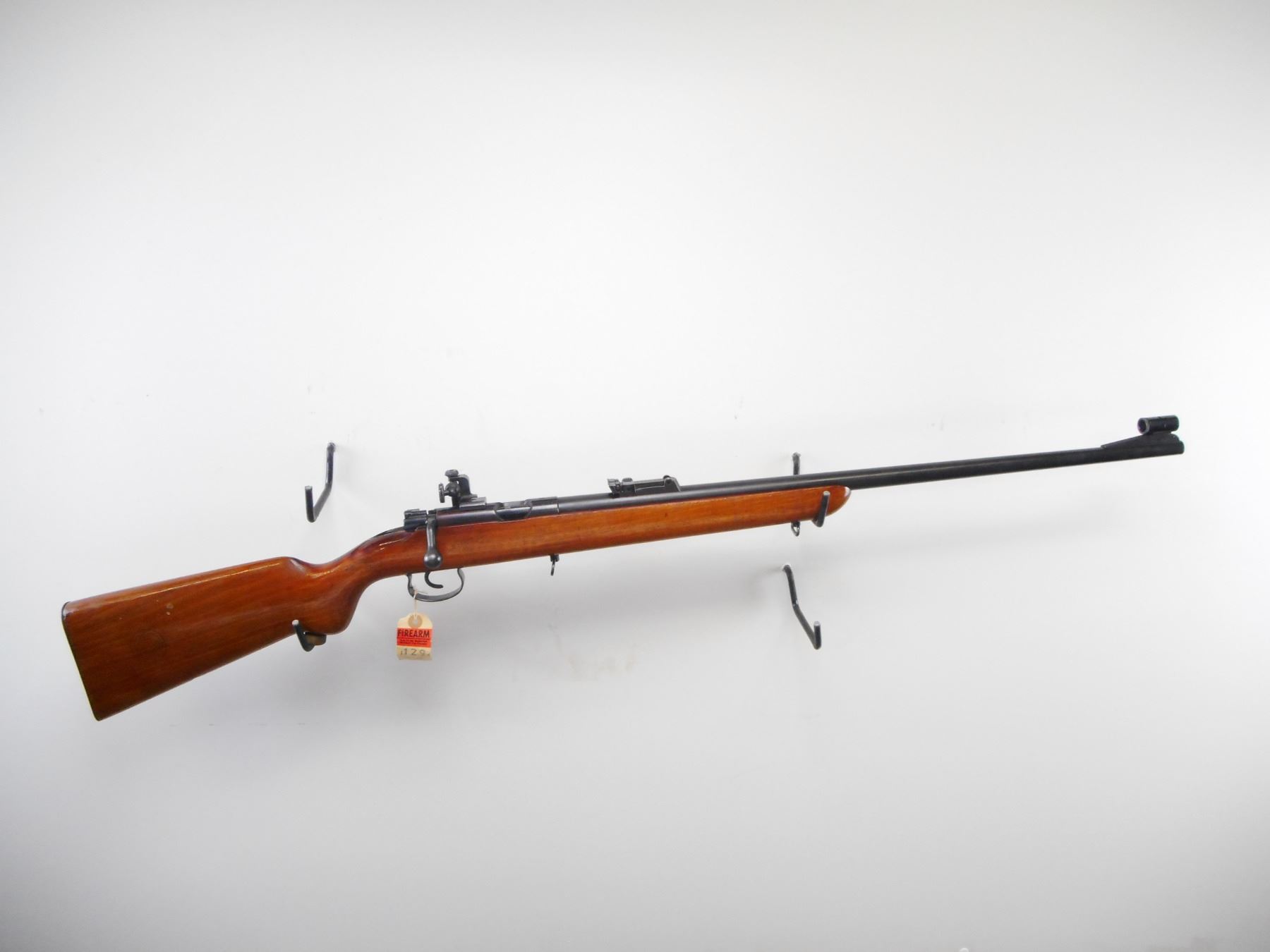 MAUSER , MODEL: SINGLE SHOT BOLT ACTION , CALIBER: 22 LR , BORE IS VERY GOOD. PARKER HALE GLOBE FRONT SIGHT, WITH EXTRA INSERTS. U NOTCH ADJUSTABLE REAR SIGHT. PARKER HALE PH16E PEEP SIGHT ON RECEIVER GROOVE. BLUED FINISH ON METAL PARTS. BOLT RESEMBLES 98 MAUSER. ONE PIECE SMOOTH WOOD STOCK. SMOOTH STEEL BUTT PLATE. SLING SWIVELS. STOCK AND BUTT PLATE HAVE MAUSER LOGO. METAL FINISH SHOWS HANDLING MARKS, SCRATCHES AND WEAR. STOCK SHOWS HANDLING MARKS, AND DINGS. , ACTION: BOLT ACTION SINGLE SHOT , BARREL LENGTH: 27" , SERIAL # 182137 , CONDITION: 7/10 , CLASS: CANADIAN NON RESTRICTED CLASS