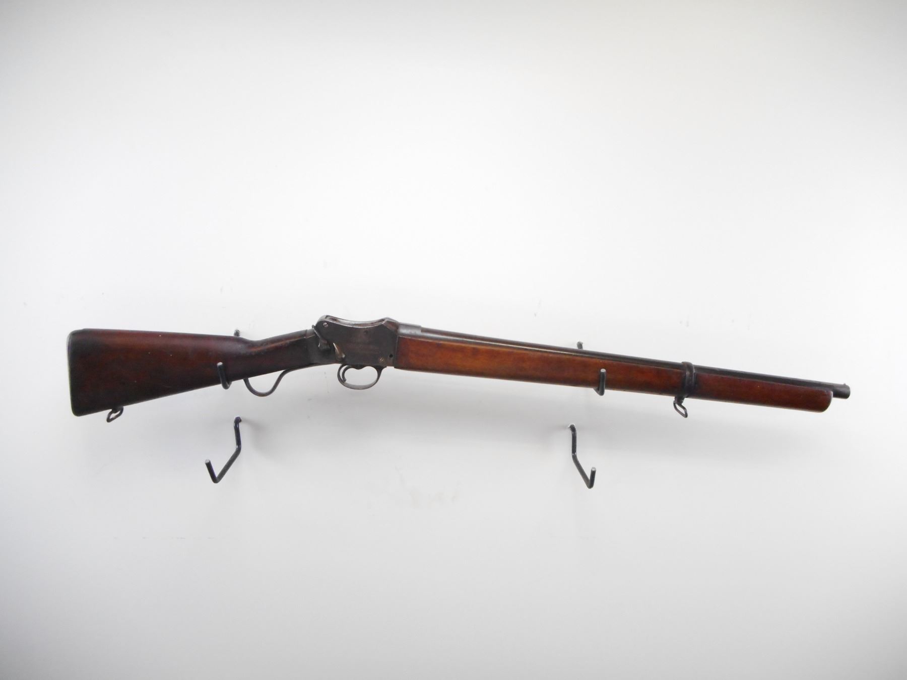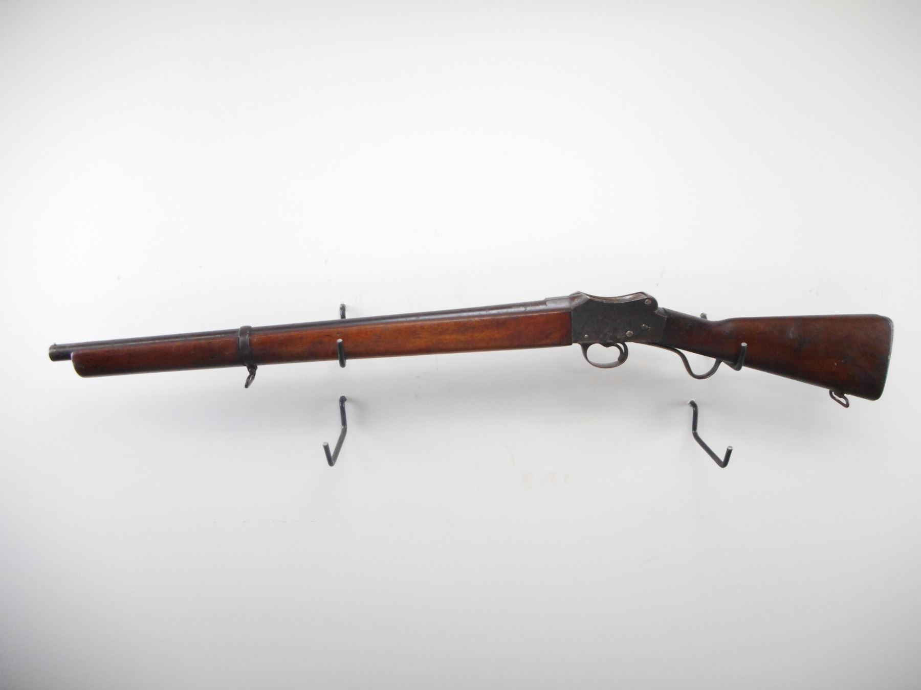 GREENER , MODEL: POLICE GUN , CALIBER: 14 GA , FULL CHOKE. BORE IS VERY GOOD. BRASS BEAD. ROUND BARREL. COCKING INDICATOR AND SAFETY ON RIGHT SIDE OF RECEIVER. TWO PIECE SMOOTH WOOD STOCKS. FULL LENGTH FOREND WITH BAND. STRAIGHT GRIP. SMOOTH STEEL BUTT PLATE WITH TRAP. SHORT LEVER. SLING SWIVELS. ISERALI PROOF MARKS ON RECEIVER. FOREND CRACKED AND REPAIRED ON LEFT SIDE. METAL FINISH TURNING BROWN SHOWS WEAR. STOCKS SHOWS NUMEROUS HANDLING MARKS AND WEAR. , ACTION: HINGE MARTINI SINGLE SHOT , BARREL LENGTH: 26 1/4" , SERIAL # G4201 , CONDITION: 6/10 , CLASS: CANADIAN NON RESTRICTED CLASS