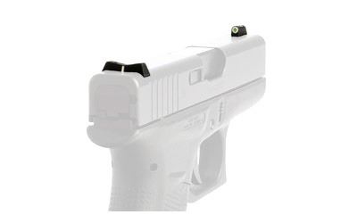 The XS DXW Big Dot night sight is a superior defensive sight set. Fits Glock models 42 & 43. Precision machined in Fort Worth" TX" XS Sights feature a Big Dot Tritium front sight and express rear sight with a white stripe for fast sight acquisition in all light conditions. Big Dot demands your attention - even in high stress and for those with poor eyesight" aids in rapidly achieving combat effective hits. White dot reflects ambient light for best visibility in low light. Shallow V-Notch rear provides an unobstructed view of the front sight" along with a greater field of view down range" especially when moving and shooting. Day-Light" Half-Light" or Low-Light" just "dot the i" and center the dot over your target within 15 yards. Outside Diameter Big Dot 0.188"; fits in common holsters. Installation might require filing to fit sight to dovetail" do not use a sight press/pusher tool.