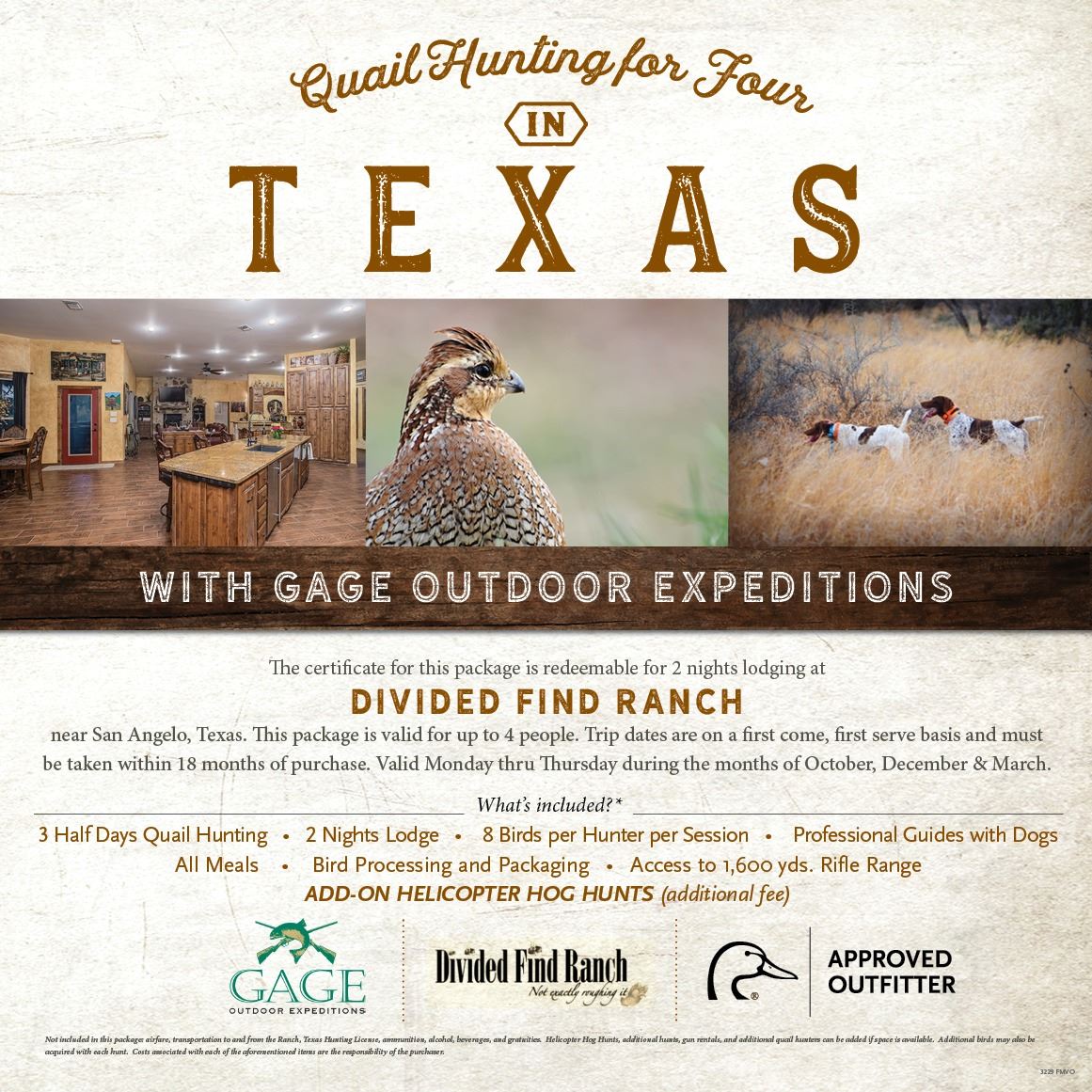 Texas Quail Hunt for 4 – Navigate upstream on the Middle Concho River from San Angelo and you will find yourself in the heart of Texas quail county. Here, grass covered rolling hills adorned with Mesquite, Hackberry and Juniper trees have been managed for wildlife habitat over the past almost 20 years. Gage Outdoor Expeditions introduces you the Divided Find Ranch – this is where your Texas Quail Hunting experience begins! The professionally guided quail hunts at the ranch are tailored for the hunter seeking the wild bird experience. Embrace the excitement as flushing coveys explode from the silence and hug the horizon of the Texas skyline as you anxiously shoulder your first shot. A wild quail population of approximately 70% Bobwhite and 30% Blue Quail is the standard. The Quail Lodge is modern and comfortable with a combination of ranch décor and rich Texas flair. Chef-prepared meals ensure that you enjoy the best dining experience possible, made fresh from all-natural ingredients. A custom-built sports bar is available on the ranch and affords the pleasures of hunting during the day and socializing in the evening. For extra excitement, try an ADD-ON HELICOPTER HOG HUNTS with this package! This bucket list package includes: 2 nights lodging (double occupancy). All meal prepared by an onsite chef (cash bar). 3 professionally guided quail hunts with pointing and flushing dogs. 8 birds privilege per hunter per hunt. Bird Processing and packaging. Access to Trap, Skeet, 5 stand and 1600-yard-long rifle range. For an additional fee, an Add-on Helicopter Hog Hunts (if space is available). Not Included in this package: airfare, transportation to and from the Ranch, Texas Hunting License, ammunition, alcohol, beverages, and gratuities. Helicopter Hog Hunts, additional hunts, gun rentals, and additional quail hunters can be added if space is available. Additional birds may also be acquired with each hunt. Costs associated with each of the aforementioned items are the responsibility of the purchaser. Trip valid for 18 months from the date of purchased, Monday – Thursday, during the months of October, December, and March.