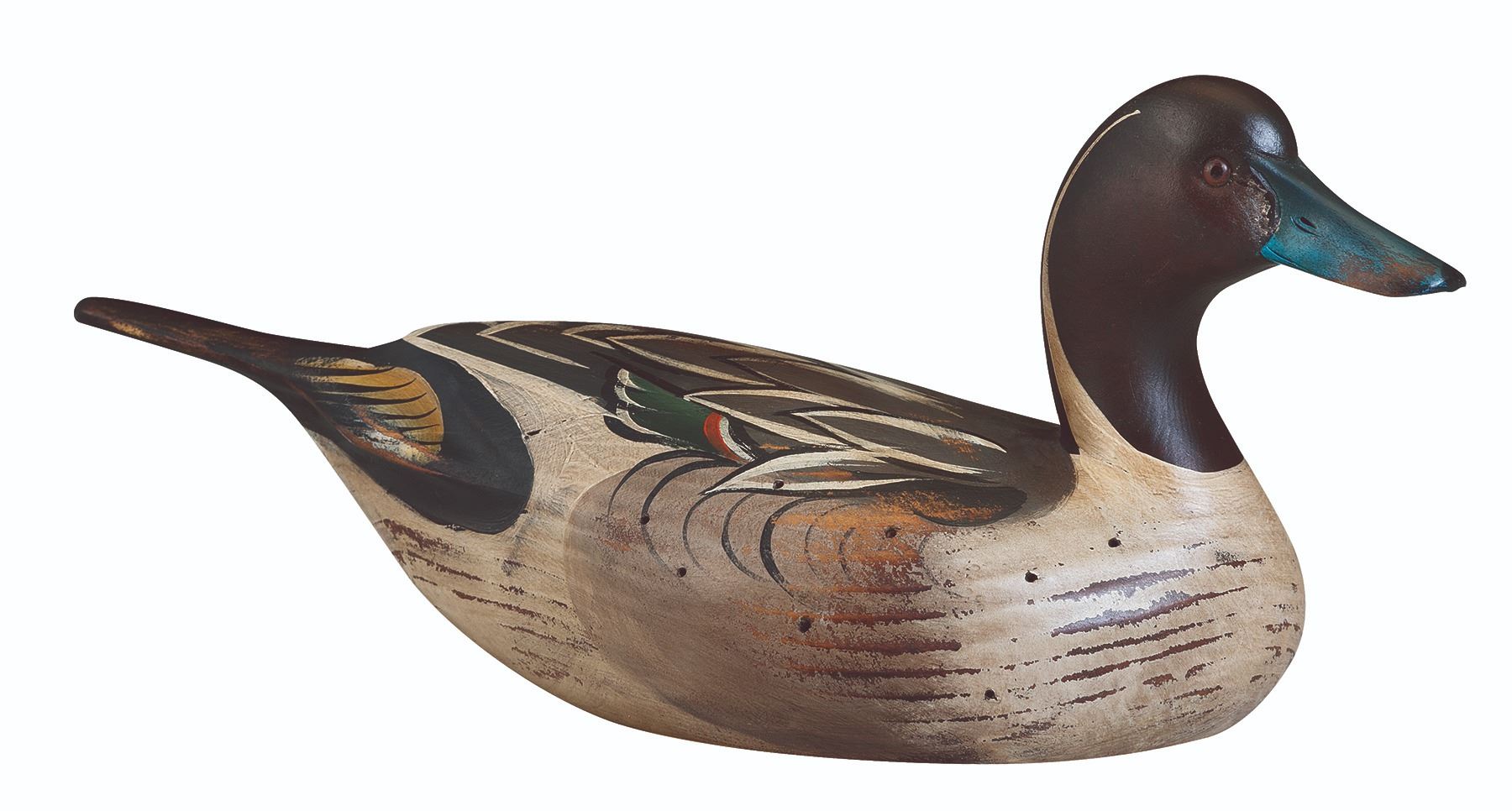 This wooden decoy is a replica is of an original carving by Illinois carver, Jerry Cranwill. The bird is painted in exacting detail with glass eyes. A Ducks Unlimited medallion is inlaid in the felt covered bottom of the bird.