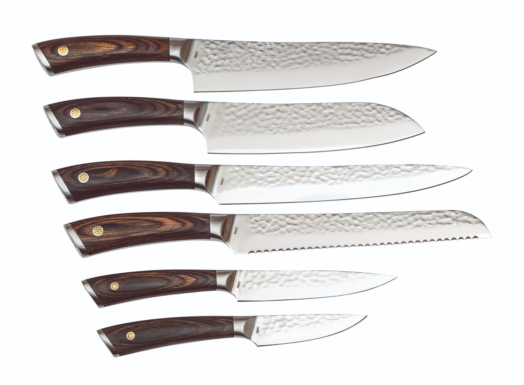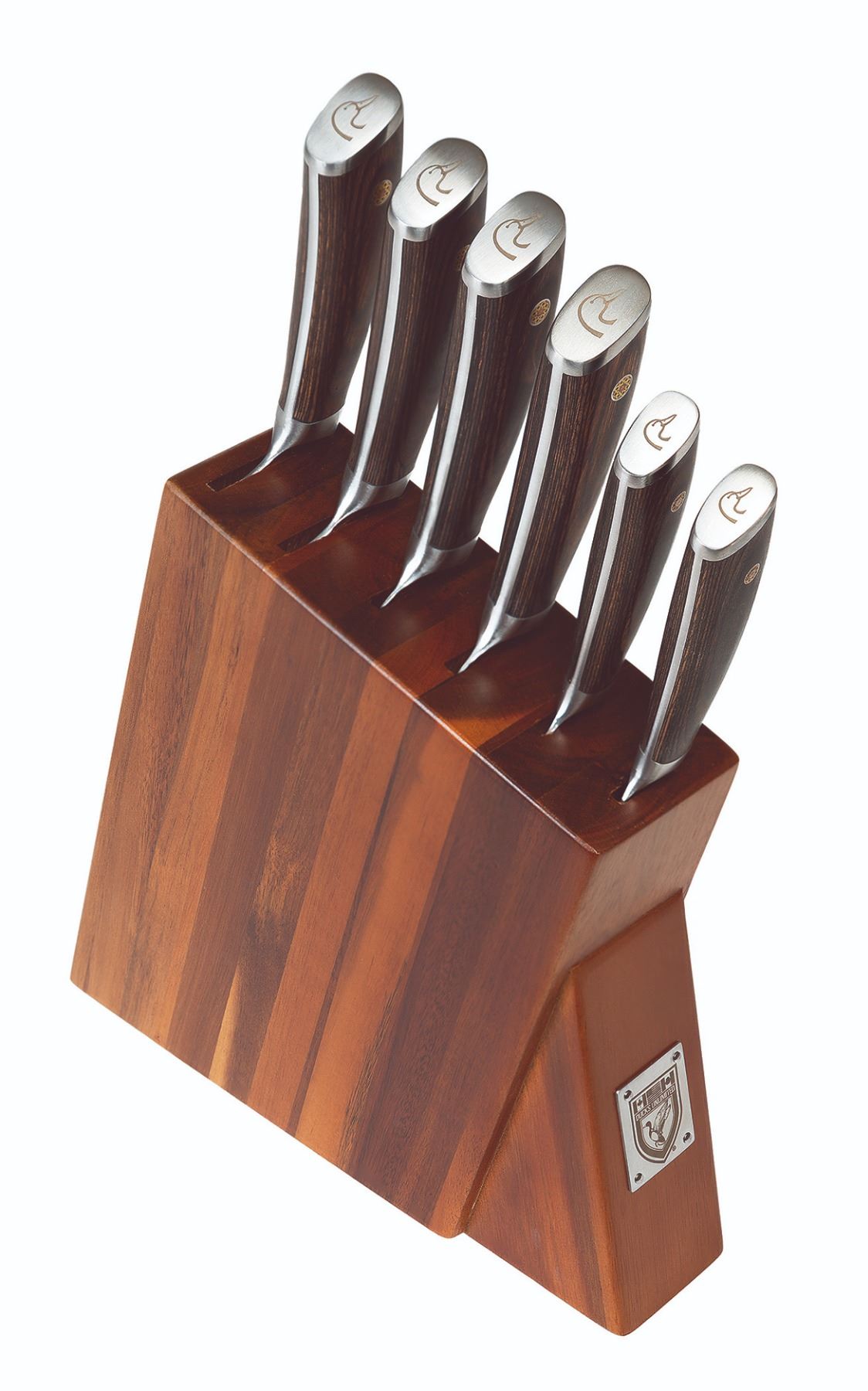 This cutlery set features six knives with unique hammered blades. The knives are housed in a solid wood block affixed with a Ducks Unlimited crest plate. Each knife has a laser engraved DU logo on the butt and a full tang. The set includes an 8” chef, 8” bread, 8” slicing, 7” Santoku, 5” utility, and 3½” paring.