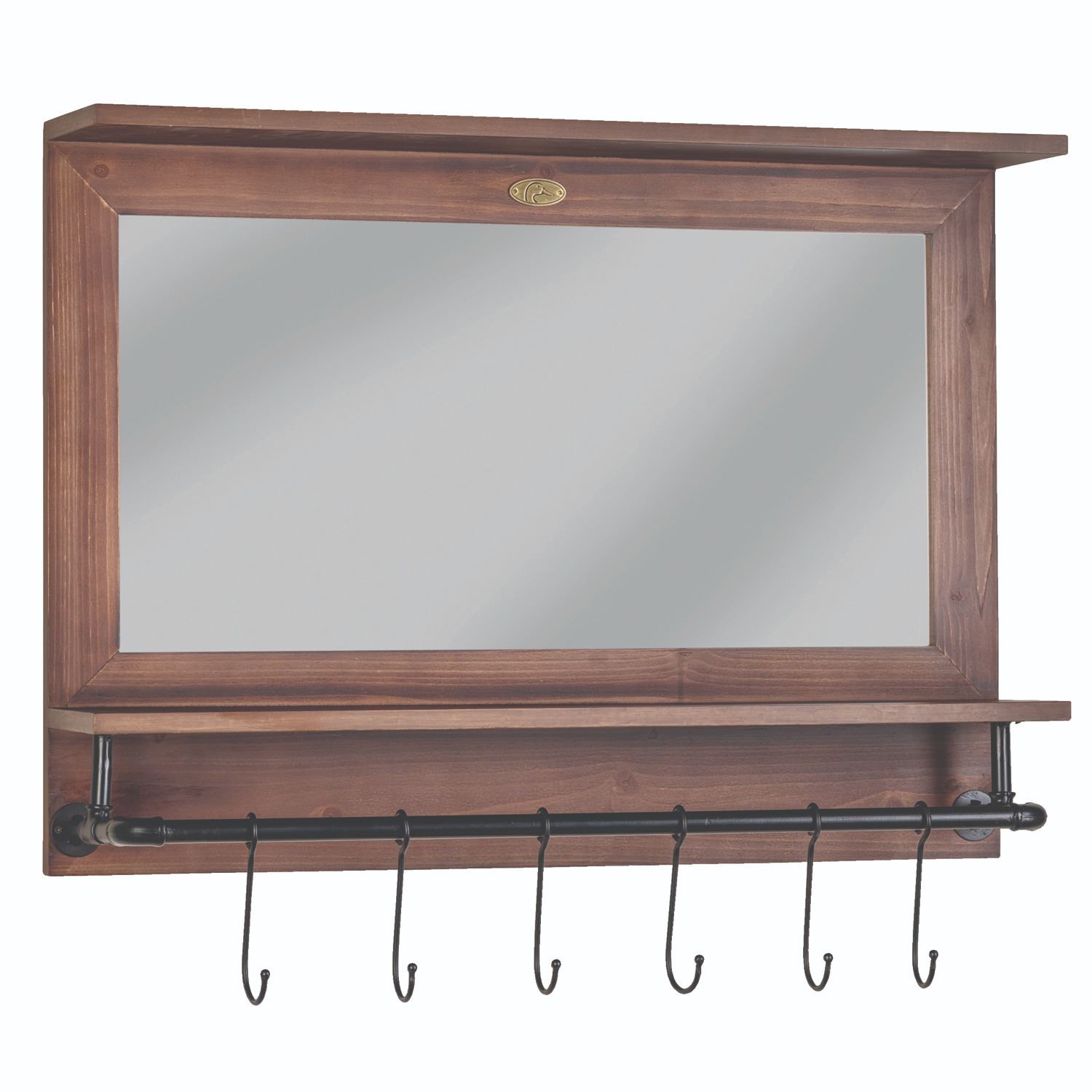 Perfect for holding caps, bags, and other accessories, this industrial wood framed mirror has six movable hooks. It features a brass DU logo plate.