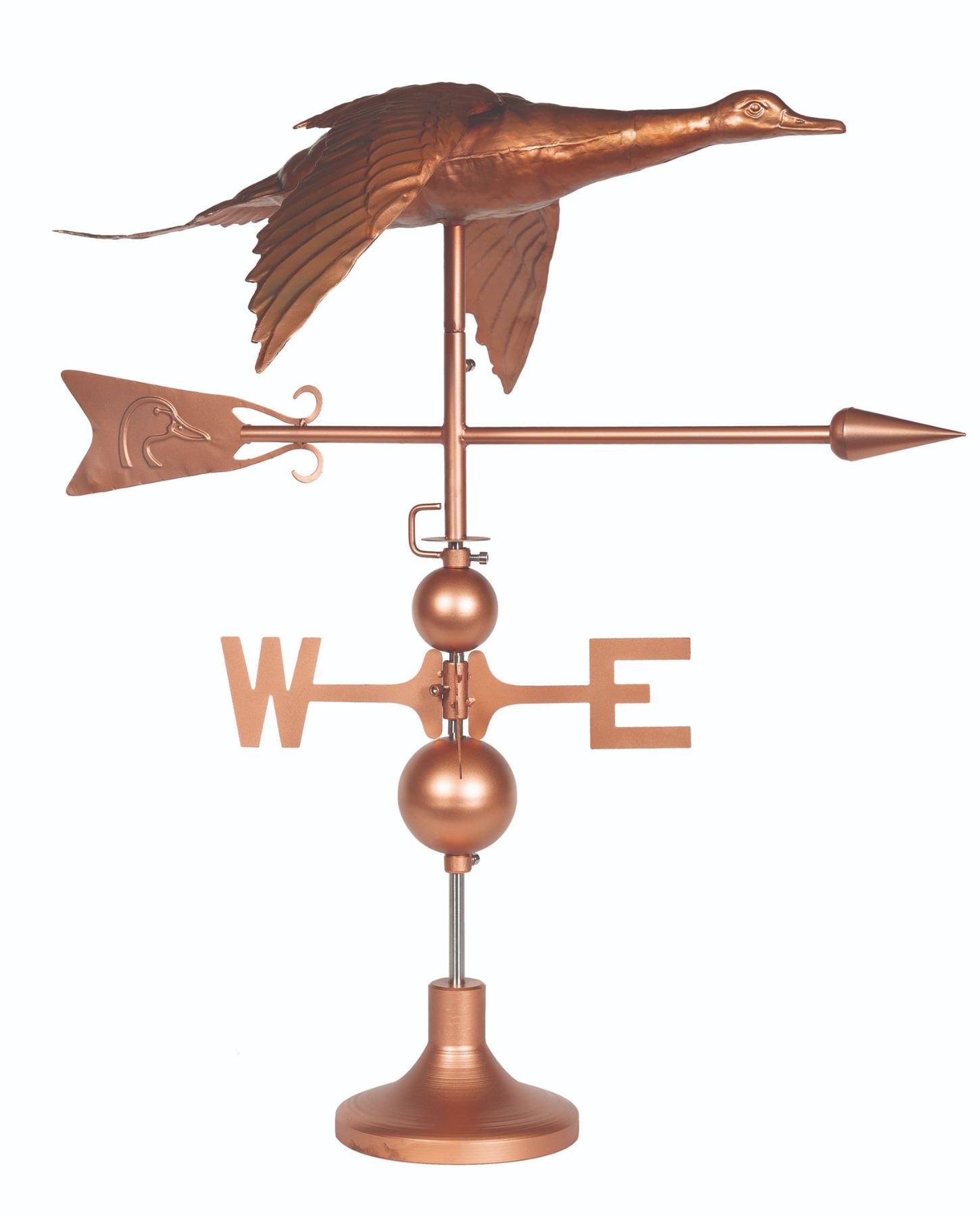 This metal weathervane features a pintail in flight with an arrow indicating wind direction. The DU logo is debossed on the feather of the arrow. The copper finished weathervane offers both a tabletop display and a roof mount option.