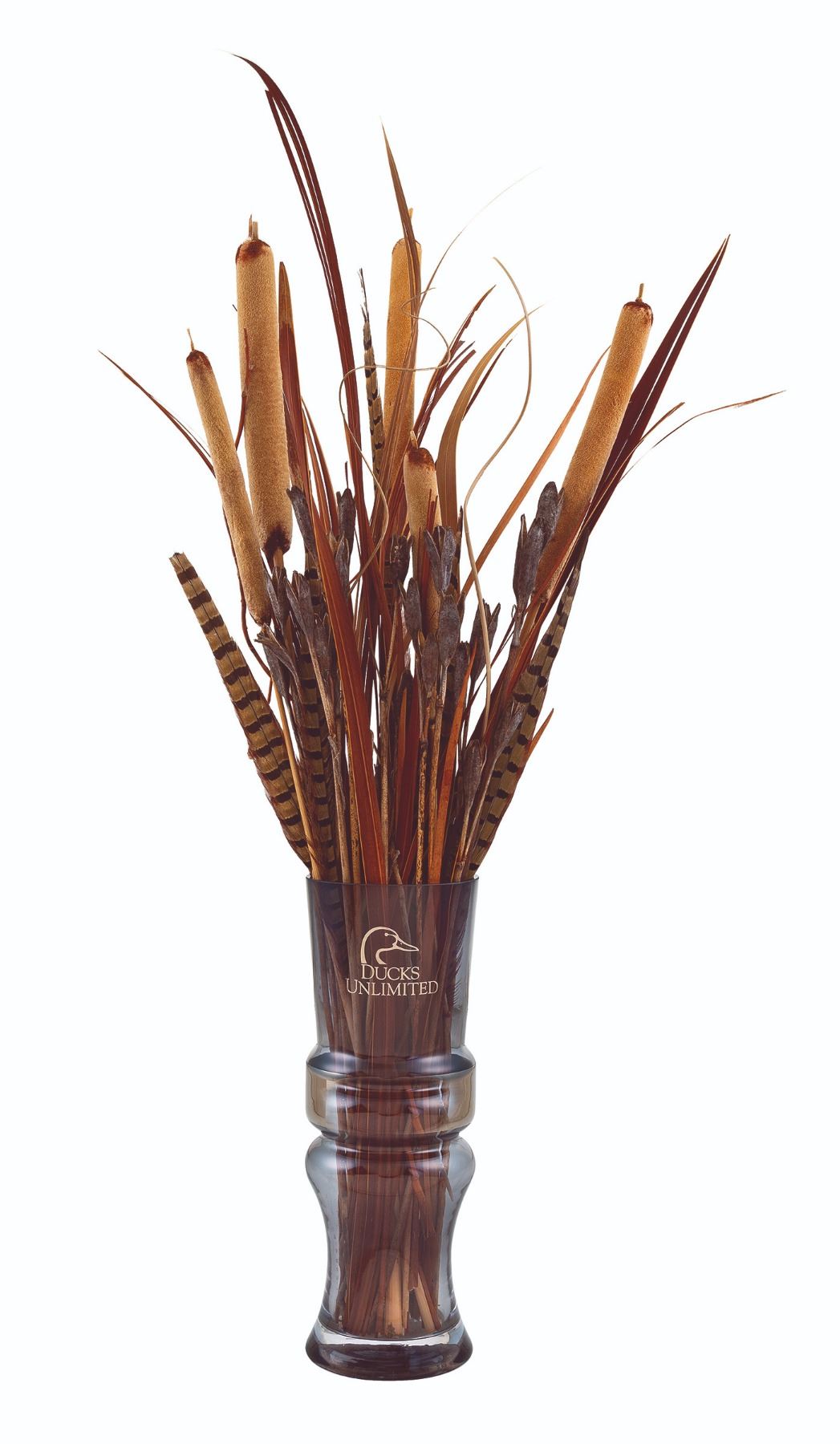 A great way to style any floral arrangement. This glass duck call vase is smoke gray with gunmetal trim and matching Ducks Unlimited logo.