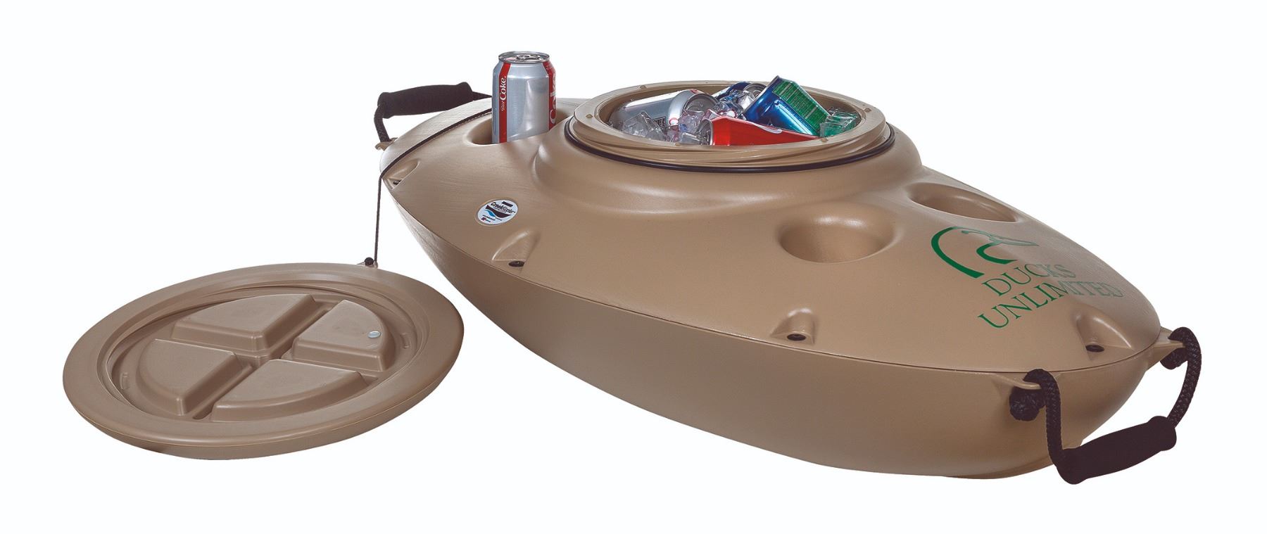 Perfect for staying hydrated in the marsh or on the lake. This floating cooler includes four cup holders, a double-wall blow molded design with foam insulation, padded handles, and a large watertight lid. It holds up to 30 12-ounce cans and 20 pounds of ice with 48-hour ice retention. The tan cooler sports a green Ducks Unlimited logo.