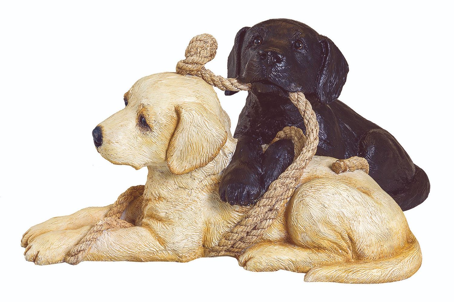 This life-size puppy sculpture features a black and a yellow lab playing with a rope. Ducks Unlimited is printed on the bottom of the sculpture.
