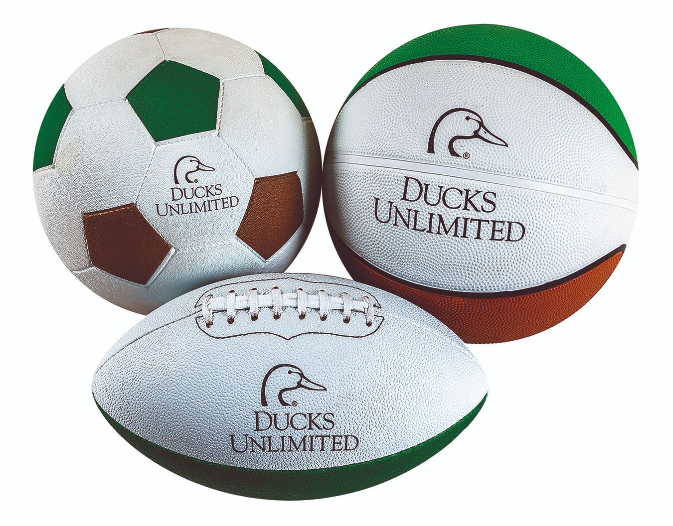 Get active with this DU logo sports ball set. The collection includes a basketball, football, soccer ball, canvas and mesh carrying bag, and pump with needle.