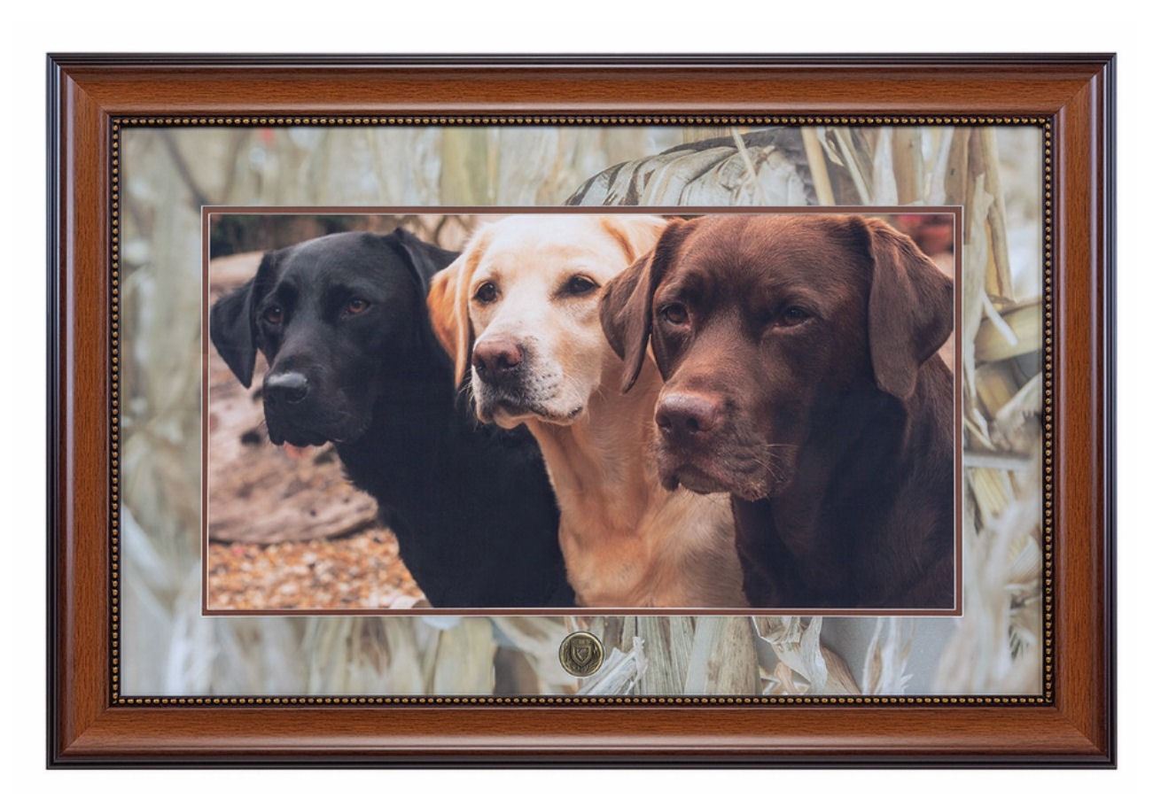 This framed and matted print highlights three adult labs. The image includes a DU crest medallion inlaid in the mat. Overall dimensions are 24”x36”.