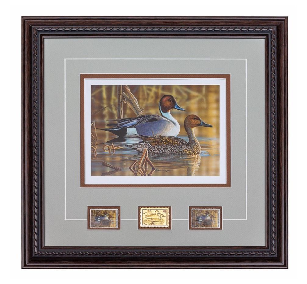 This pintail pair is highlighted by artist Richard Clifton as the 37th design in the DU Stamp Print collection. The piece is handsomely framed and double matted and includes the matched DU stamp print, stamp medallion, mint stamp, and artist signed stamp.