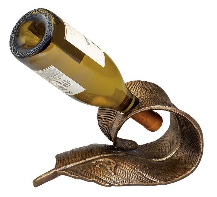 This cast aluminum wine bottle holder is in the shape of a mallard drake tail feather. It holds a single bottle of wine for a beautiful display on any bar or table. The wine holder is painted in an antique brass finish and features a raised DU logo near the quill.