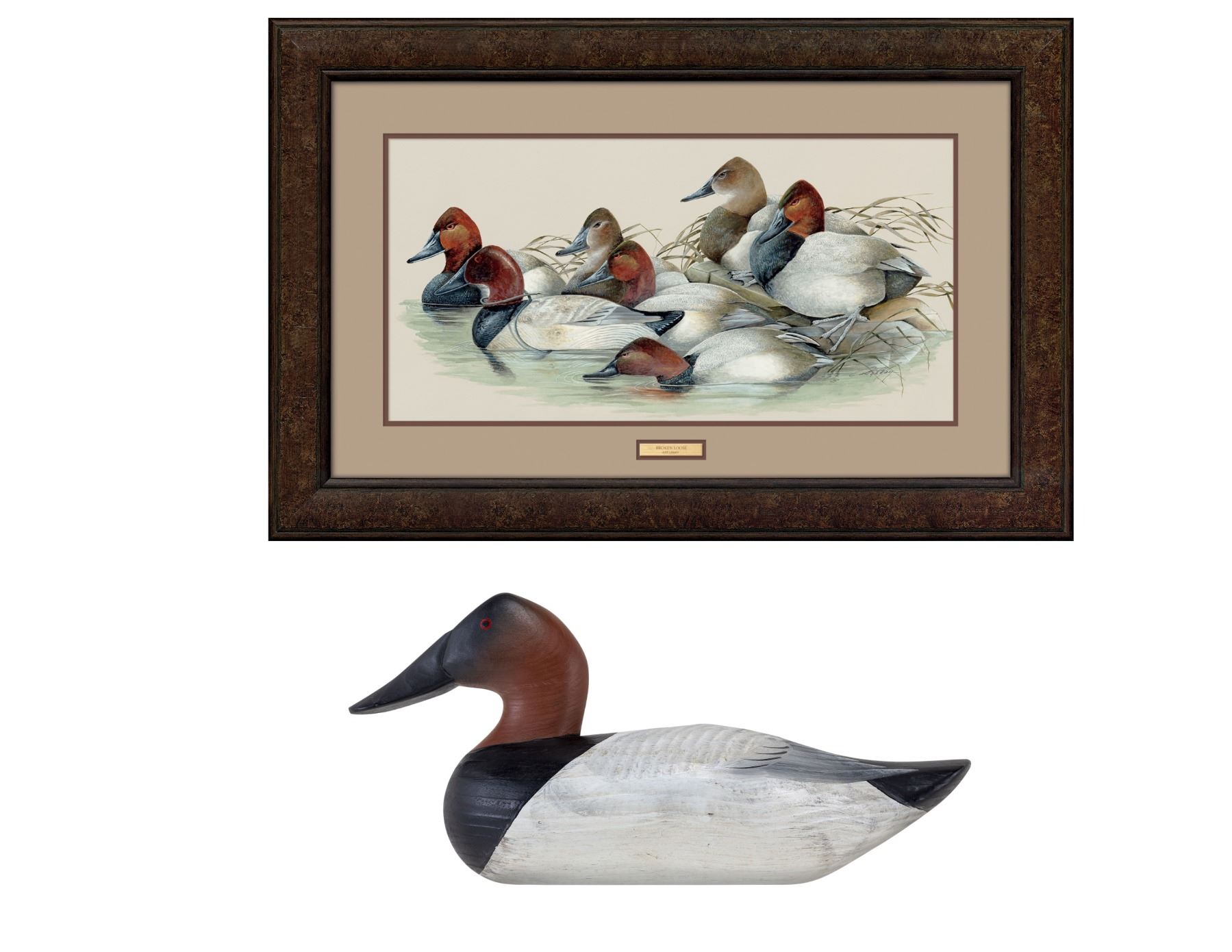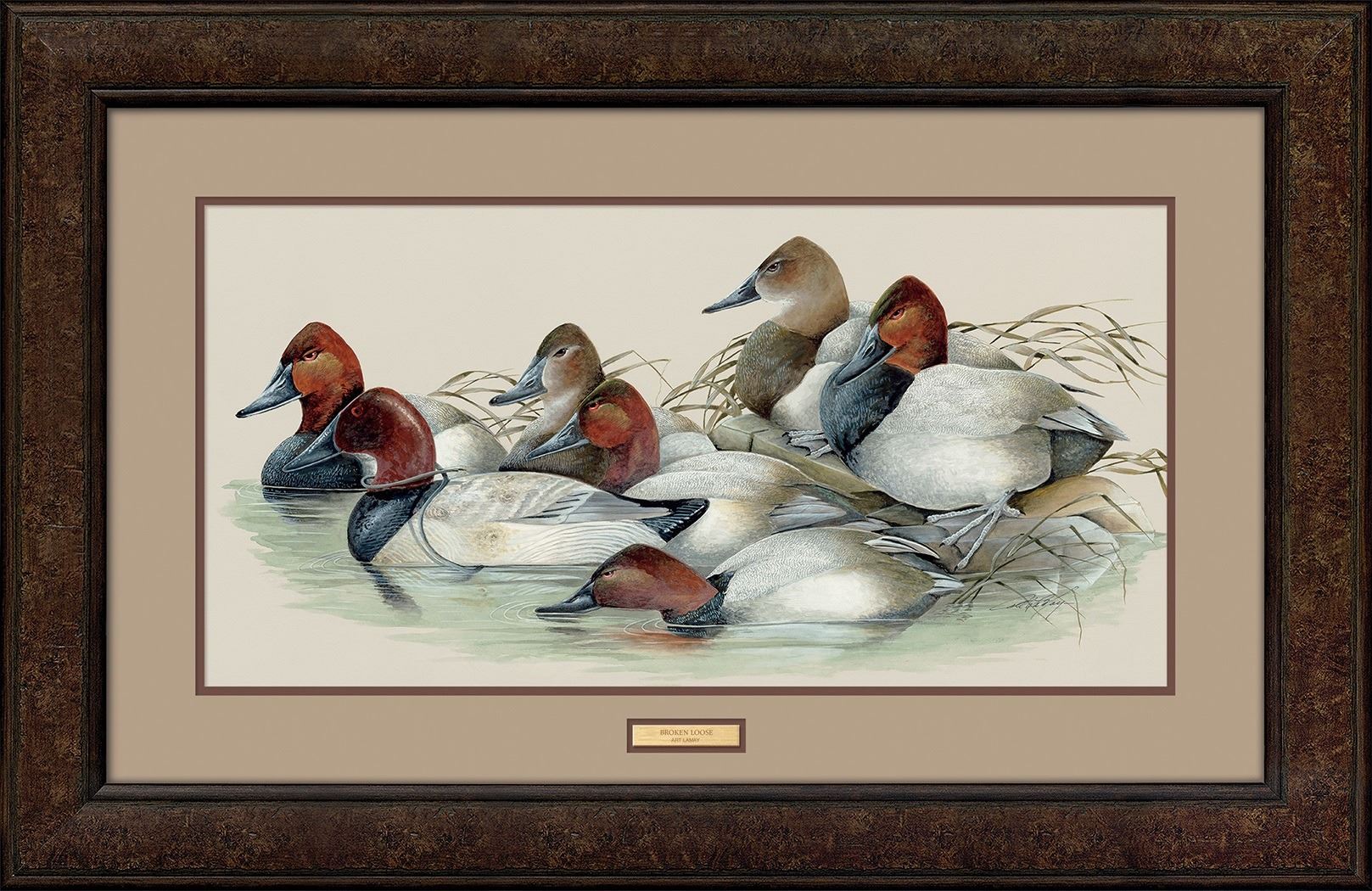 Art LaMay and Charles Jobes have collaborated to create an exclusive print and decoy set for Ducks Unlimited events. The signed and matched number edition is limited to 250 sets. The “Broken Loose” lithograph print by Art LaMay features canvasbacks in the water with a decoy imposter. Each 13½” x 27” print is framed and double matted and includes a title plate. The wooden canvasback decoy by Charles Jobes is hand carved and hand painted in fine detail. The life-size antique style decoy features a raised grain texture and buffed wax finish. Its likeness is represented in the “Broken Loose” image.