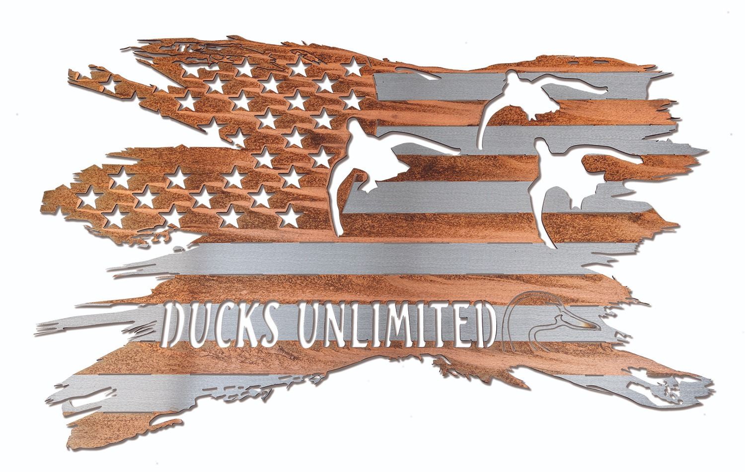 This 23”x36” metal American flag includes a laser cut Ducks Unlimited logo with cutouts of cupped mallards and stars. The sign features a distressed stainless and copper patina finish. Proudly made in the USA.
