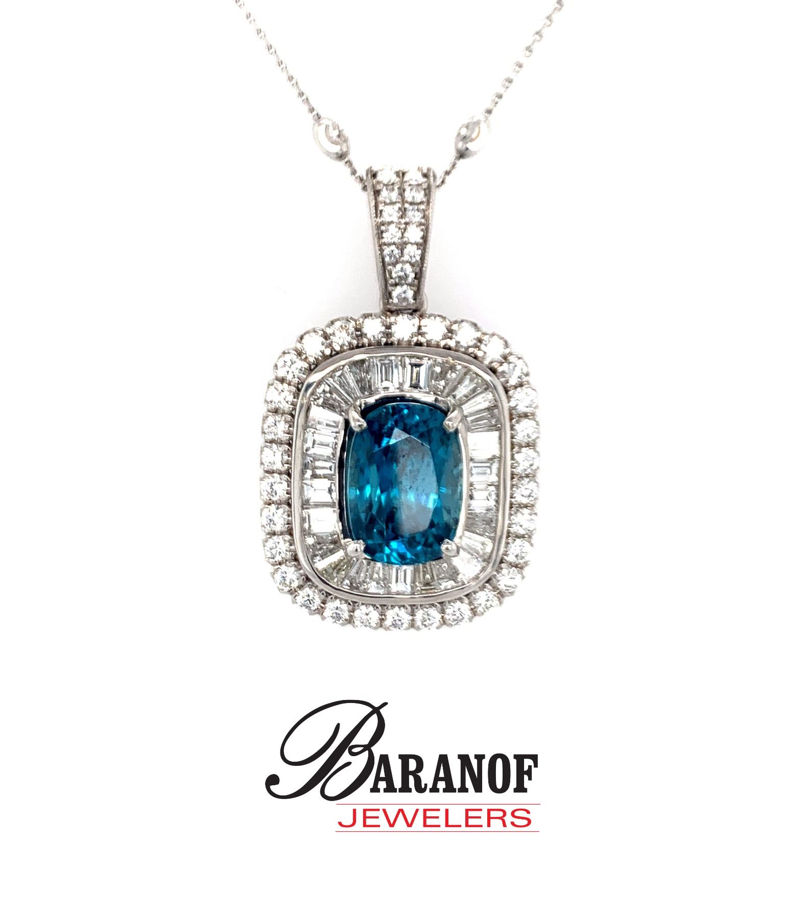 DONATION: Natural blue zircon and diamond pendant set in 14 karat white gold, with round brilliant cut diamonds. This blue zircon is vivid in color and is 10.00 carats with 0.90 carats of round brilliant cut diamonds and 1.25 carats in Baguettes which are F in color and Vs1 in clarity.