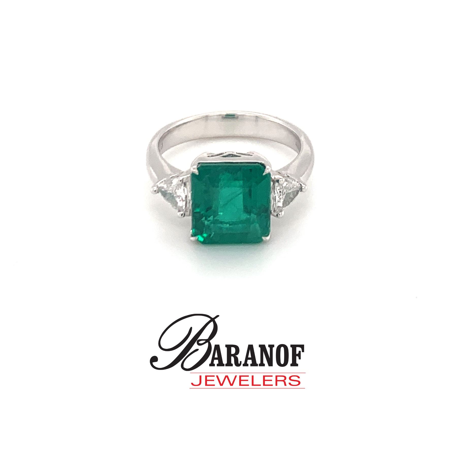 DONATION: Gorgeous natural Colombian emerald ring set in 18 karat white gold. Set with two trillion cut diamonds, emerald is 4.06 carats and bluish-green in color. Diamonds are 0.40 carats total weight and are F color Vs1 in clarity.