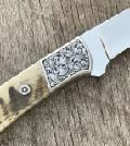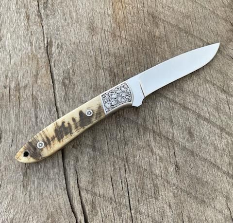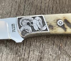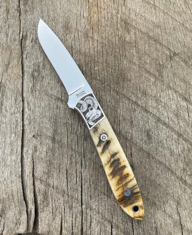 D.E. FRIEDLY 4 1/2" DROP POINT HUNTER KNIFE WITH WY BIGHORN SHEEP SCALES HANDLE