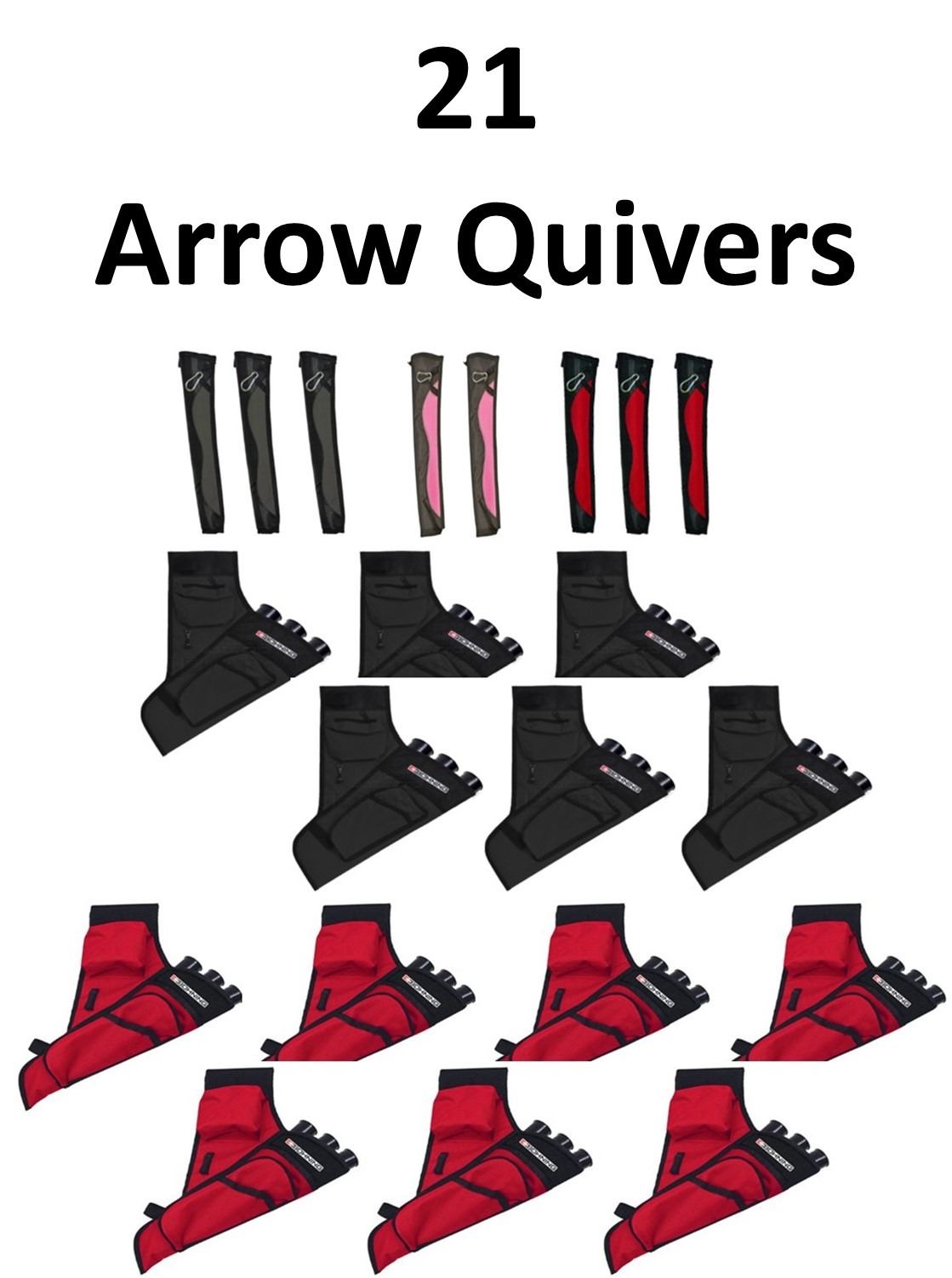 21 x Bohning Quivers, 8 x Tube Youth, 3-Grey, 2-Hot Pink, 3-Red, 13 x Mini Quivers, 6-Black RH, 7-Red RH