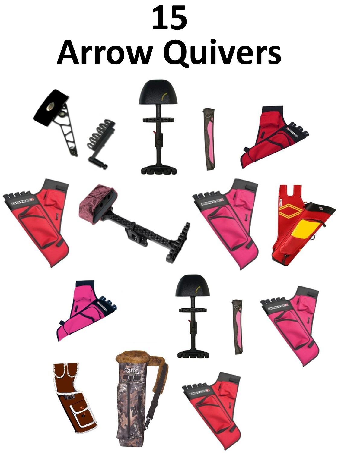 15 x Arrow Quivers, 1-Mathews T5 Black LH, 2-Kwikee Kwiver 4 Arrow Combo Black, 8 x Bohning, 2-Tube Youth Hot Pink, 1-Mini Target Red RH, 1-Bohning Mini Target Pink RH, 2-Target Hot Pink LH, 2-Target Red LH, 3 x Vista, 1-Rascal Brown RH, 1-MaverickII Back, 1-Red w/Yellow, 1 x Alpine 5 Arrow Pink