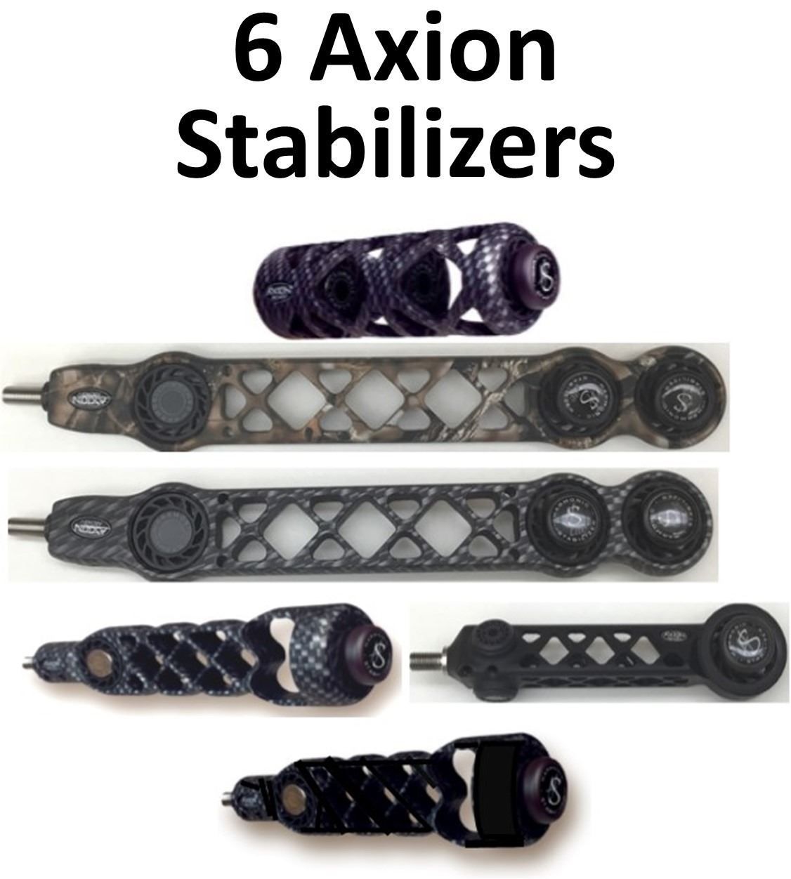6 x Axion Stabilizers, GLZ5 5" Tact, 2 x GLZ 11" Lite 3-D Hunter Grid, 1-Lost, 1-Tact, Matrix Lite Grid 6" Tact, Triad Grid 6" Black, Matrix Lite Grid 6" Black