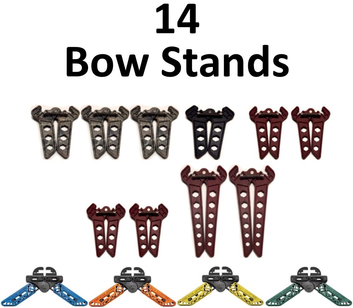 14 x Bow Stands, 10 x OMP, 3-Parallel AP, 1-Single Black, 1-Parallel Red, 1-Mathews Red, 2-Red Long, 1-Blue, 3 x Pine Ridge, 1-Orange, 1-Yellow, 1-Forest Green, 1 x Gas Pro Black/Pink