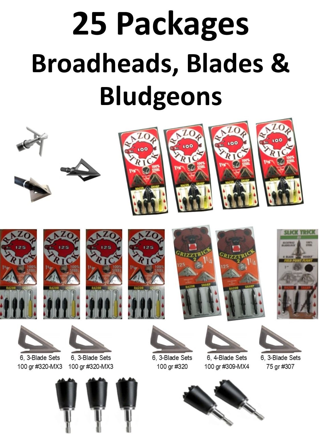 20 x Broadheads & 5 x Bludgeons, 1-Reign 100 Gr, 1-Sonic Head 125 Gr, 1-Sonic Pro 125 Gr, 1-Montec Pre Season 85 Gr, 11 x Slick Trick, 4-Razor 100 Gr, 4-Razor 125 Gr, 2-Grizz 125 Gr, Slick 85 Gr, 5 x Muzzy Replacement Blades 2-MX3-3, 1-MZ-320, 1-MX4-3, 1-MZ-307, 5 x Bludgeons, 3-125Gr, 2-85Gr