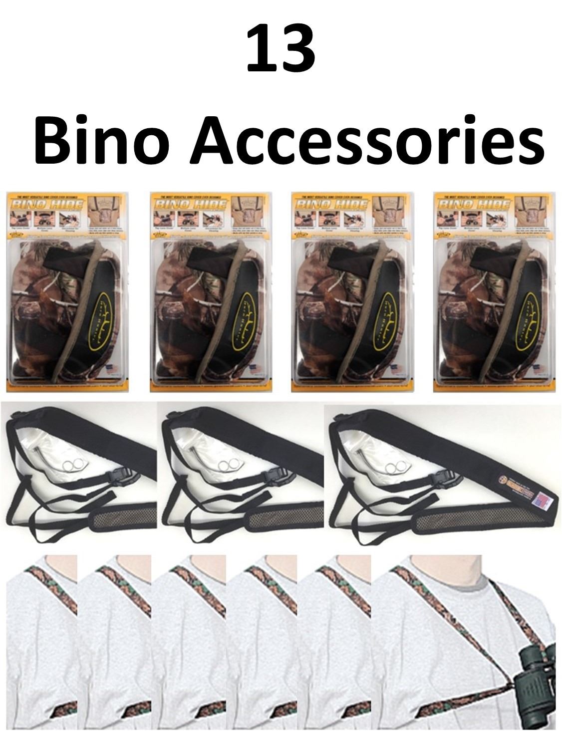 13 Bino Accessories, 4-Bino Hide Roof Horn Hunter Medium Camo, 3-3-D Bino Sling, 6-Bino Toters