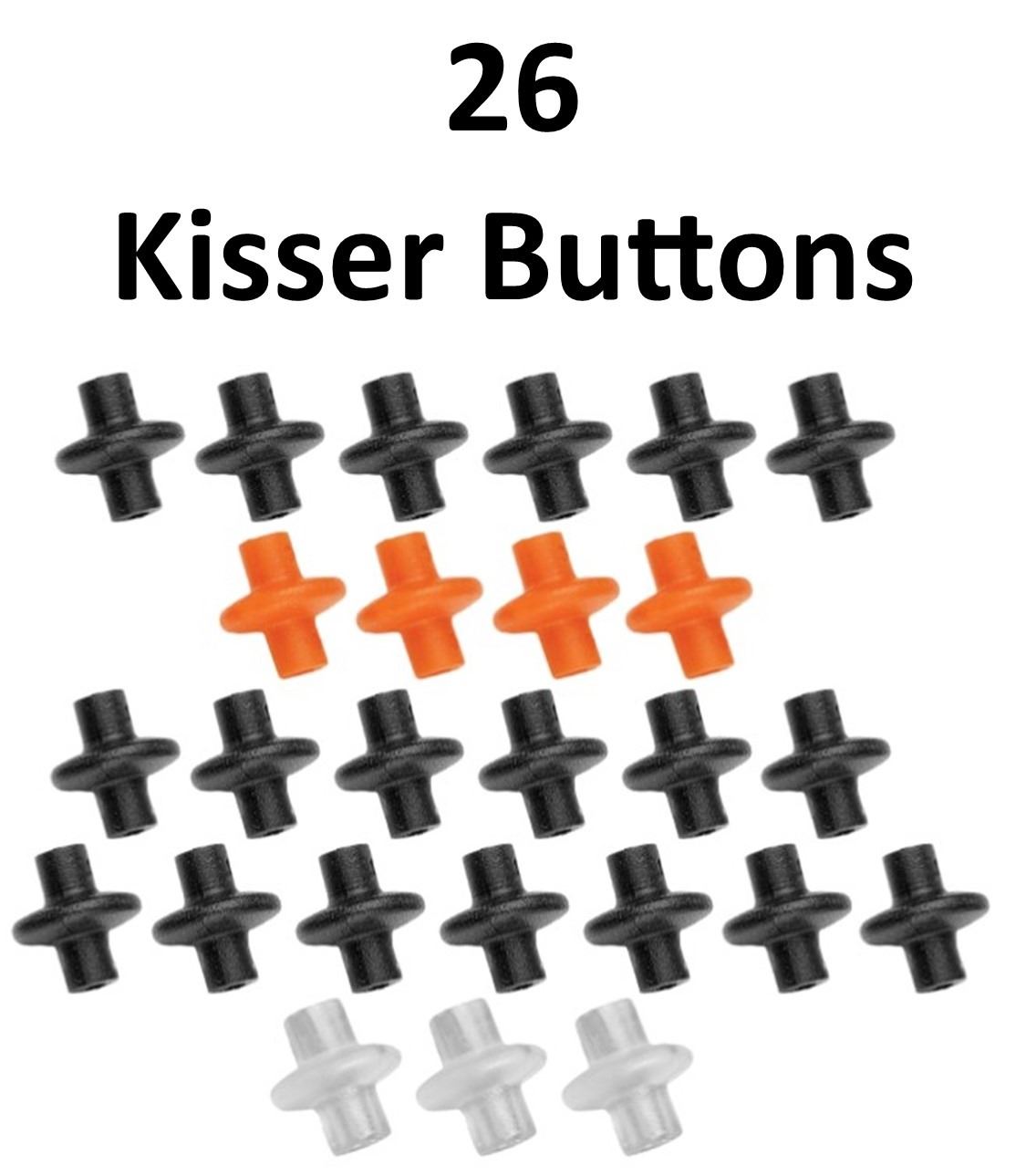 26 x Kisser Buttons, 12 x Saunders, 6-16 -18 Standard, 6-12-14 strand Kiss X, 14 x Pineridge Slotted, 4-Orange, 7-Black, 3-Clear