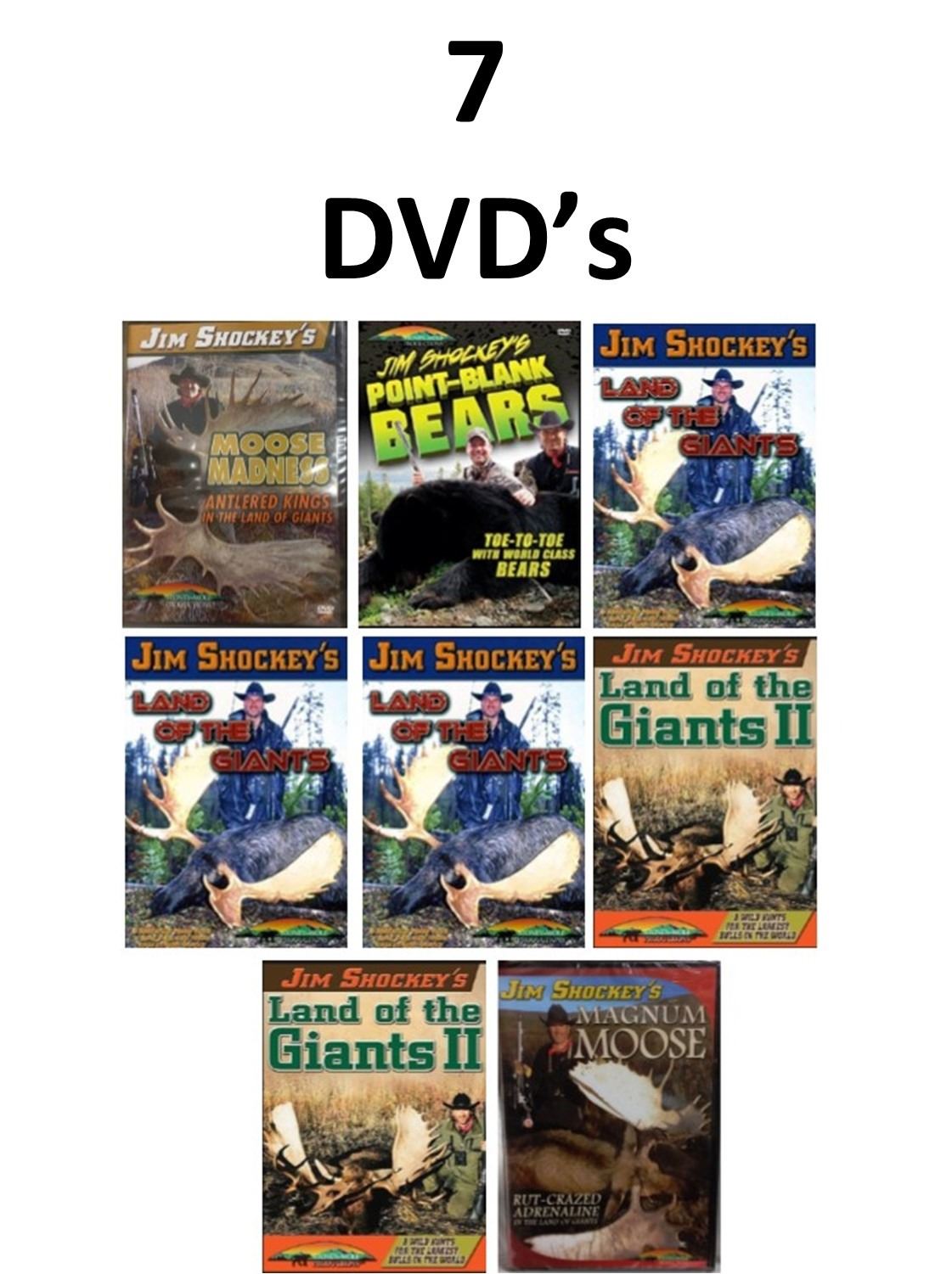 8 DVD's, Moose Madness, Point-Blank Bears, 3 - Jim Shockey's Land of The Giants, 2 - Jim Shockey's Land Of The Giants II, Magnum Moose