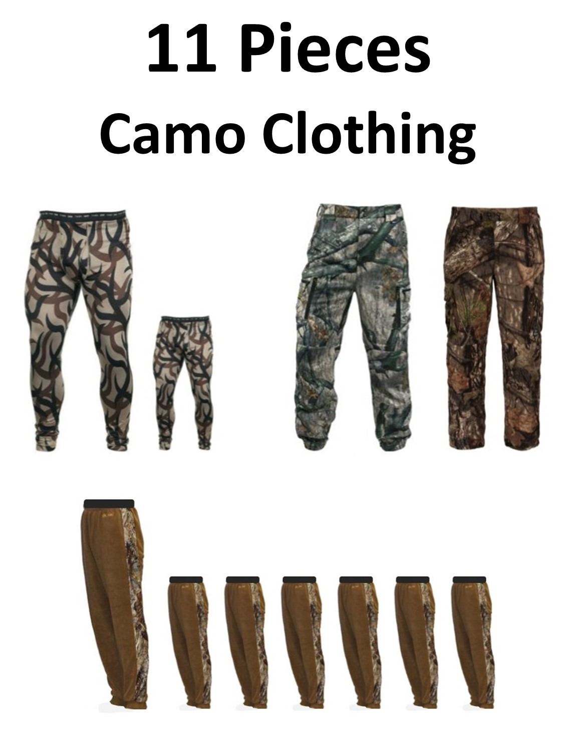 4 x Camo Hunting Clothing, 2 x ASAT Elite Basic Layer Bottom, 1-XXL, 1-XXXL, 1-Dream Season XLT Pant 2XL, 1-Road Trips Fleece Pant Large AP XXL, 7 x Gamehide Base Layers AP HD, 3-XL, 4-L