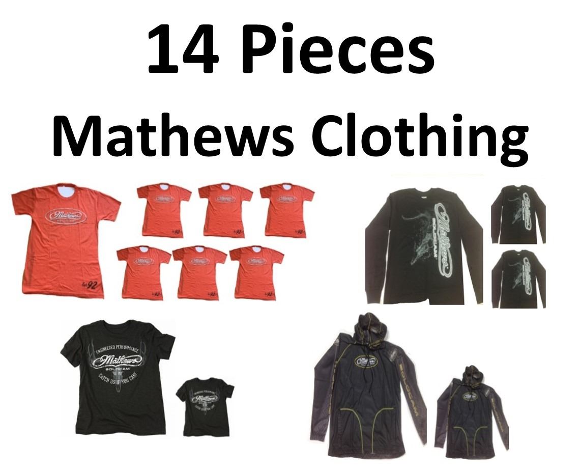 14 x Mathews Clothing, 7 x Blaze Orange Shirts, 1-2XL, 4-XL, 2-L, 3 x LS Black/Grey L, 2 x Outfitter Shirts, 1-XL, 1-2XL, 2 x Performance Hoodie, 1-L, 1-XL