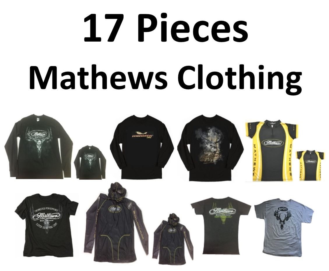 10 x Mathews Clothing, 3 x Black/White Skull, 1-L, 2-M, 3 x Short Shed Hunter Blue, 1-M, 1- L, 1-XL, 1 x Charcoal Neon Green M, 1 x Scout 2XL, 2 x Performance Hoodie, 1-L, 1-XL