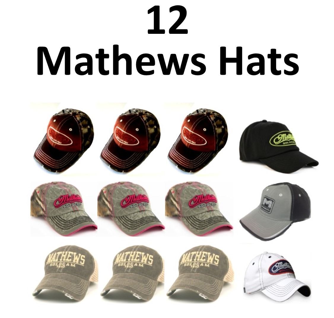 12 x Mathews Hats, 3-Food Plot Rust/Camo, 3-Ladies Fox Pink/Camo, 3-Shed Hunter Tan/Brown, 1-Fitted Neon L/XL, 1-Black/Grey Block, 1-Patriot Cap